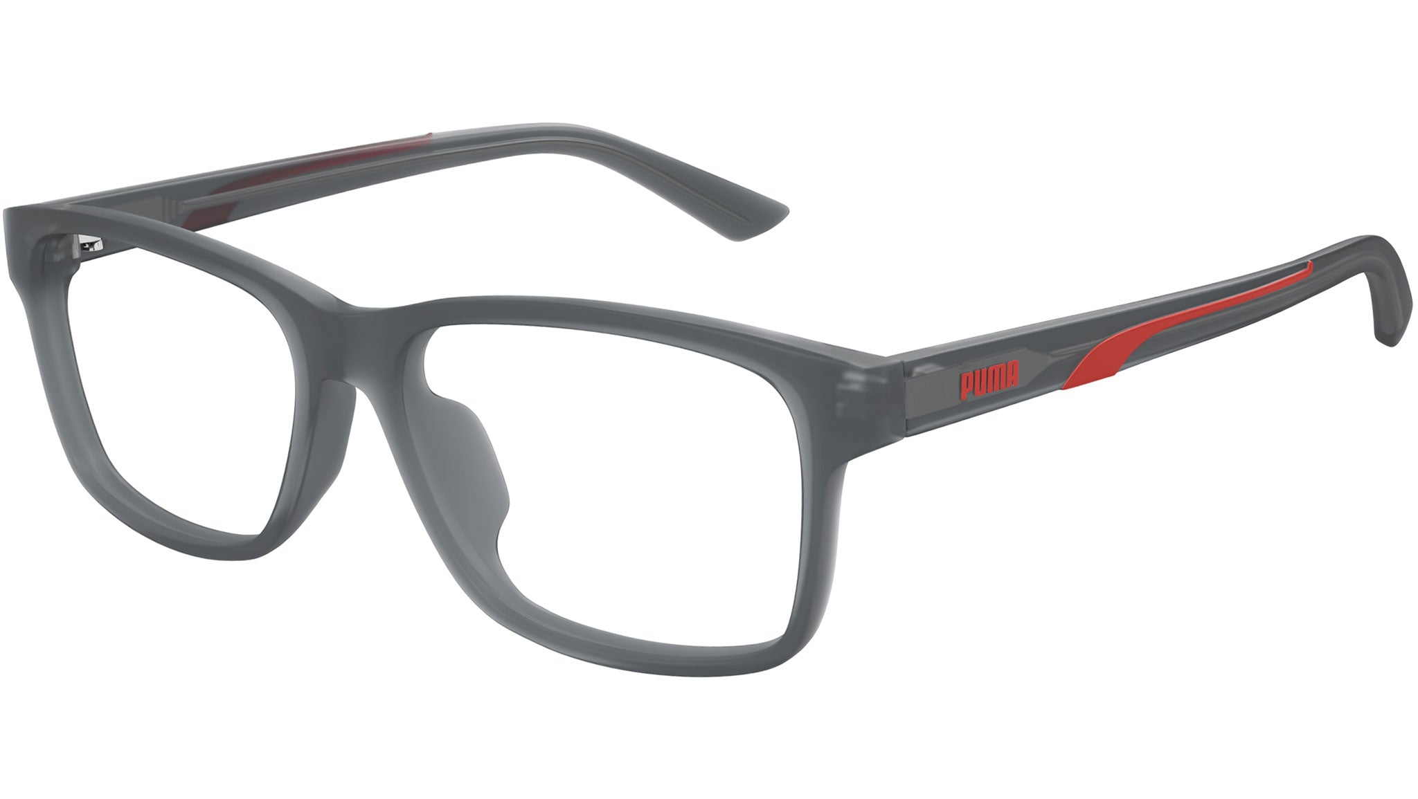 Puma Essential eyeglasses model PU0475OA color variant 003 matt transparent gray with demo lenses. Authorized Puma online dealer. The glasses are delivered with original case and accessories and are covered by the official 12-month manufacturer's warranty.