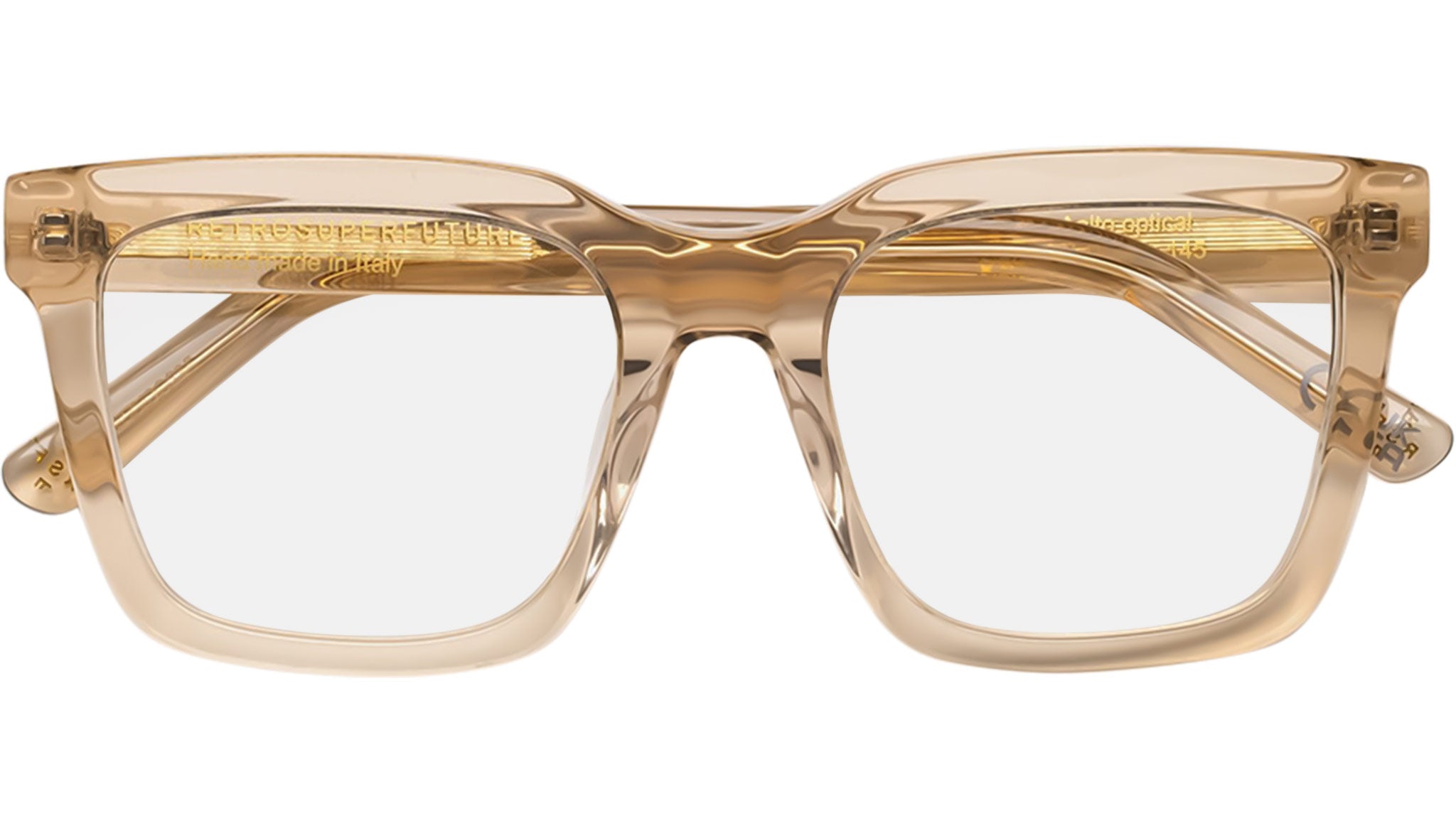 Aalto Optical is a tall, oversized acetate optical frame, designed for an all day everyday use. The model features sturdy rims and square lenses, with a lowered nose bridge and curved upper line. Its determined frame has been chiseled on the sides for a lightweight yet sturdy fit. This version comes in a light resin colored crystal acetate . Prescription lenses not included. Sizes: R. Lens Width: 52 mm. Frame Front: . Frame Side: 145 mm. . Product Code Size R: . Product code: GQZ