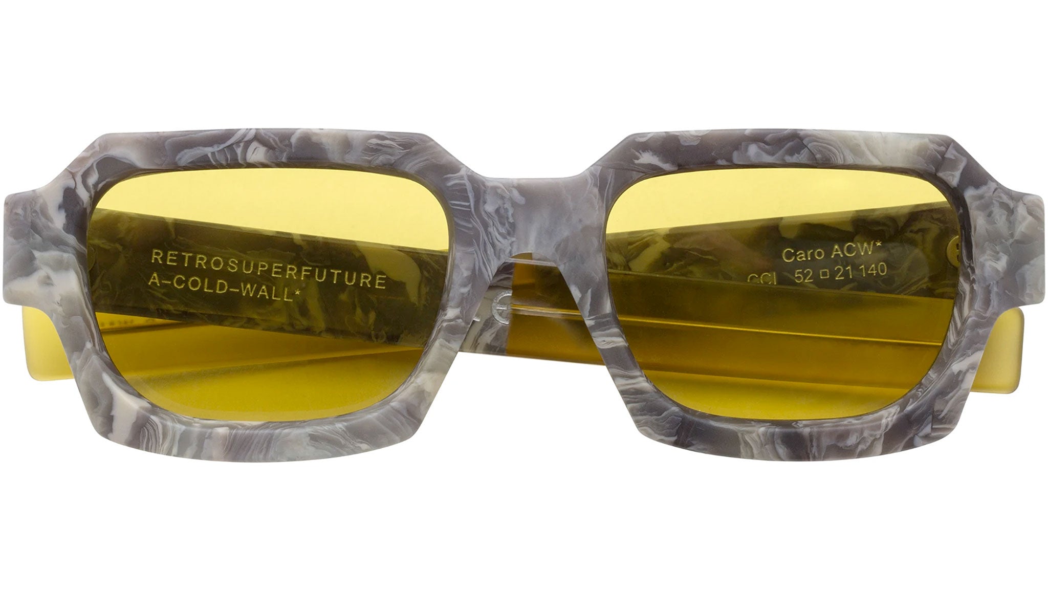 Designed in collaboration with the cult British brand A Cold Wall, this model is a cutting-edge interpretation of brutalist design aesthetics. Based on RSF's signature Dear silhouette, the model's geometric features were thickened for a sharp, angular design. This version features a pebble concrete-like acetate matched with a crystal blue acetate and tinted blue lenses.