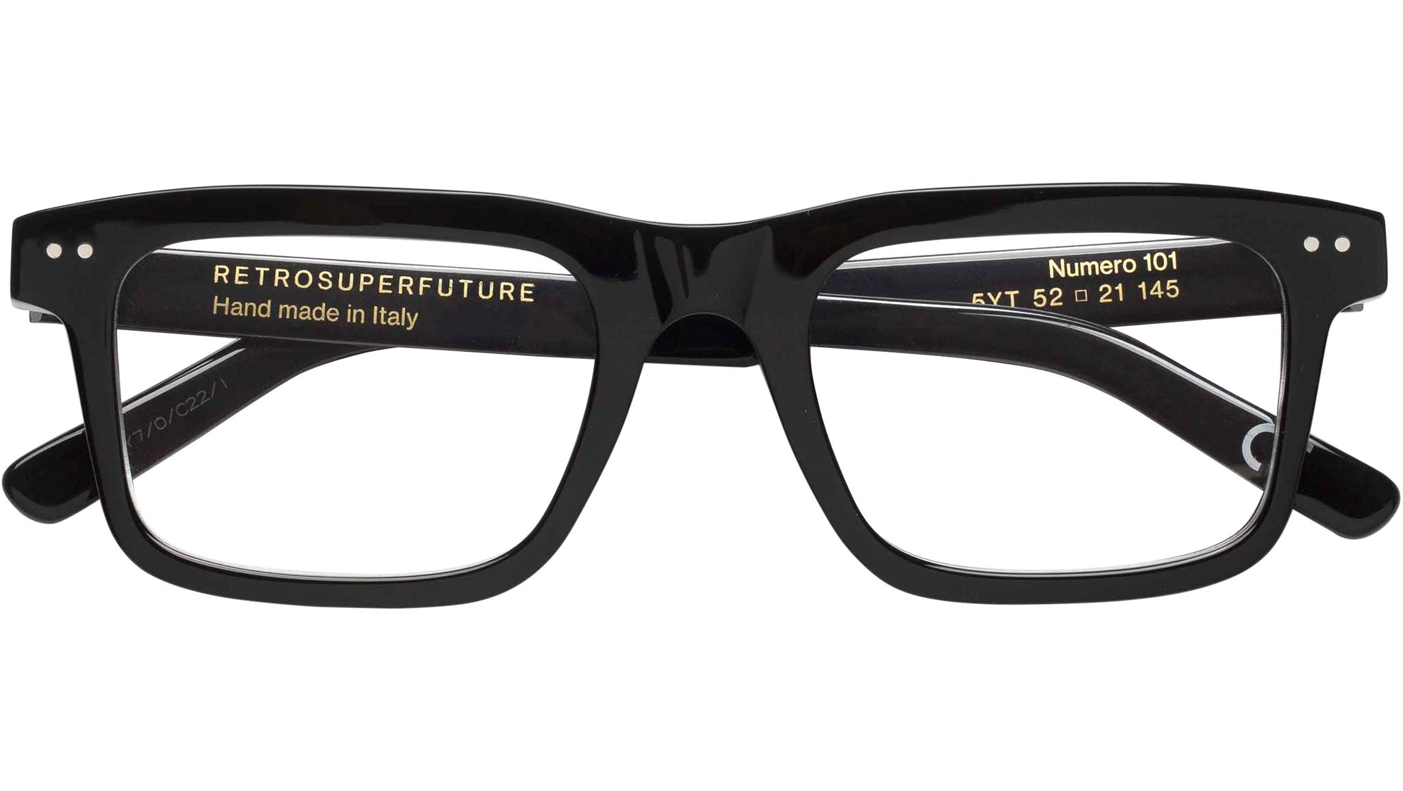 Numero 101 by Retrosuperfuture is an essential angular silhouette that remixes classic geometric frames from the 1950s in a contemporary language. With its thick nose-bridge and marked brow-line, this model captures the sharp, hard-edged aesthetics of mid-century design, adapting it for more fluid contemporary use. Numero 101 is unobtrusive and lightweight for an all-day-everyday use, while underlining a marked stylistic vision. This version comes in a shiny black acetate. Sizes: R Lens Width: 52 mm. Frame Front: Frame Side: 145 mm. Product Code Size R: 5Y7