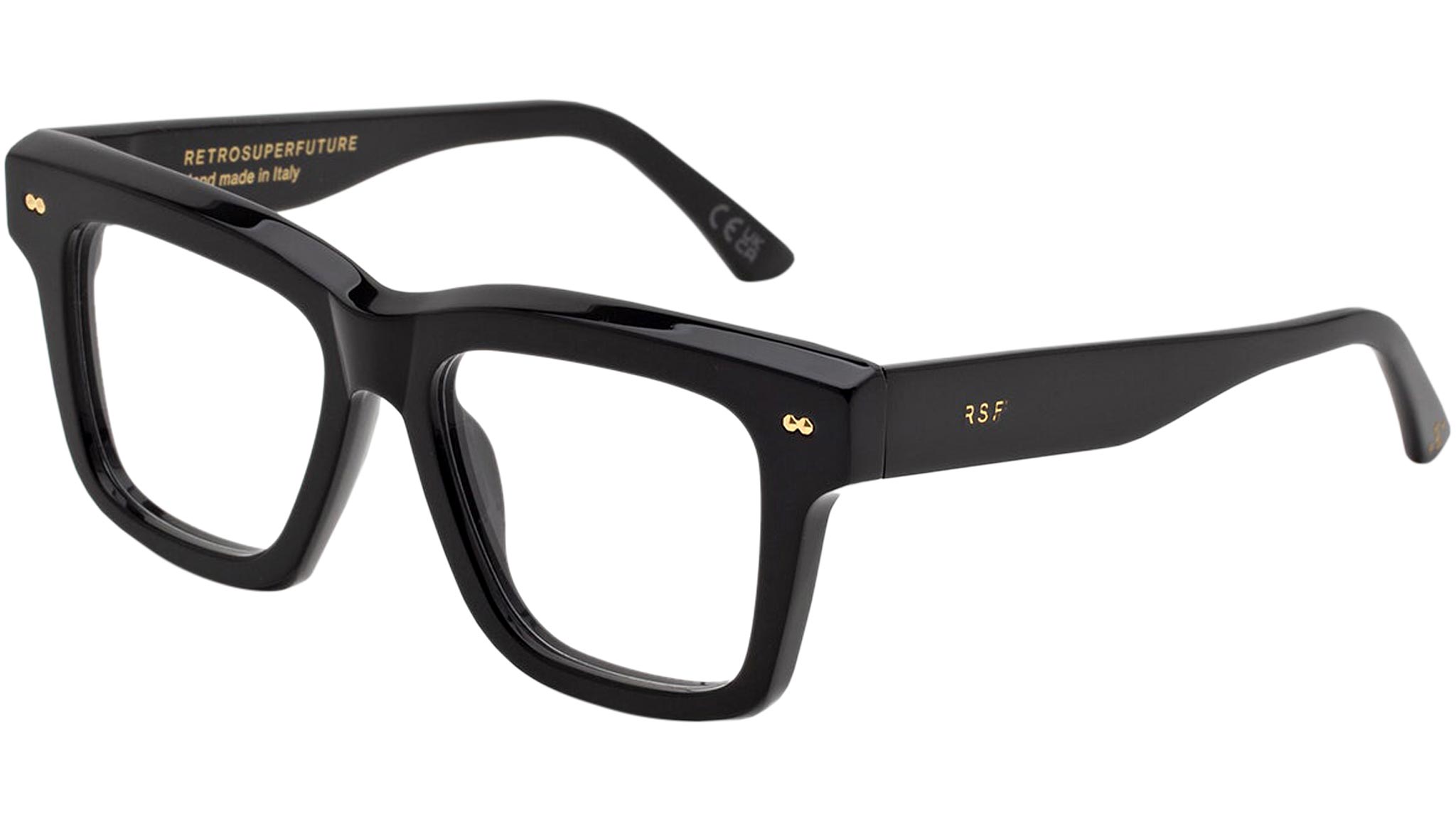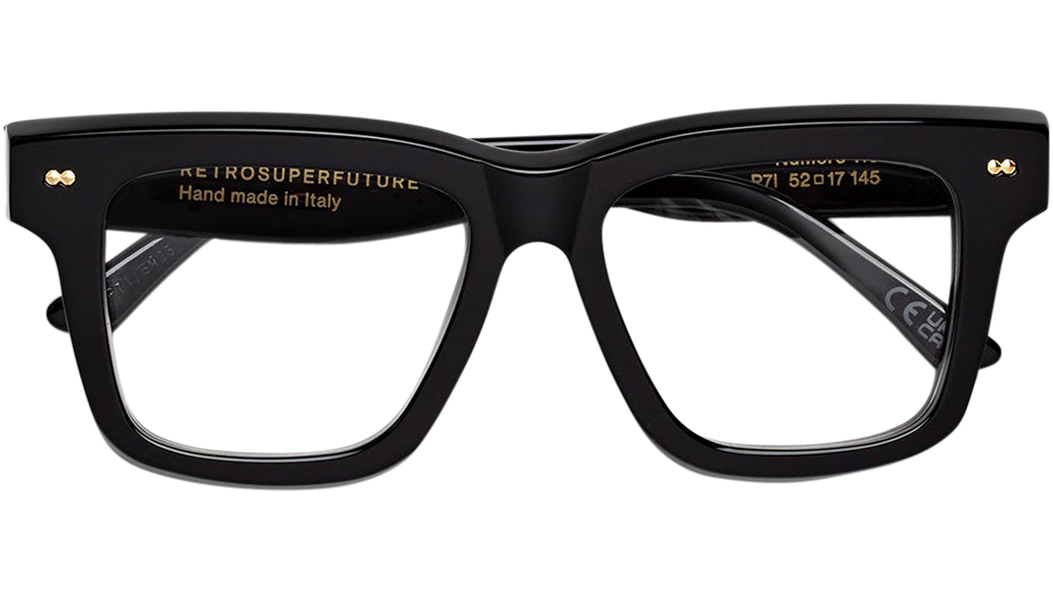 Numero 116 by Retrosuperfuture is a bold Optical frame characterized by an oversized design that reinterprets iconic sun shapes for everyday use. The model features sturdy acetate rims, a key feature of RSF eyewear, chiseled for lightness and comfort, without compromising its thick build. This is a model designed for those looking for a statement yet timeless piece of eyewear. This version comes in a timeless black acetate. Sizes: R Lens Width: 51 mm. Frame Front: Frame Side: 145 mm. Product Code Size R: P7I
