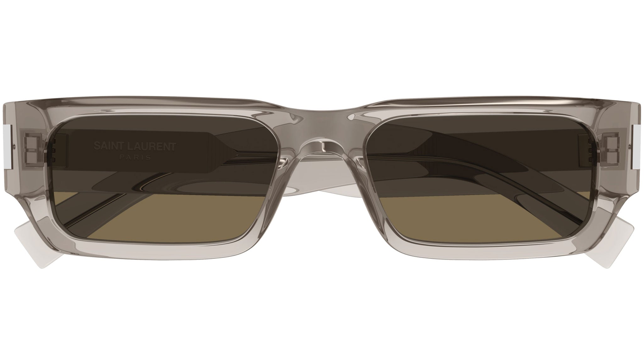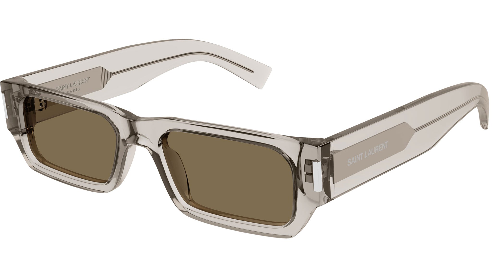 Saint Laurent sunglasses model SL 660 New Wave line color code 004 transparent beige shiny recycled acetate rectangle shape with solid brown lenses.