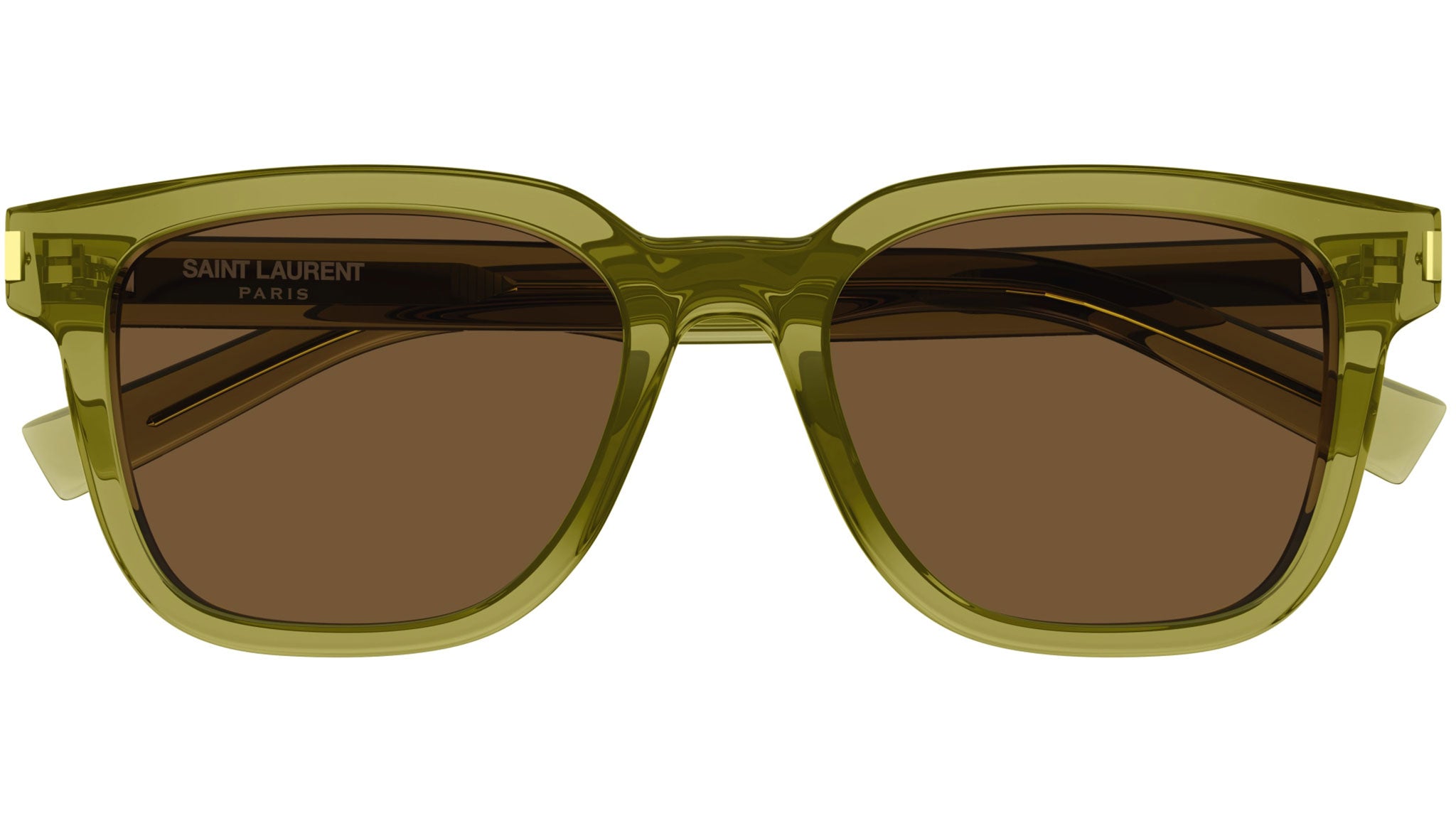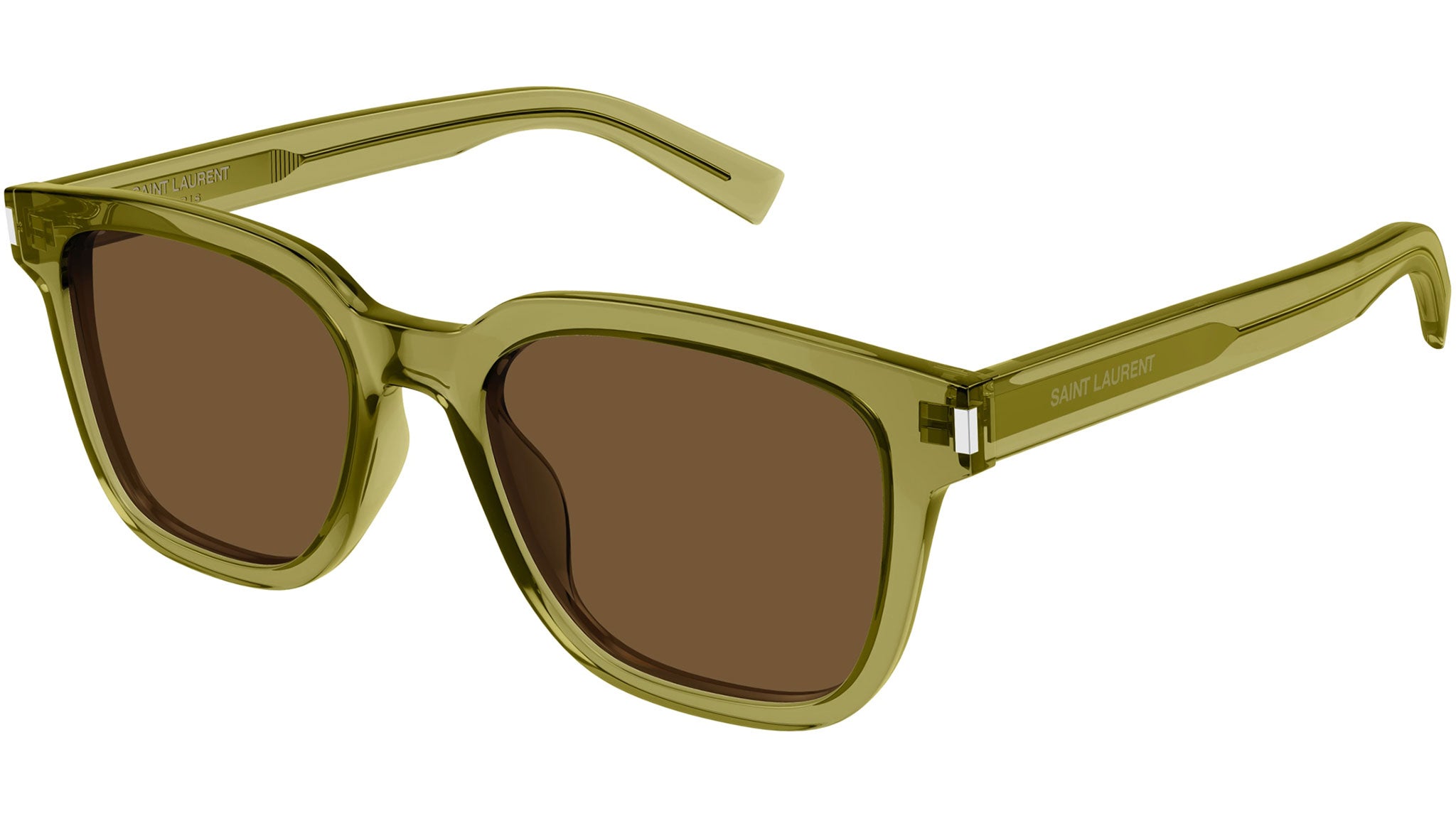 Saint Laurent sunglasses model SL 711 Corner Angle line in recycled acetate rectangular shape color code 005 transparent acid green with solid brown lenses. Authorized Saint Laurent online dealer. The glasses are delivered with original case and accessories and are covered by the official 12-month manufacturer's warranty.