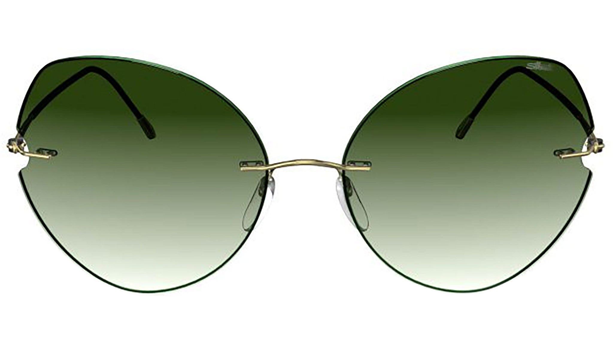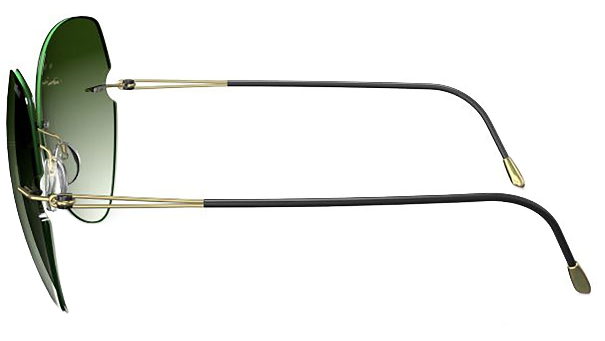 Silhouette Rimless Shades 8182 in 8540 frame color featuring classic green gradient lenses. The Rimless Shades Collection fuses the simplicity of ultra-thin titanium and the dynamism of oversized lenses highlighted by bold colors. Its sensual curves and lens-to-temple cut-outs deliver a sense of luxury and femininity. The Fisher Island model, with its distinctive butterfly shape, represents modern chic at its most subtly refined. These glasses prioritize comfort and lightness, maintaining a screwless, hypoallergenic design, with a base 6 curvature, and have been recognized with a design award. The high-impact polycarbonate lenses, which can be adapted to prescription needs after retailer consultation, provide comprehensive UV A, B, and C protection, equivalent to UV 400, and have an anti-reflective coating on the backside. In a testament to the brand's precision and craftsmanship, Silhouette's frames and lenses work in perfect synergy, ensuring an optimal visual experience. This handcrafted quality, intrinsic to Silhouette Vision Sensation®, is entirely made in Austria and extends to their sunglasses range.