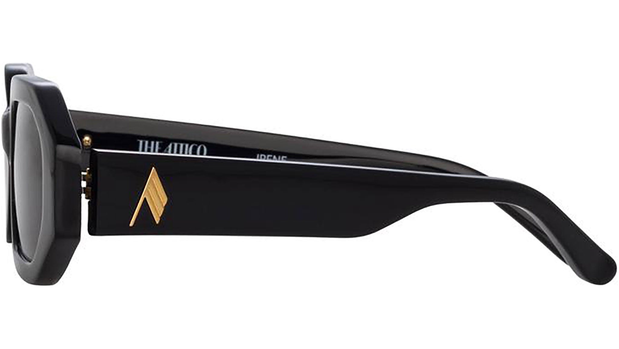 The newest addition to The Attico family, the Irene sunglasses bring the attitude of the Milan fashion house with them. Sculpted from recycled black acetate the angular hexagonal frames are highly polished to bring softness to their edge. The temples bear a gold monogram logo and the style is completed with solid gray lenses for 100% UV protection.