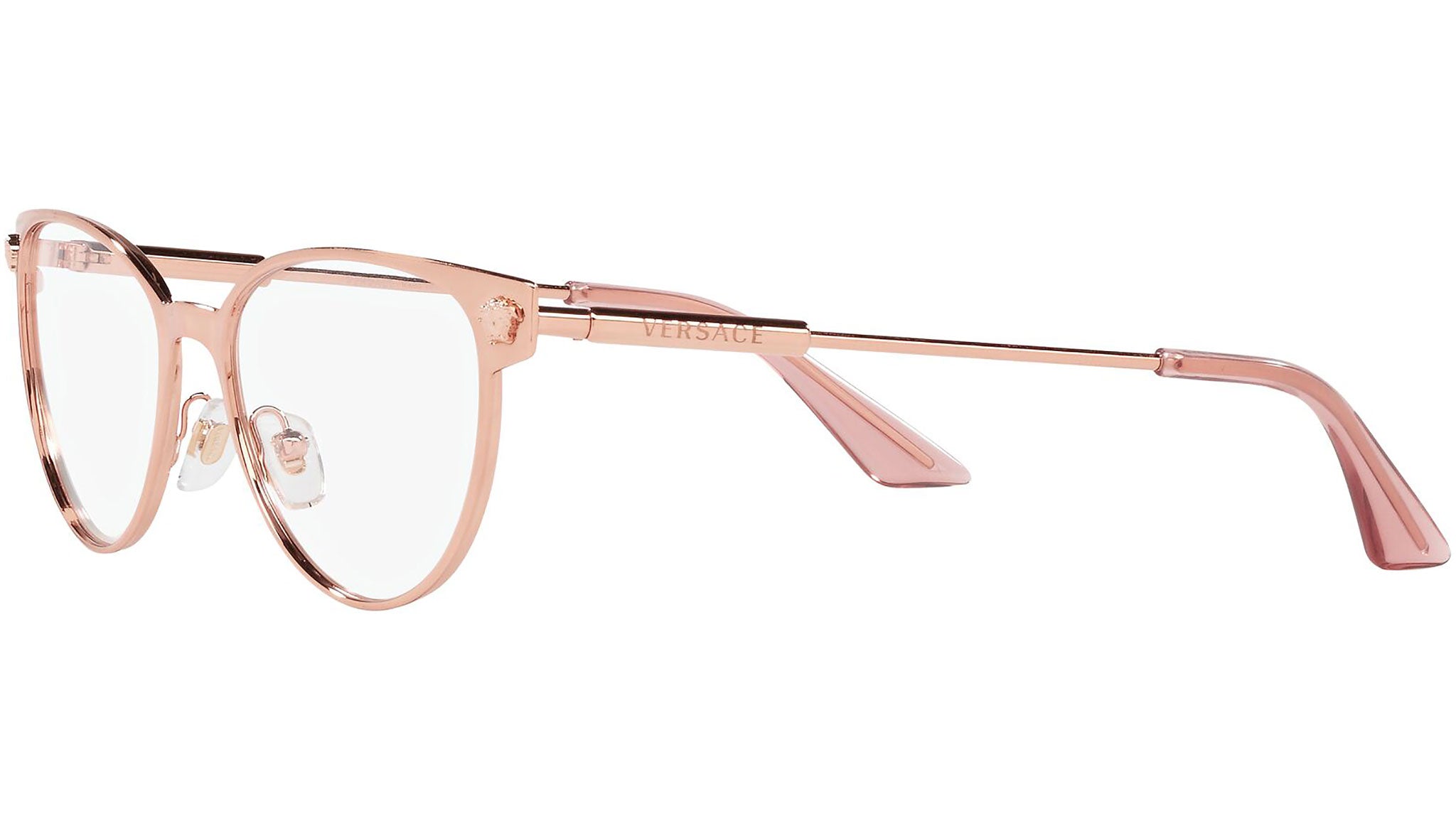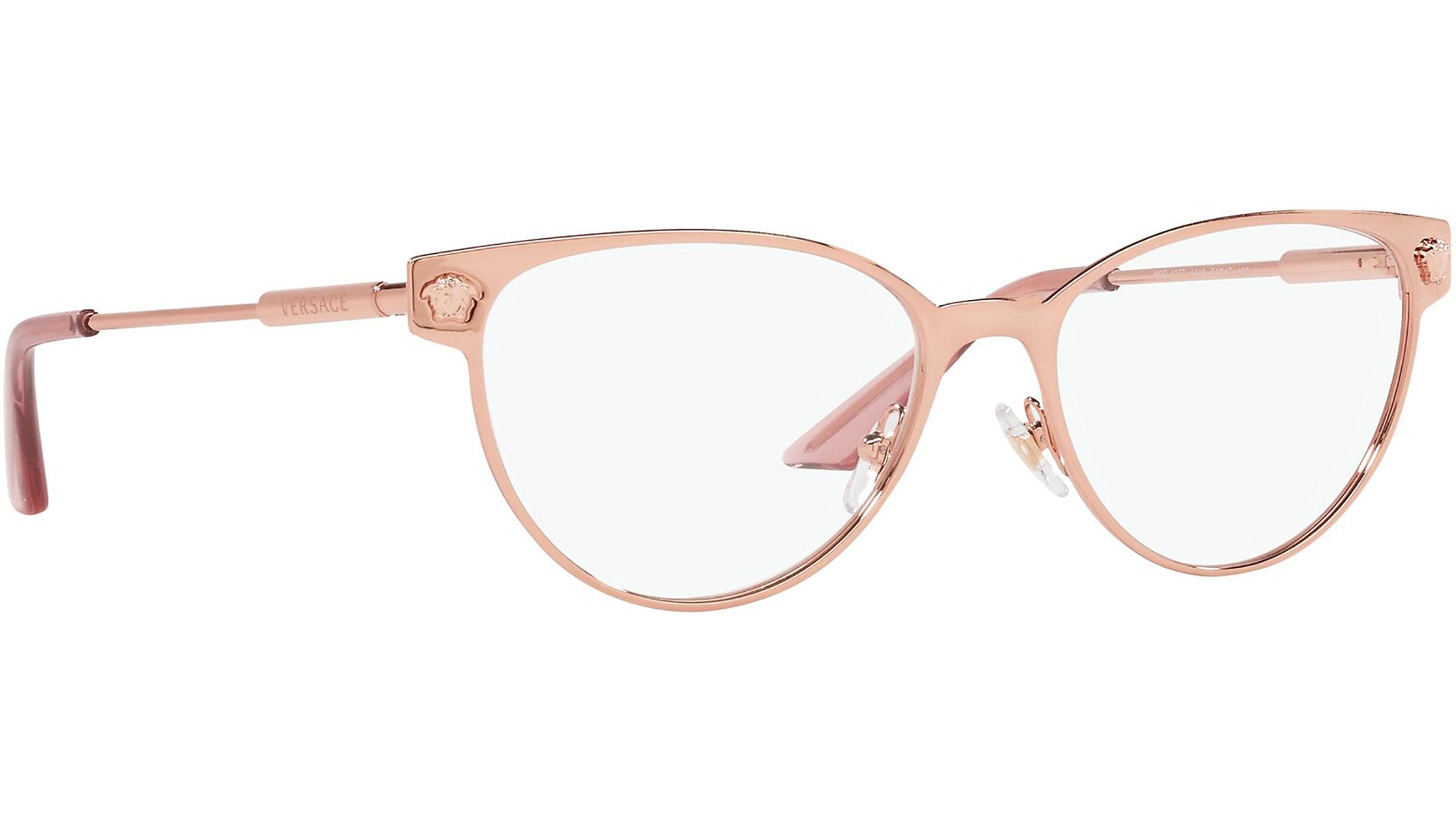 Versace eyeglasses model VE1277 color variant 1412 rose gold. Dedicated to those who want a contemporary, sexy, sophisticated style with a strong personality, Versace is one of the most iconic and famous high fashion and luxury houses in the world. The eyewear collection combines technical innovation and the essential style of the brand, and is strongly characterized by the decorative elements that have always distinguished the Maison.