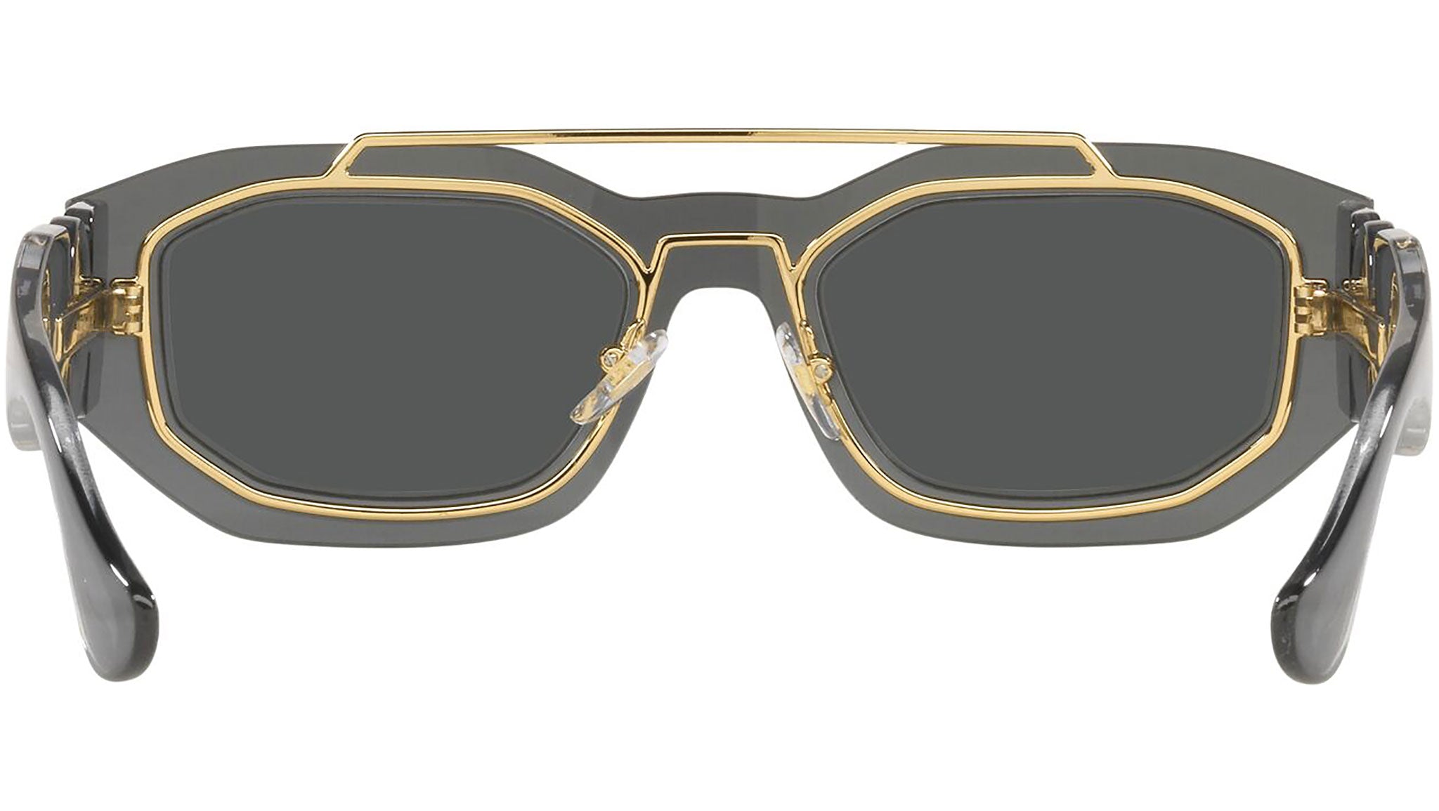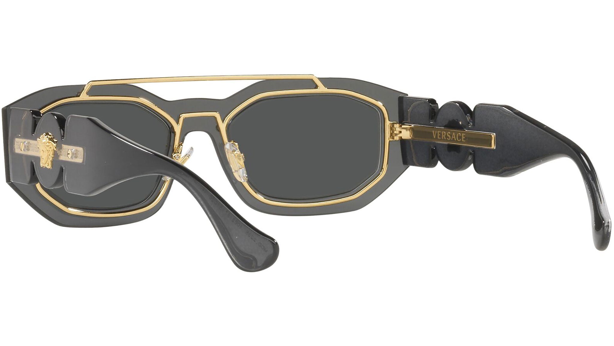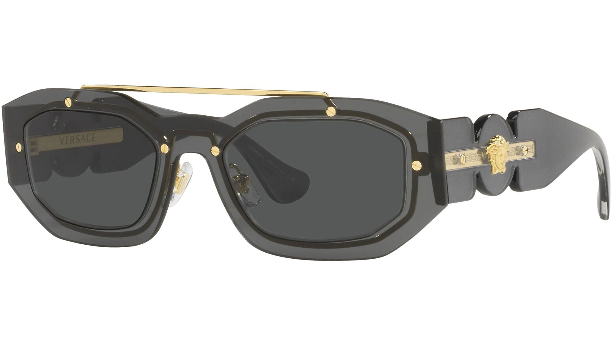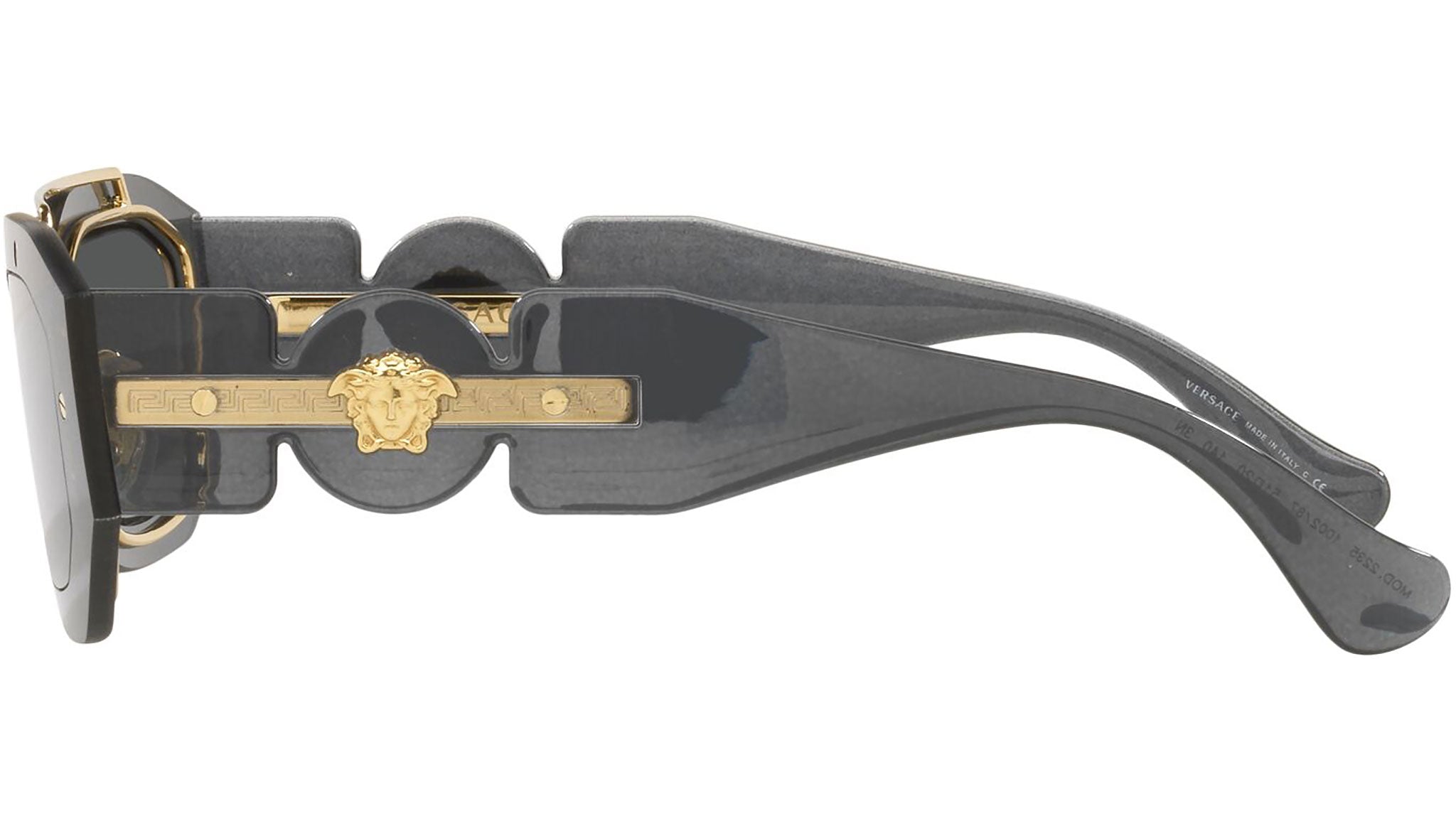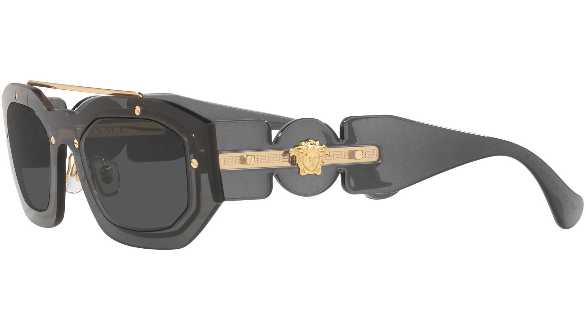 Versace sunglasses model VE2235 color code 100287 dark gray transparent with dark gray lenses. Dedicated to those who want a contemporary, sexy, sophisticated style with a strong personality, Versace is one of the most iconic and famous high fashion and luxury houses in the world. The sunglasses collection combines technical innovation and the essential style of the brand, and is strongly characterized by the decorative elements that have always distinguished the Maison.