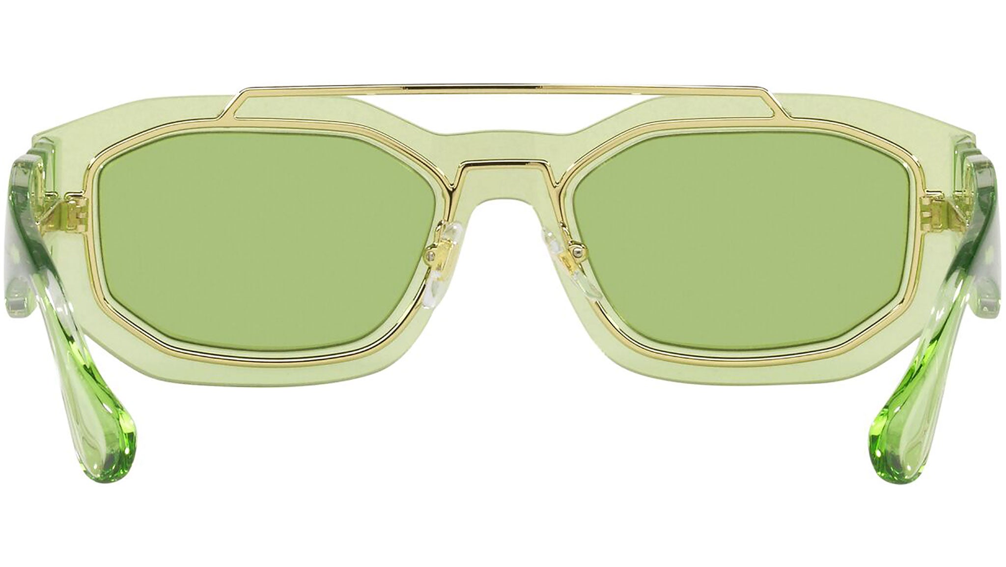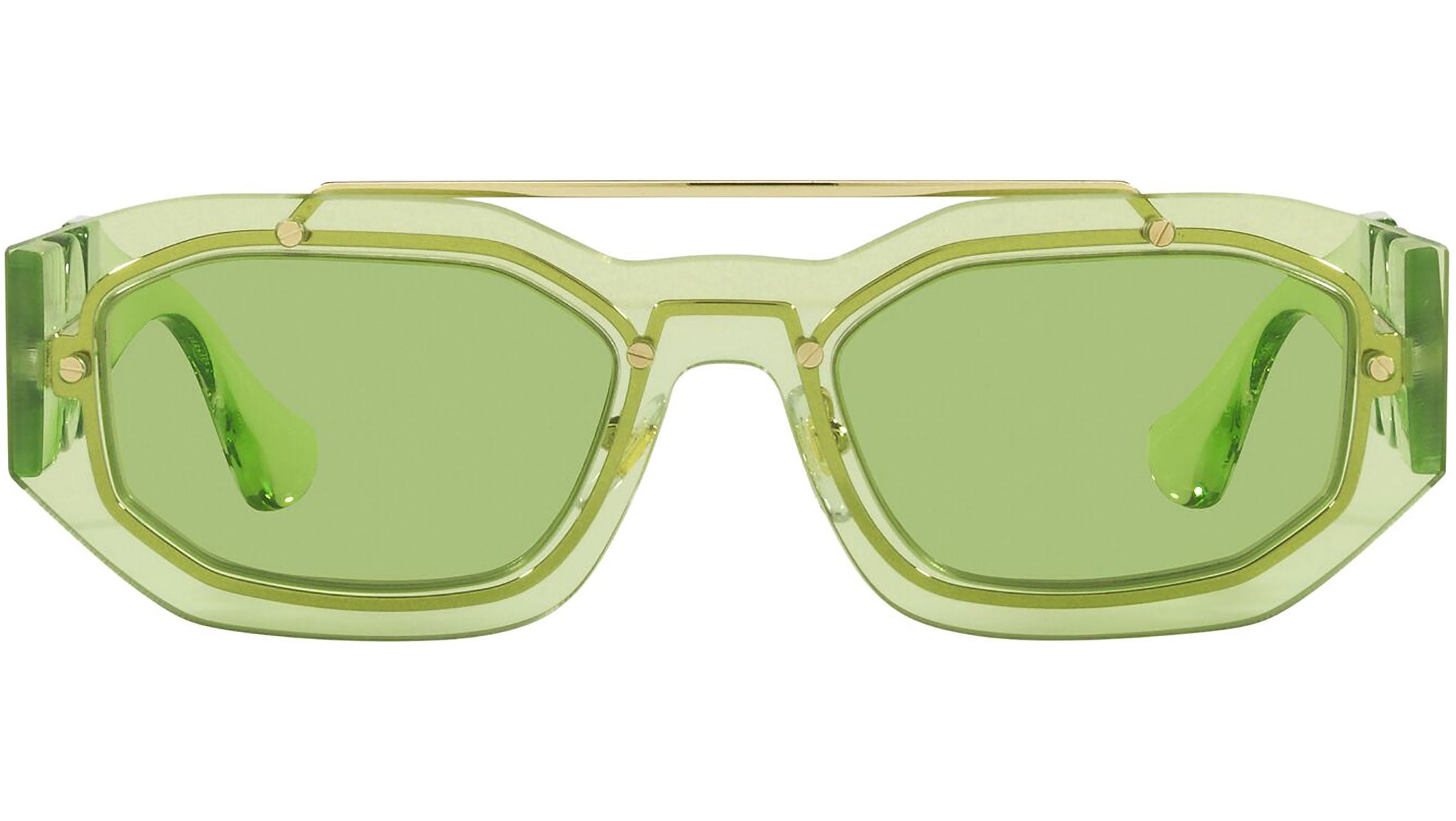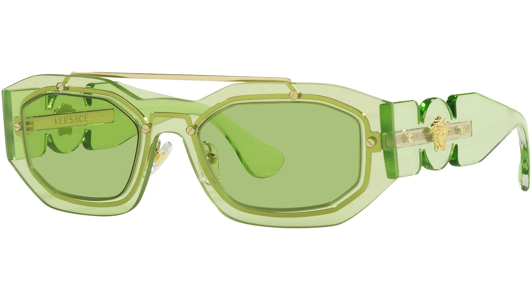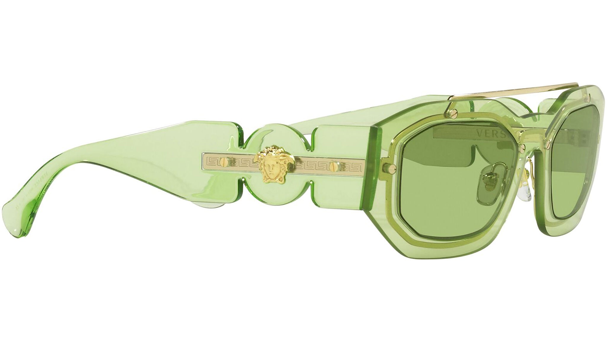 Versace sunglasses model VE2235 color code 1252/2 transparent light green with green lenses. Dedicated to those who want a contemporary, sexy, sophisticated style with a strong personality, Versace is one of the most iconic and famous high fashion and luxury houses in the world. The sunglasses collection combines technical innovation and the essential style of the brand, and is strongly characterized by the decorative elements that have always distinguished the Maison.