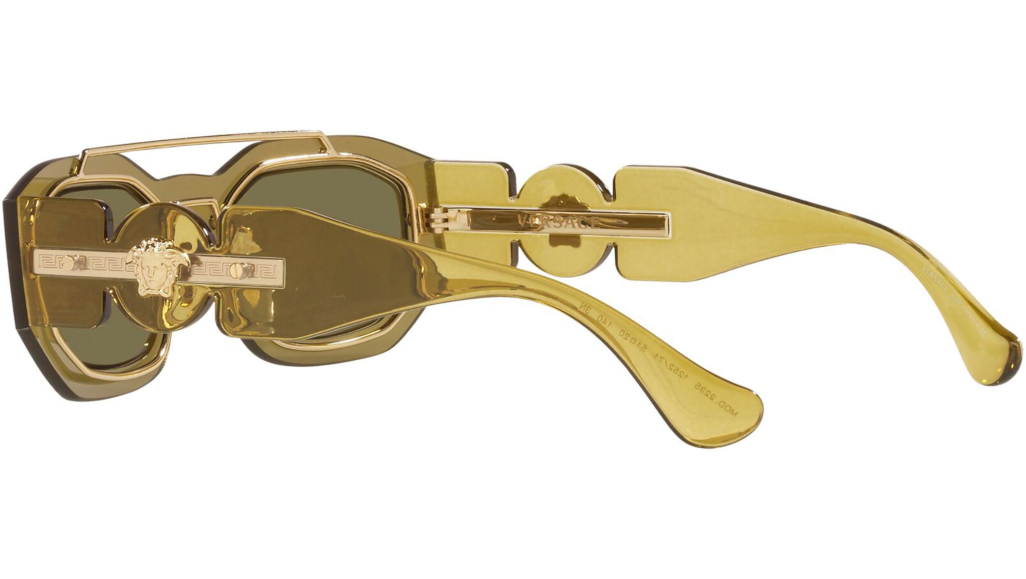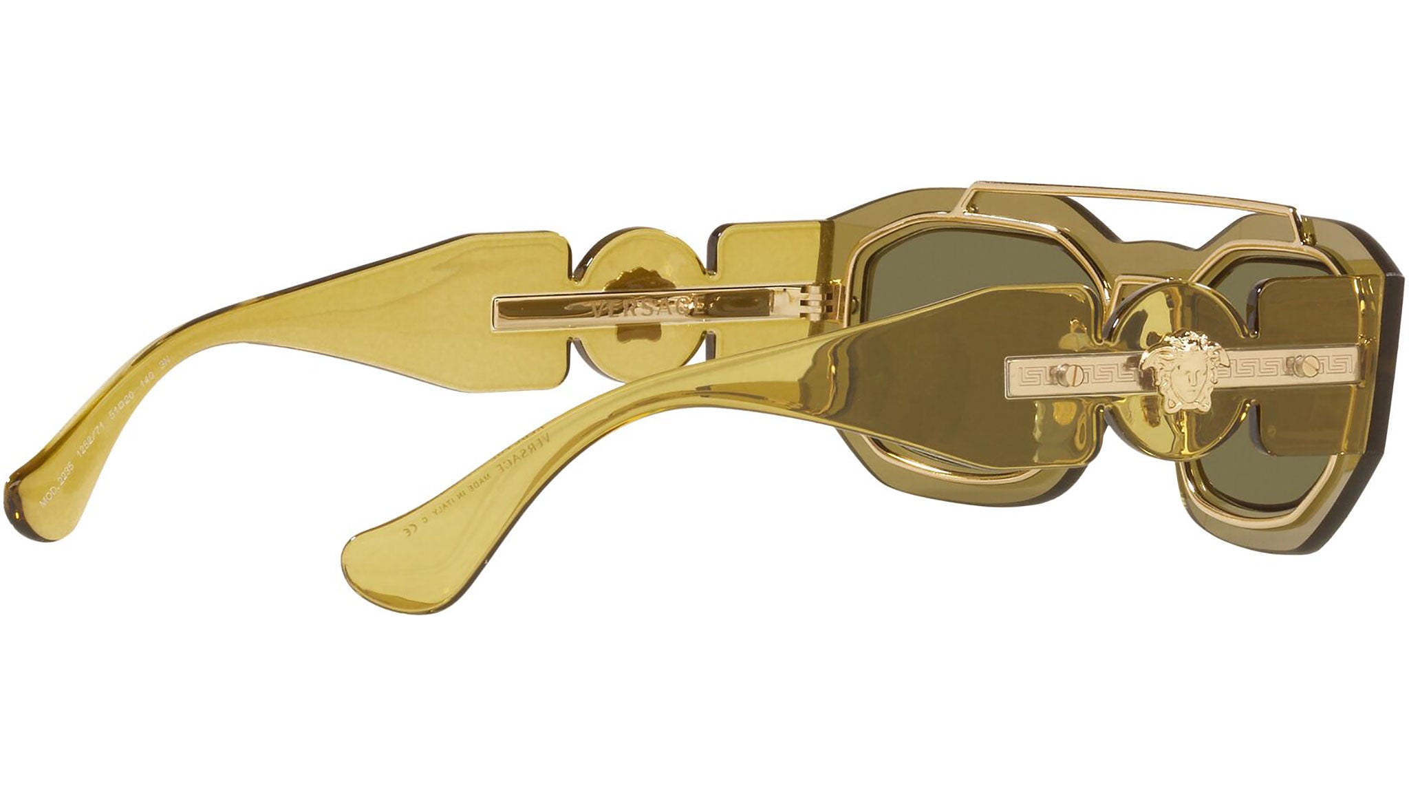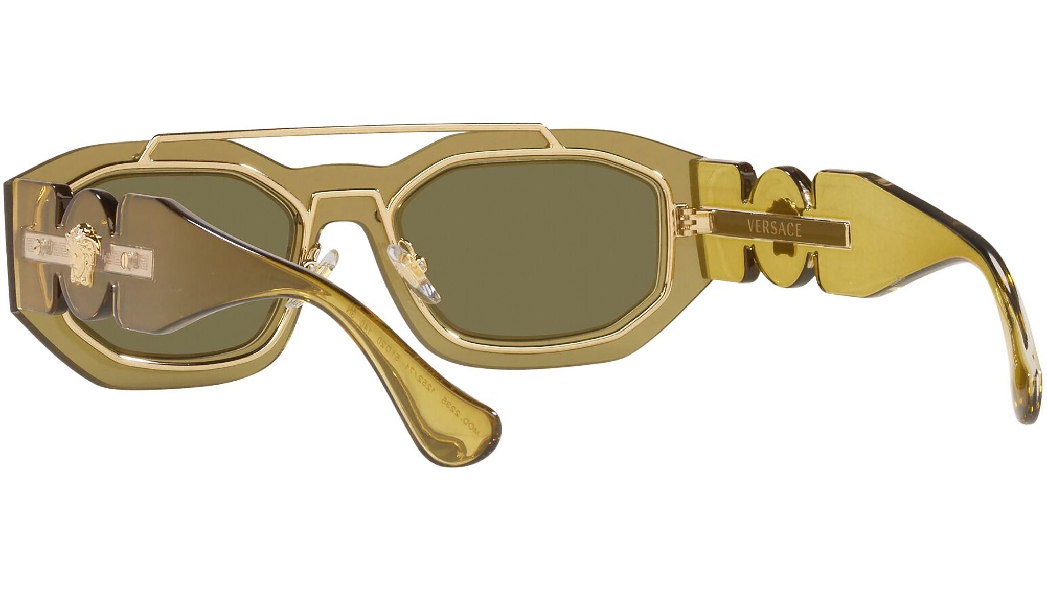 Versace sunglasses model VE2235 color code 125271 transparent green with dark green lenses. Dedicated to those who want a contemporary, sexy, sophisticated style with a strong personality, Versace is one of the most iconic and famous high fashion and luxury houses in the world. The sunglasses collection combines technical innovation and the essential style of the brand, and is strongly characterized by the decorative elements that have always distinguished the Maison.
