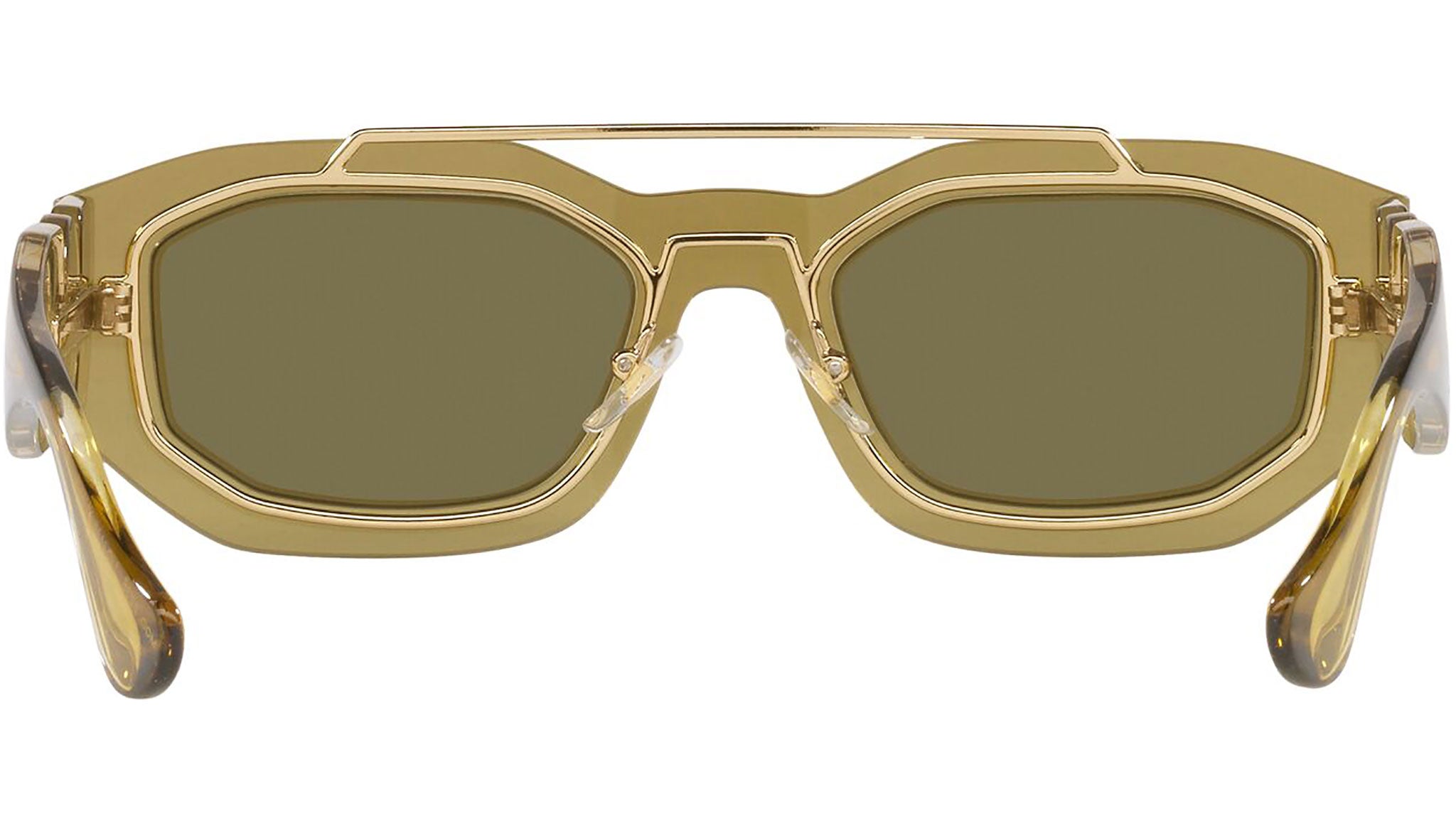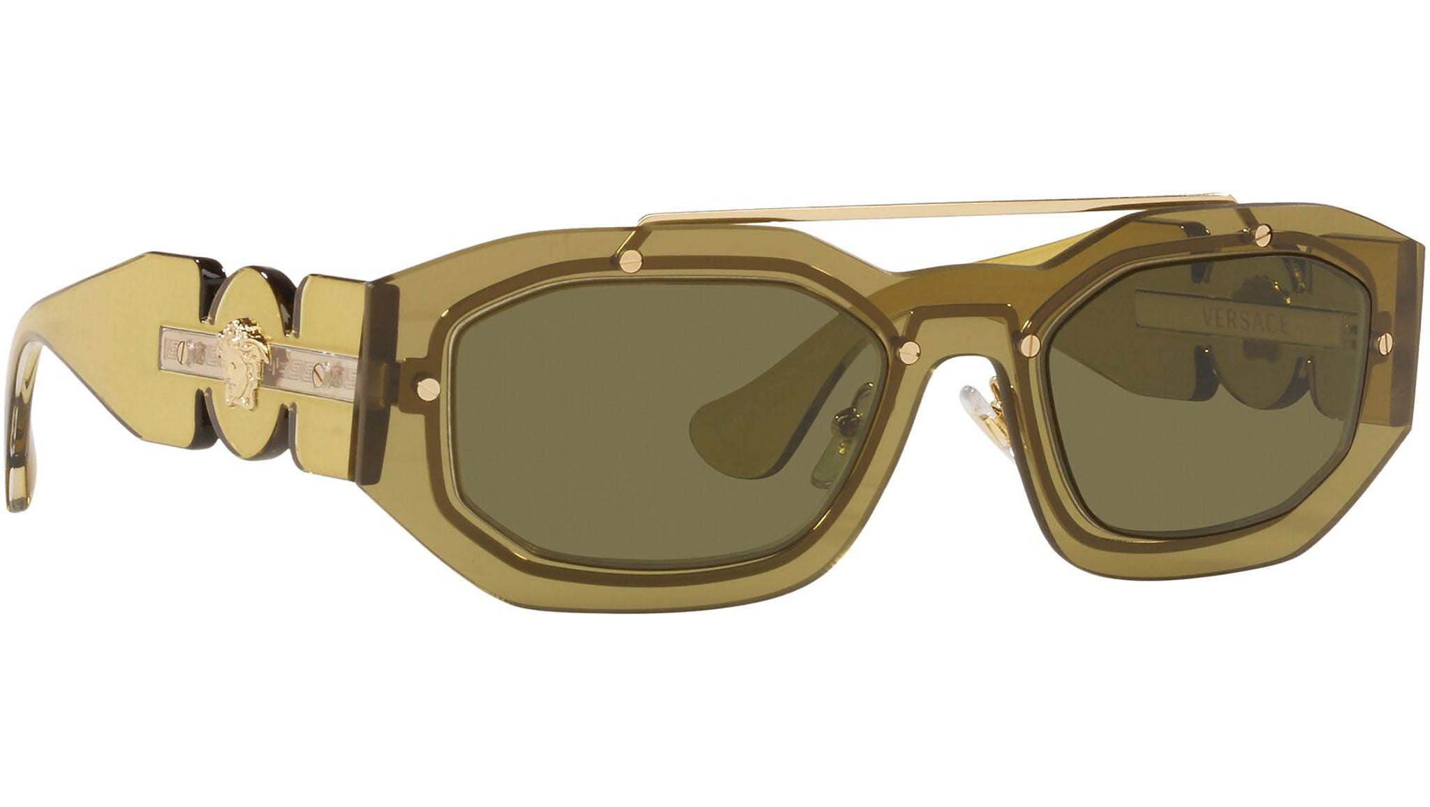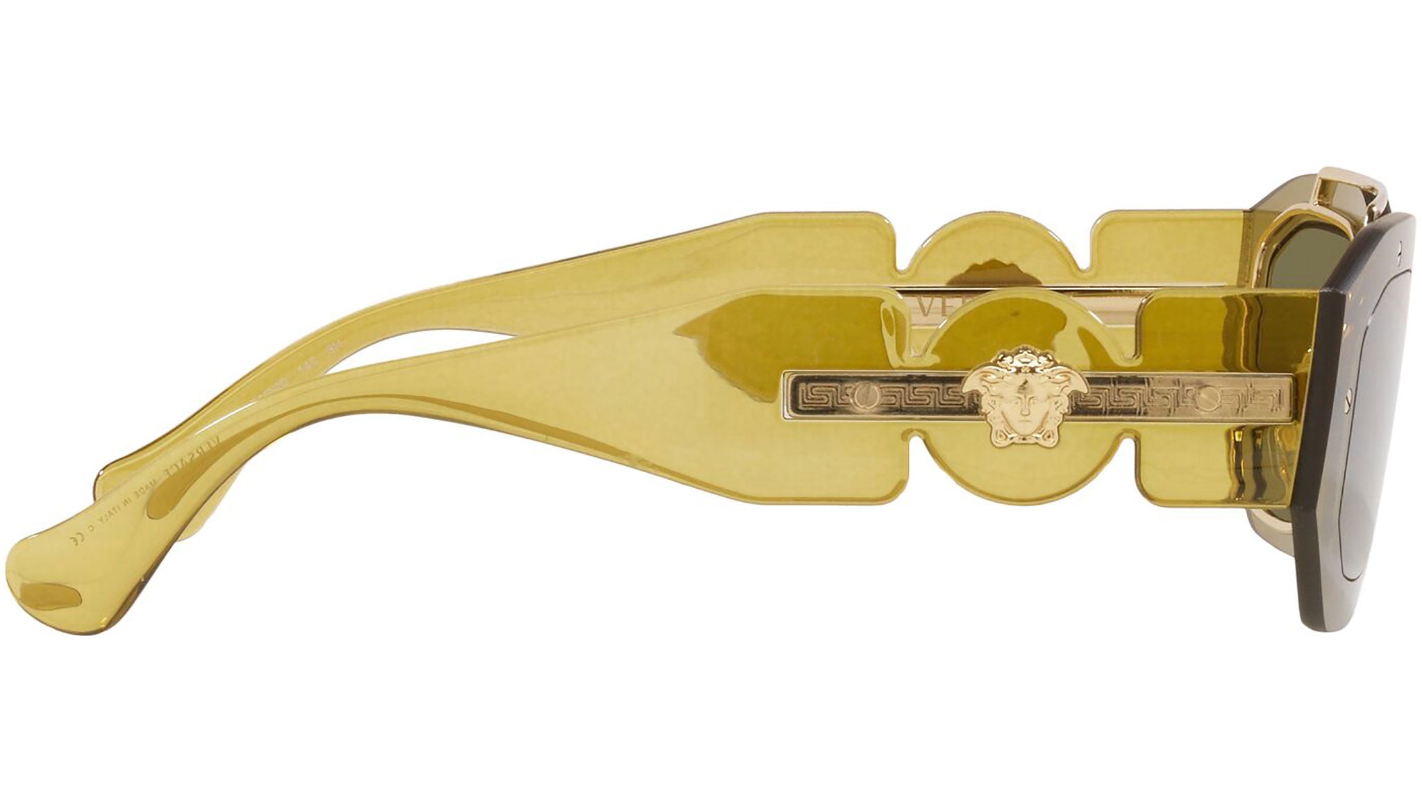 Versace sunglasses model VE2235 color code 125271 transparent green with dark green lenses. Dedicated to those who want a contemporary, sexy, sophisticated style with a strong personality, Versace is one of the most iconic and famous high fashion and luxury houses in the world. The sunglasses collection combines technical innovation and the essential style of the brand, and is strongly characterized by the decorative elements that have always distinguished the Maison.