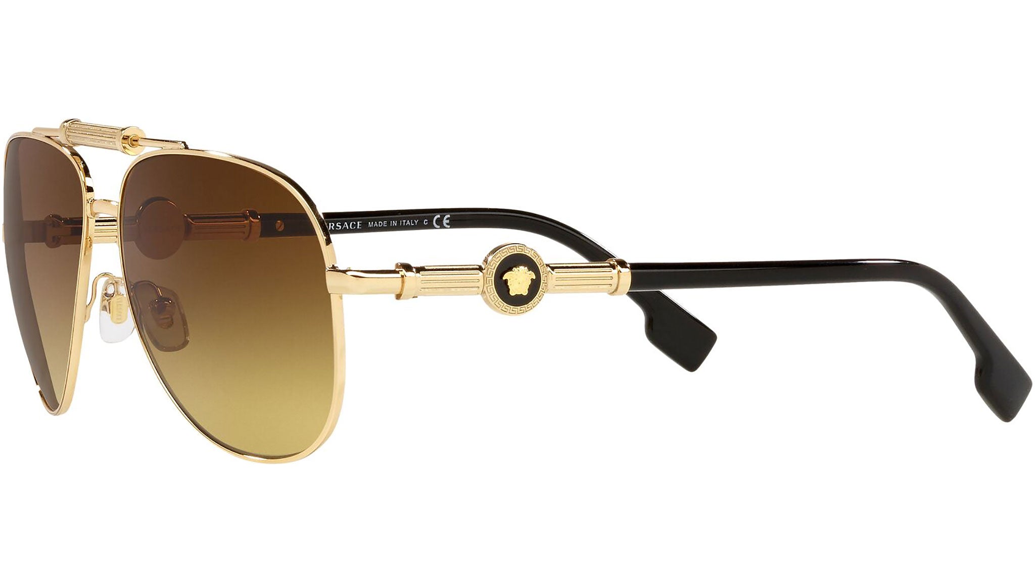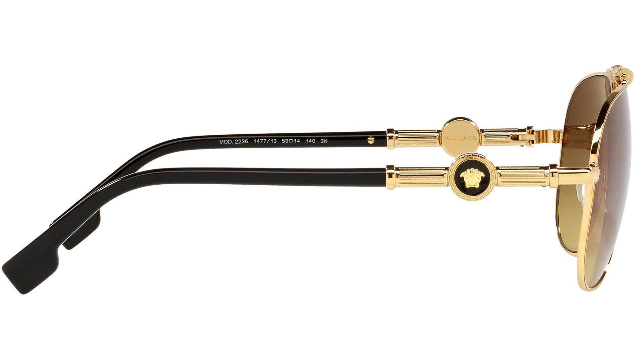 Versace sunglasses model VE2236 color code 147713 gold with gradient brown lenses. Dedicated to those who want a contemporary, sexy, sophisticated style with a strong personality, Versace is one of the most iconic and famous high fashion and luxury houses in the world. The sunglasses collection combines technical innovation and the essential style of the brand, and is strongly characterized by the decorative elements that have always distinguished the Maison.