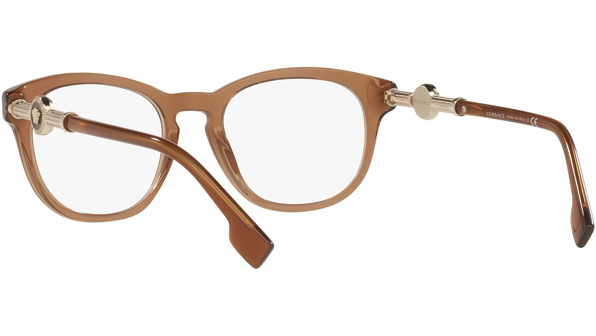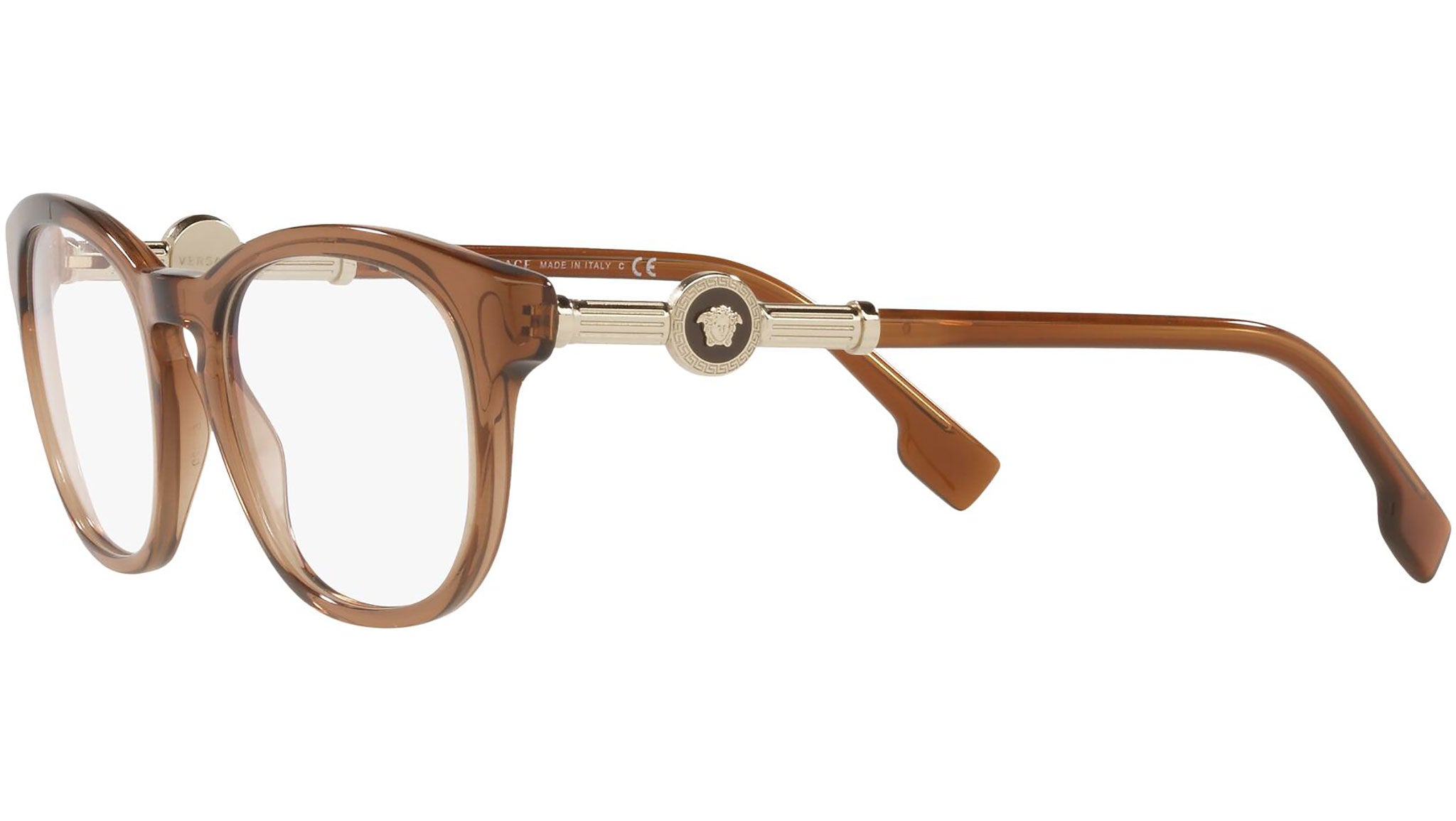 Versace eyeglasses model VE3310 color variant 5028 transparent brown. Dedicated to those who want a contemporary, sexy, sophisticated style with a strong personality, Versace is one of the most iconic and famous high fashion and luxury houses in the world. The eyewear collection combines technical innovation and the essential style of the brand, and is strongly characterized by the decorative elements that have always distinguished the Maison.