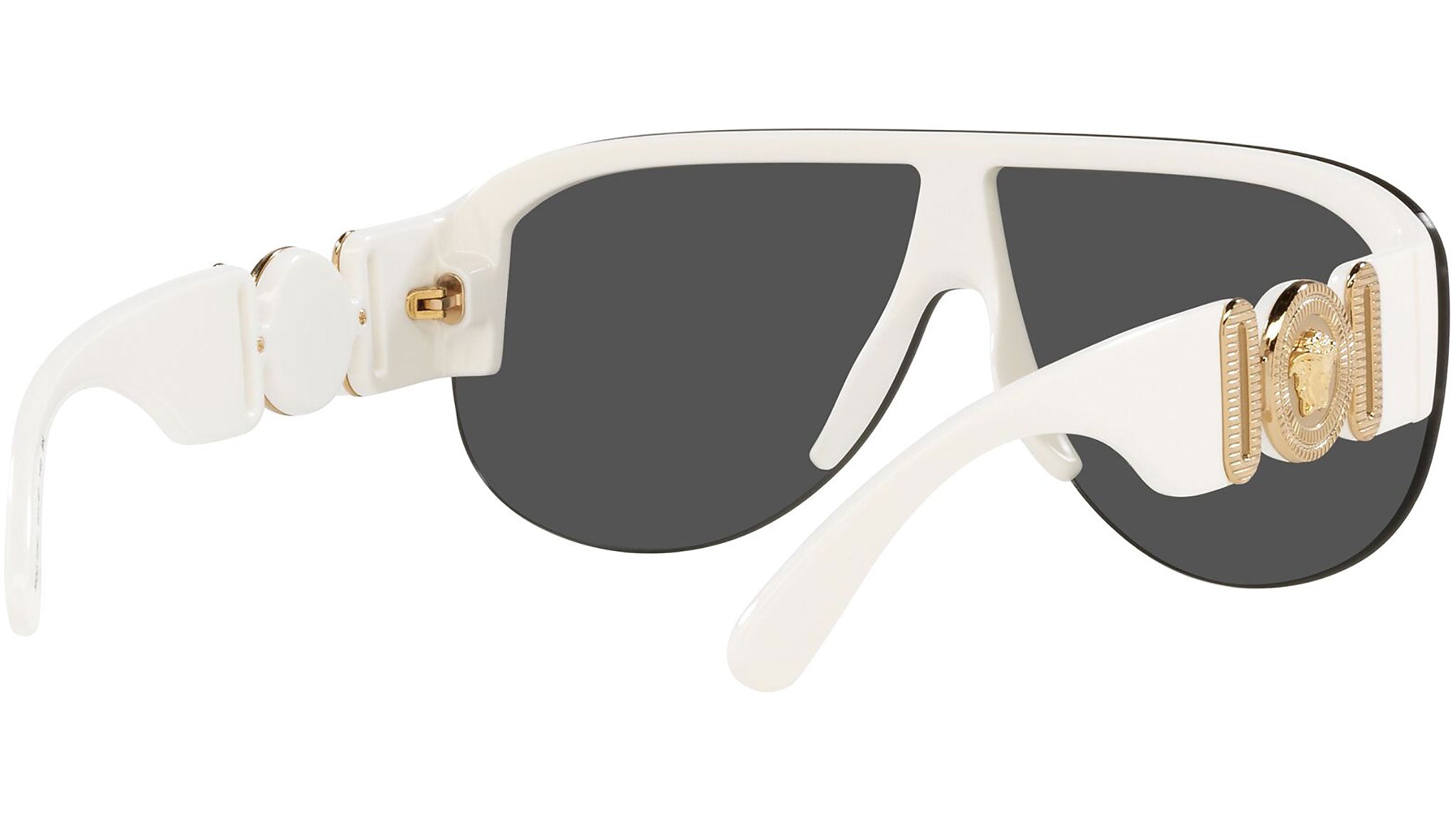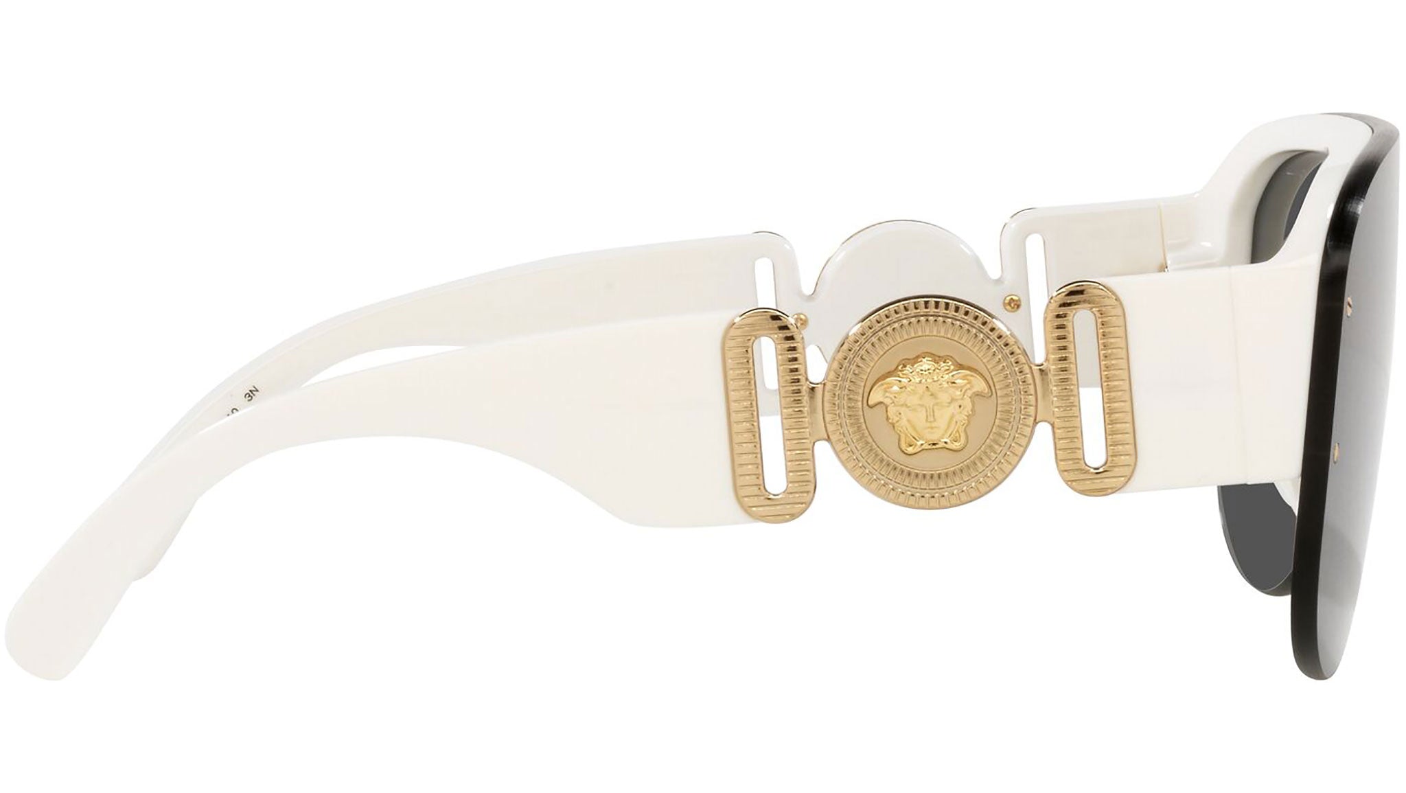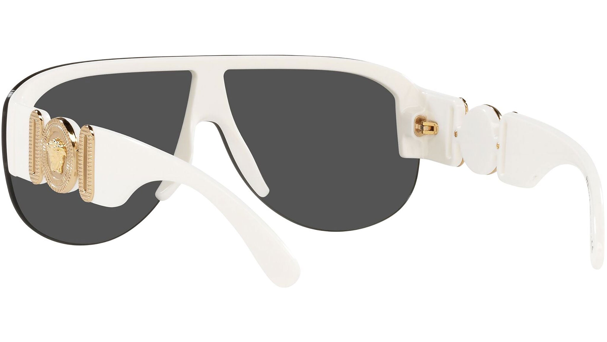 Versace sunglasses model VE4391 color code 401/87 white with dark gray lenses. Dedicated to those who want a contemporary, sexy, sophisticated style with a strong personality, Versace is one of the most iconic and famous high fashion and luxury houses in the world. The sunglasses collection combines technical innovation and the essential style of the brand, and is strongly characterized by the decorative elements that have always distinguished the Maison.
