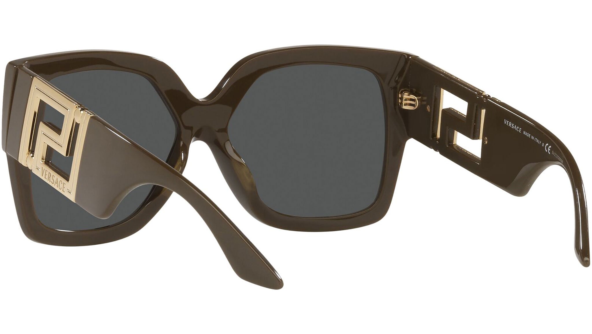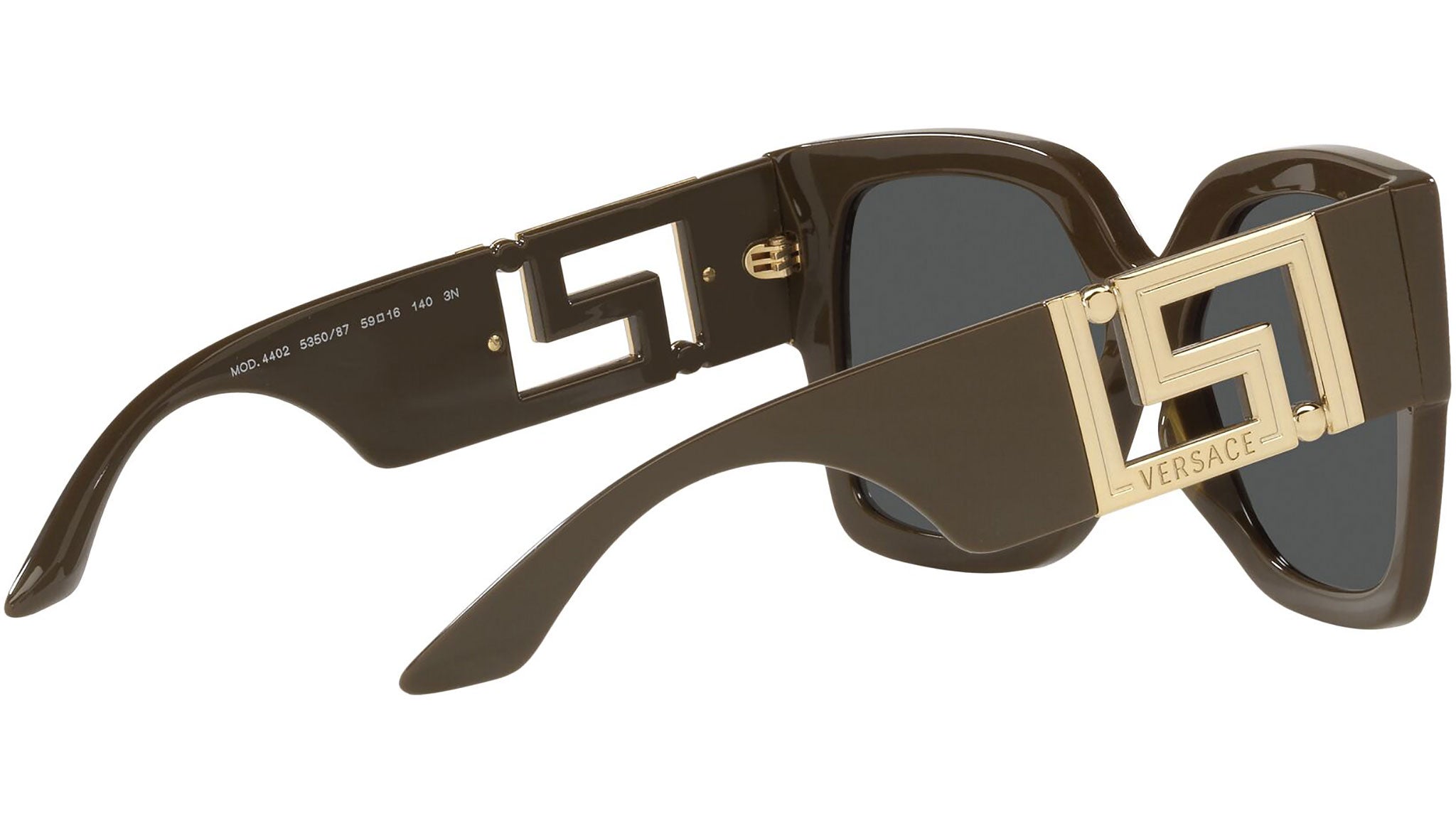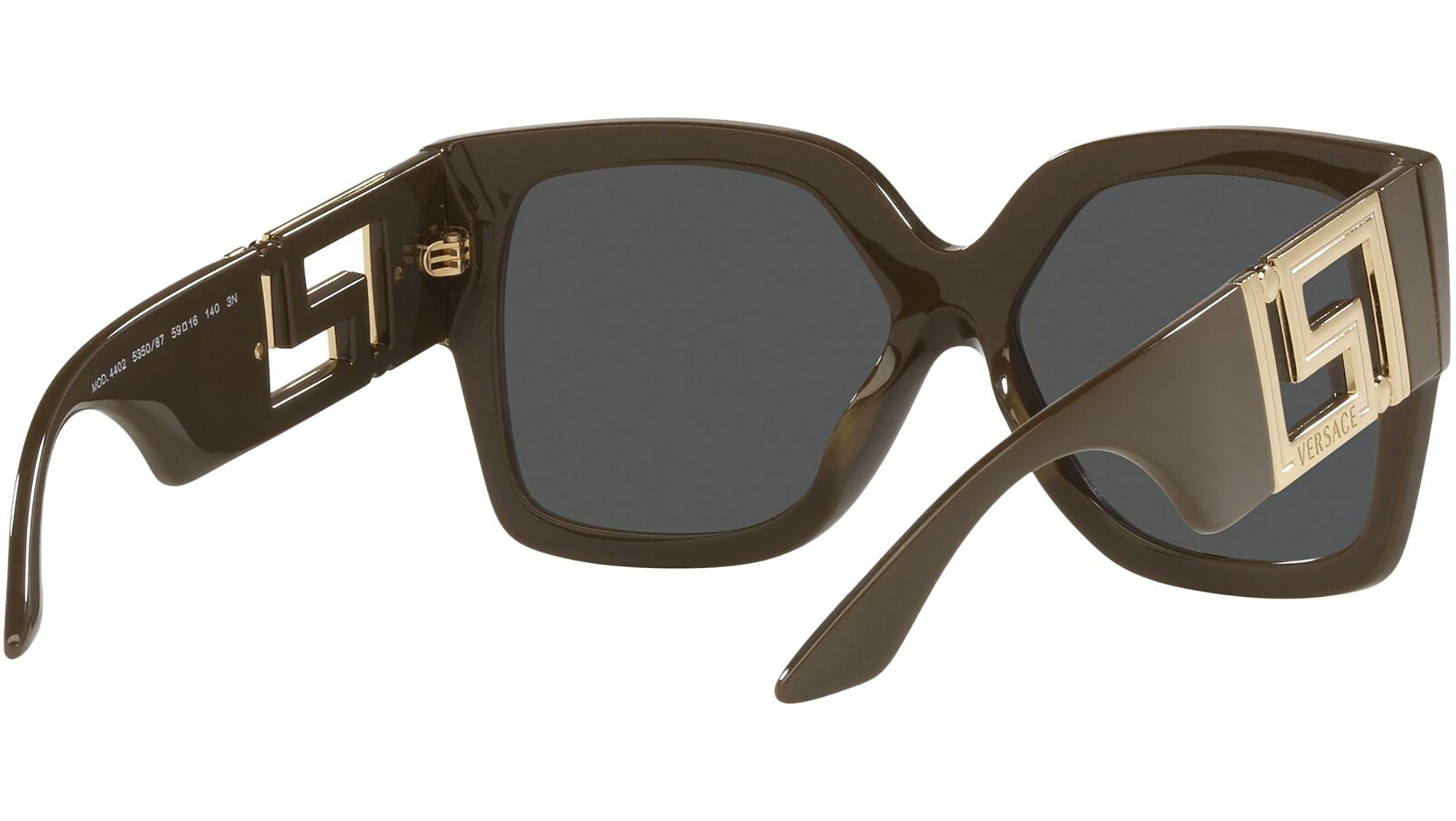 Versace sunglasses model VE4402 color code 535087 brown and green with dark gray lenses. Dedicated to those who want a contemporary, sexy, sophisticated style with a strong personality, Versace is one of the most iconic and famous high fashion and luxury houses in the world. The sunglasses collection combines technical innovation and the essential style of the brand, and is strongly characterized by the decorative elements that have always distinguished the Maison.