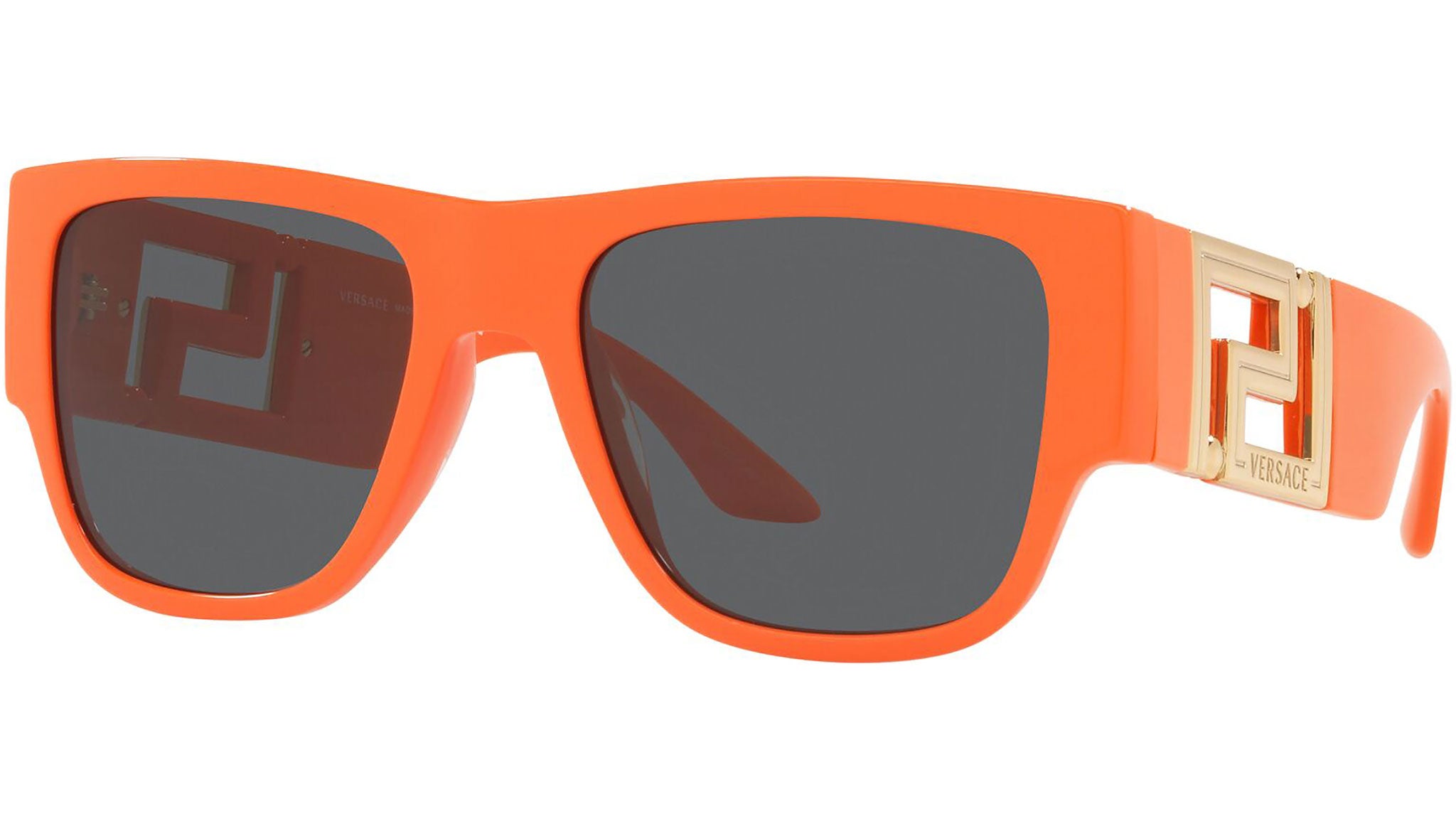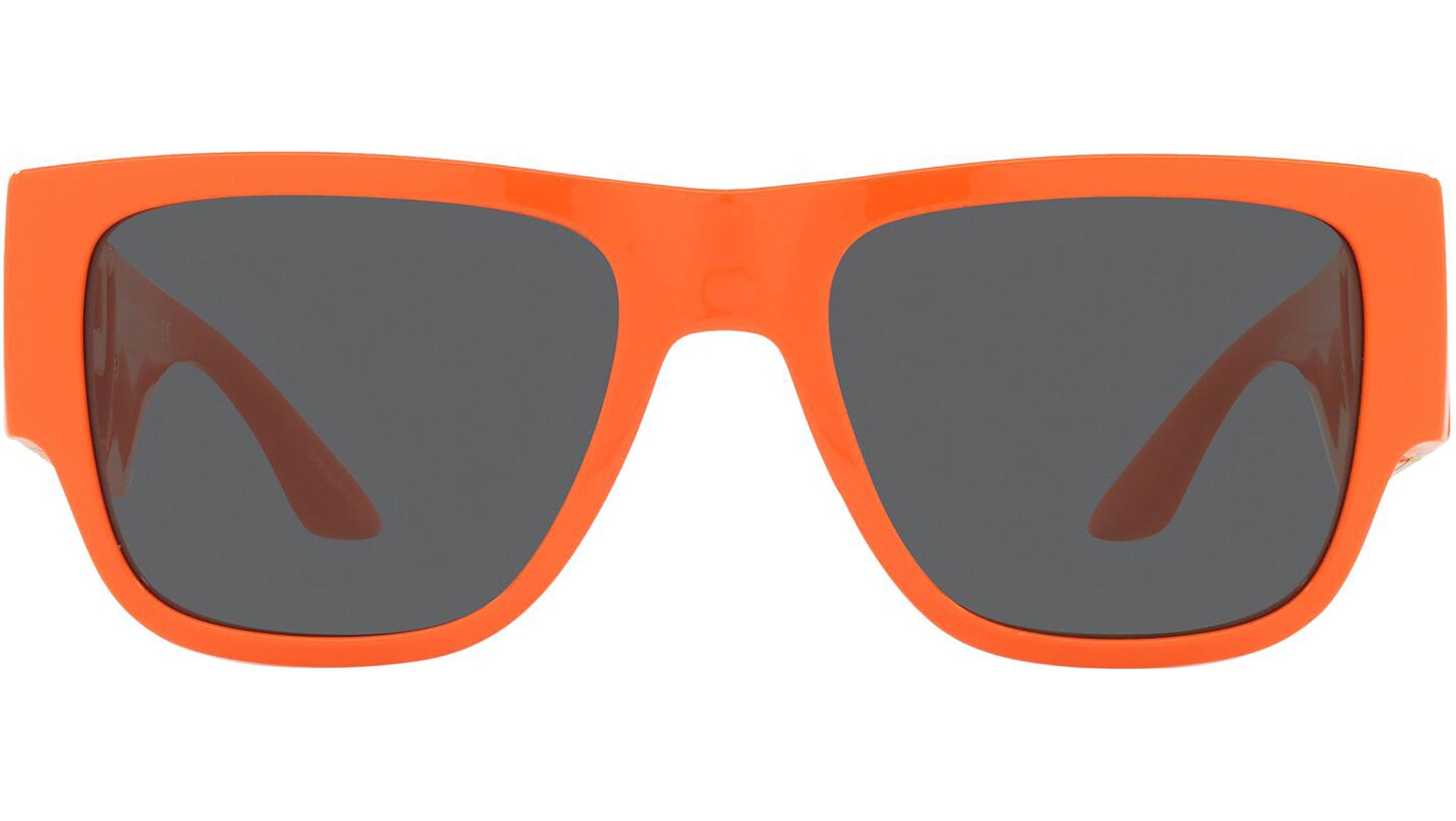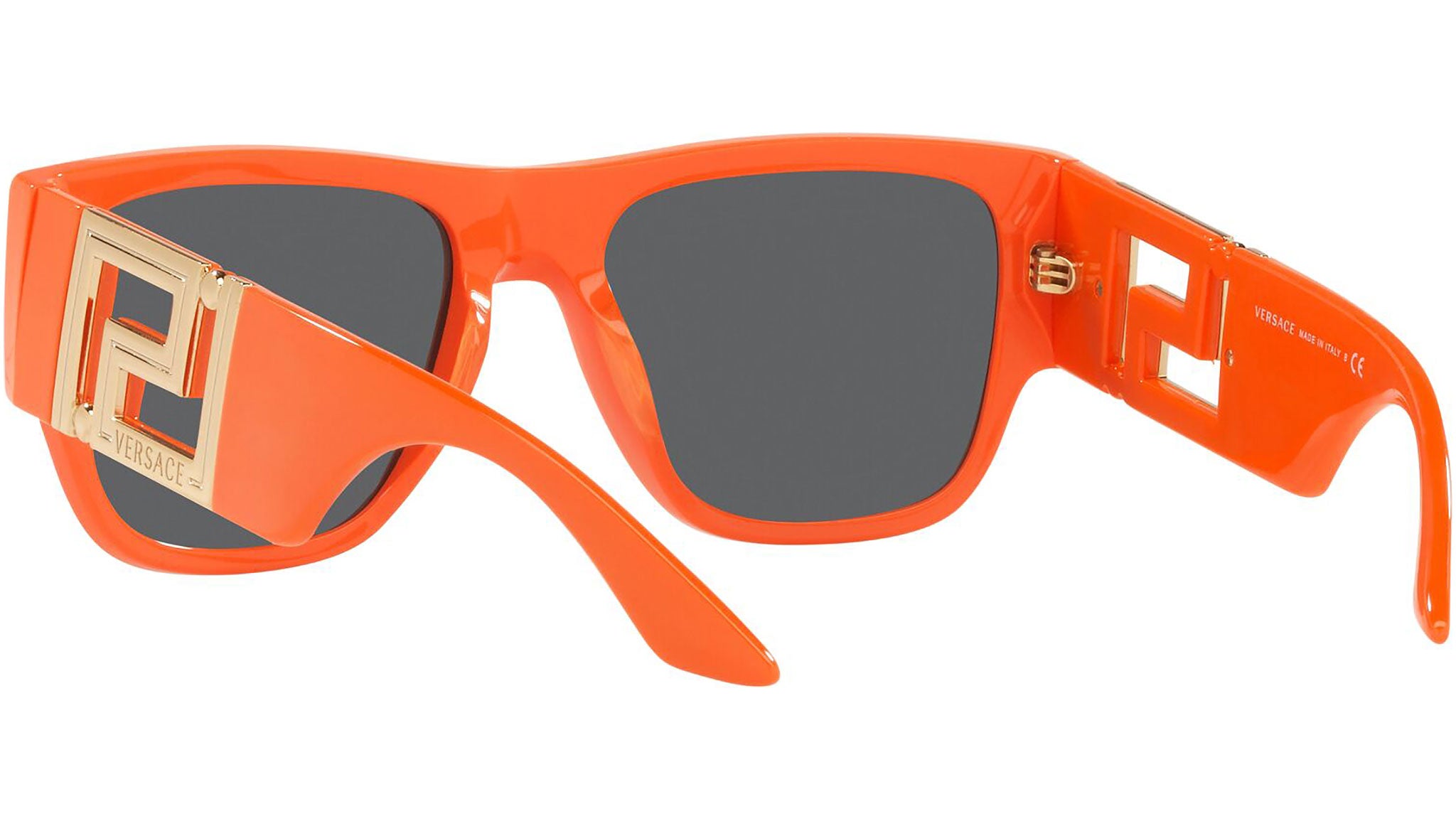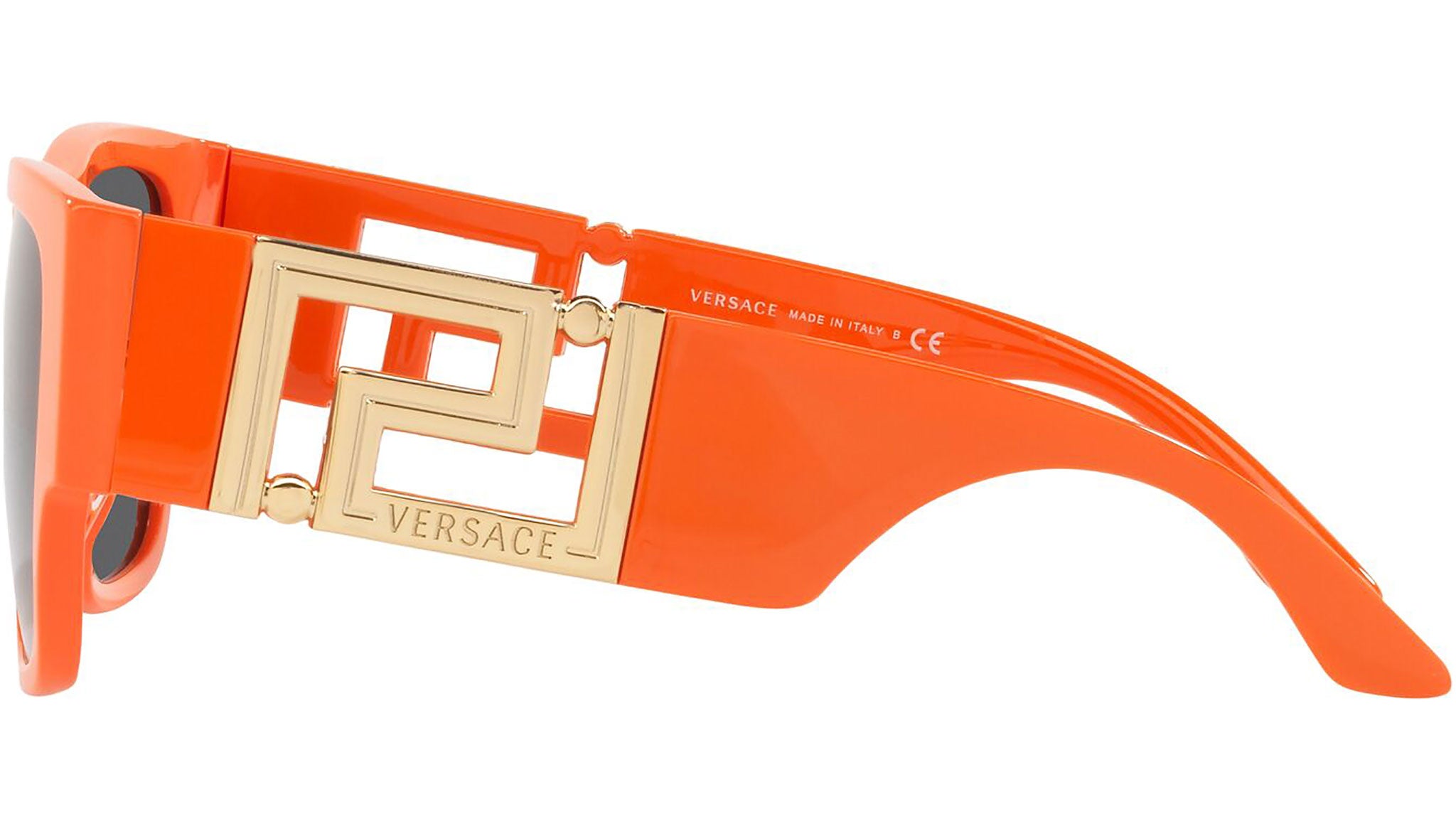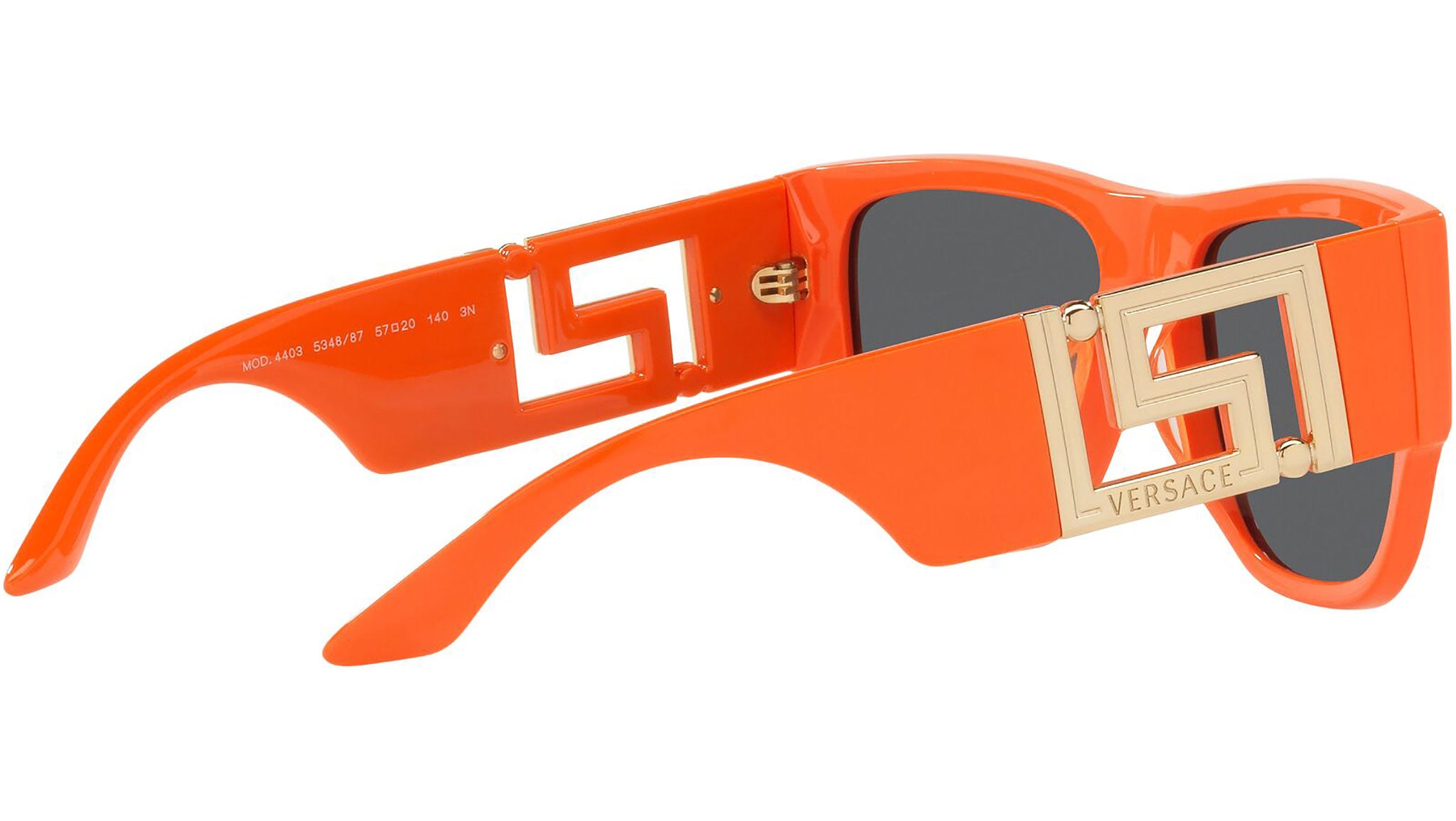 Versace sunglasses model VE4403 color code 534887 orange with dark gray lenses. Dedicated to those who want a contemporary, sexy, sophisticated style with a strong personality, Versace is one of the most iconic and famous high fashion and luxury houses in the world. The sunglasses collection combines technical innovation and the essential style of the brand, and is strongly characterized by the decorative elements that have always distinguished the Maison.