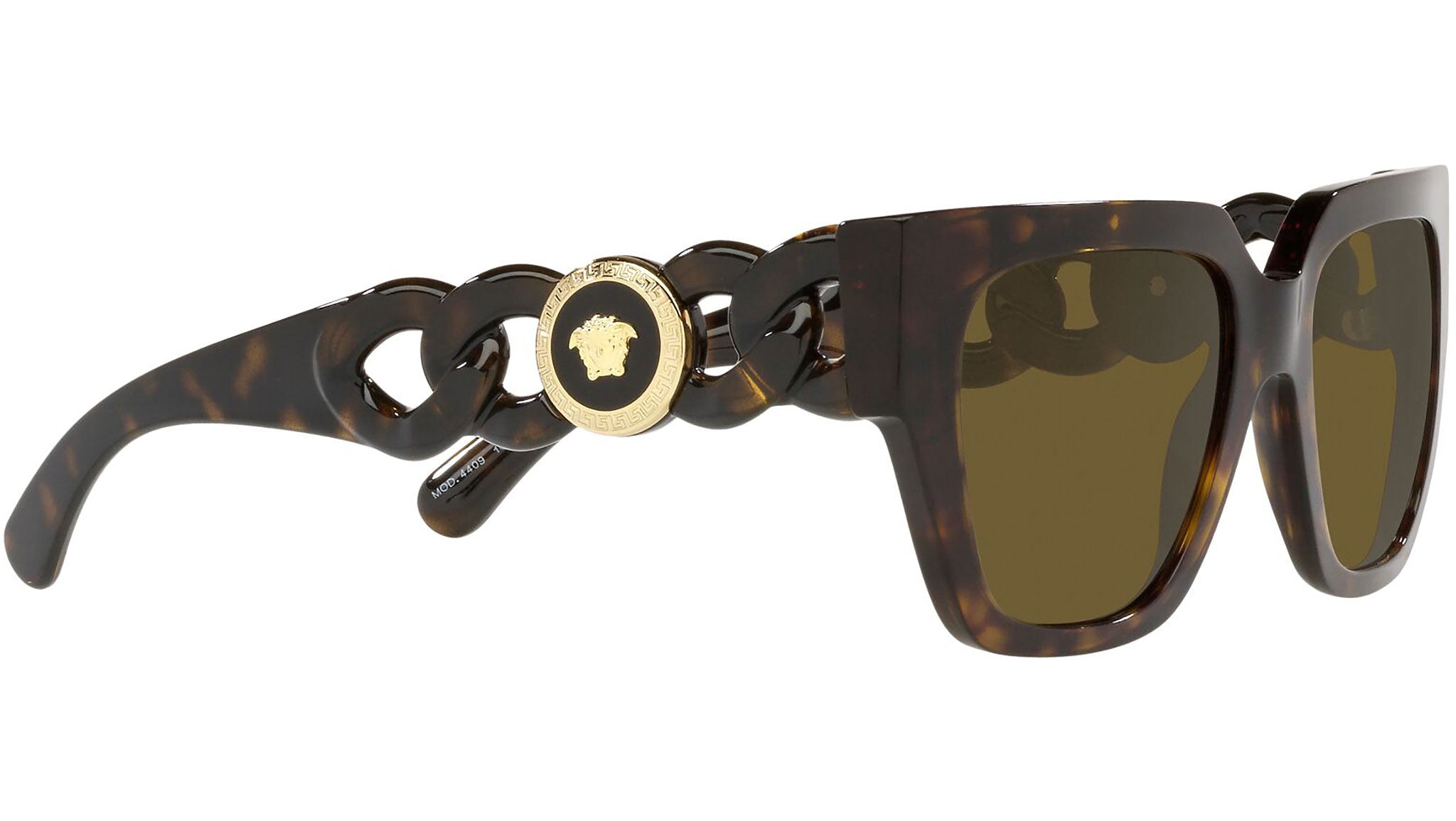 Versace sunglasses model VE4409 color code 108/73 havana with dark brown lenses. Dedicated to those who want a contemporary, sexy, sophisticated style with a strong personality, Versace is one of the most iconic and famous high fashion and luxury houses in the world. The sunglasses collection combines technical innovation and the essential style of the brand, and is strongly characterized by the decorative elements that have always distinguished the Maison.