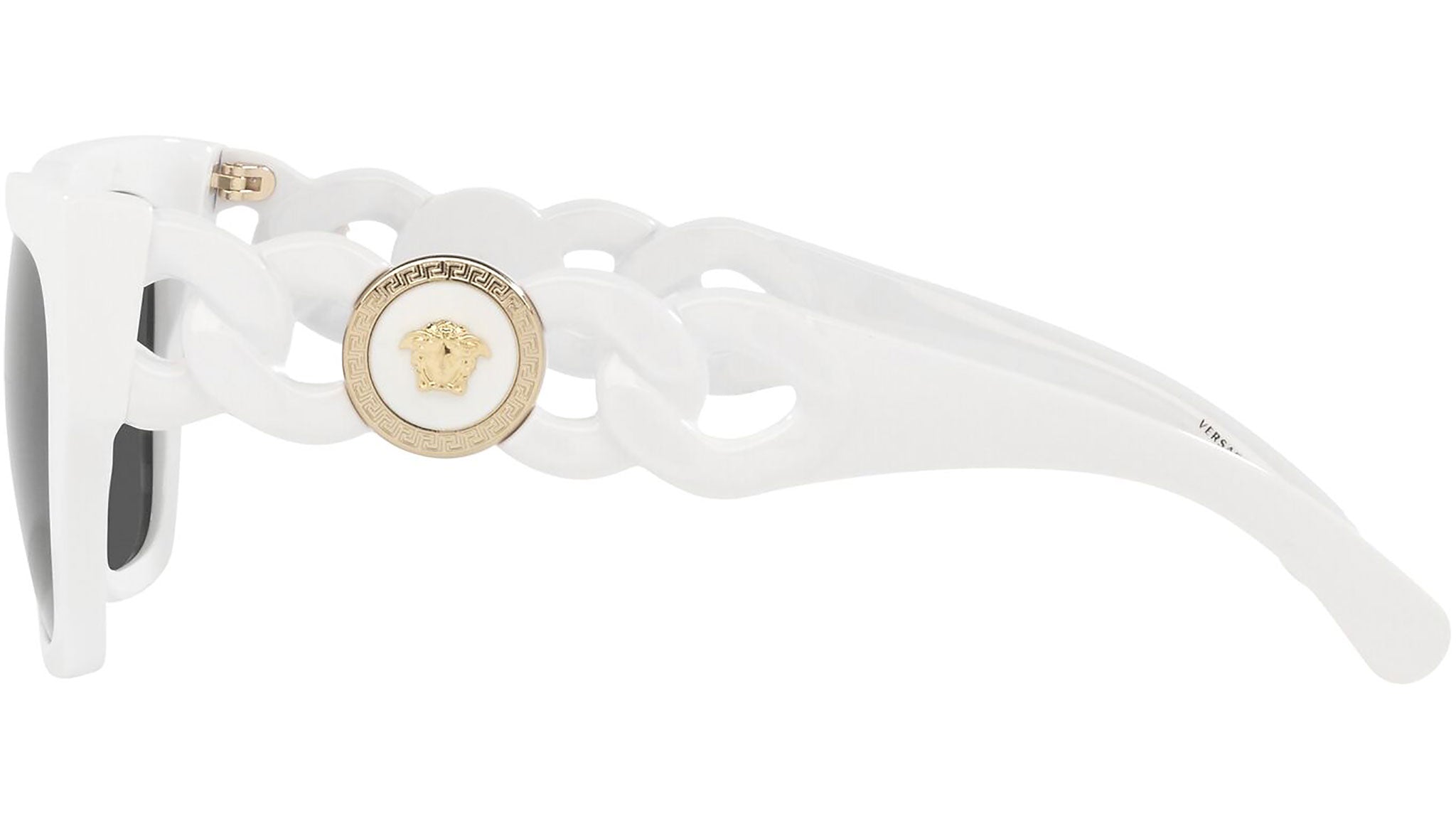 Versace sunglasses model VE4409 color code 314/87 white with dark gray lenses. Dedicated to those who want a contemporary, sexy, sophisticated style with a strong personality, Versace is one of the most iconic and famous high fashion and luxury houses in the world. The sunglasses collection combines technical innovation and the essential style of the brand, and is strongly characterized by the decorative elements that have always distinguished the Maison.