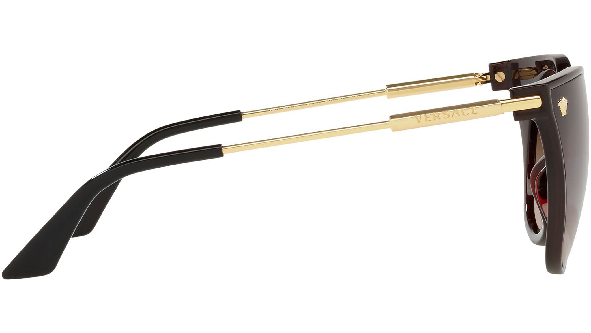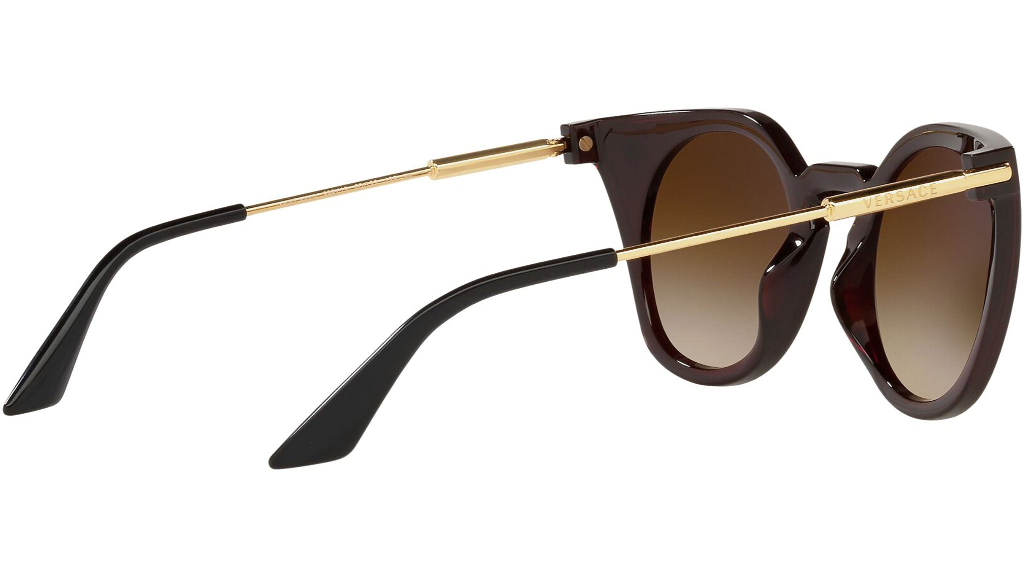 Versace sunglasses model VE4410 color code 388/13 transparent red with gradient brown lenses. Dedicated to those who want a contemporary, sexy, sophisticated style with a strong personality, Versace is one of the most iconic and famous high fashion and luxury houses in the world. The sunglasses collection combines technical innovation and the essential style of the brand, and is strongly characterized by the decorative elements that have always distinguished the Maison.