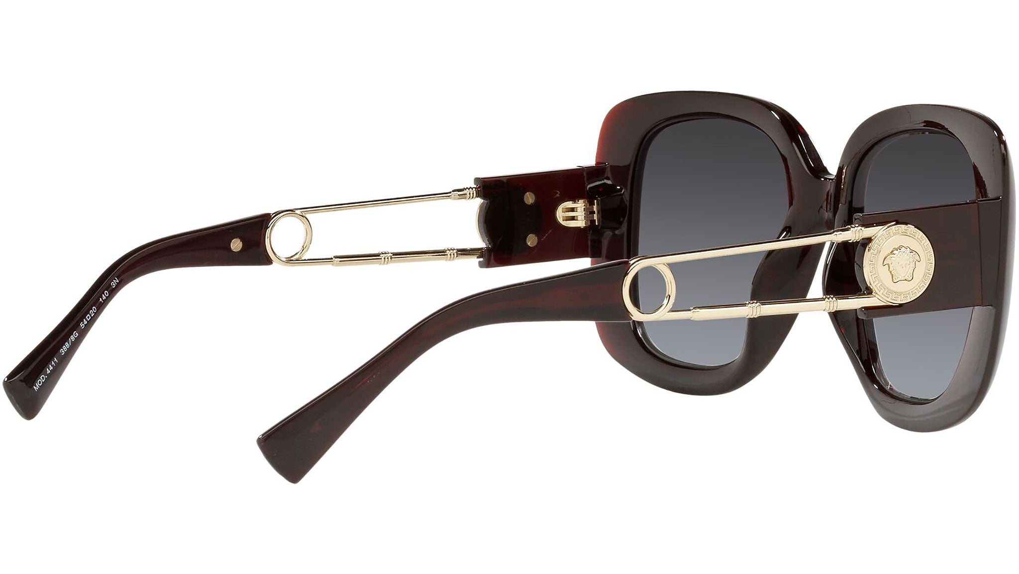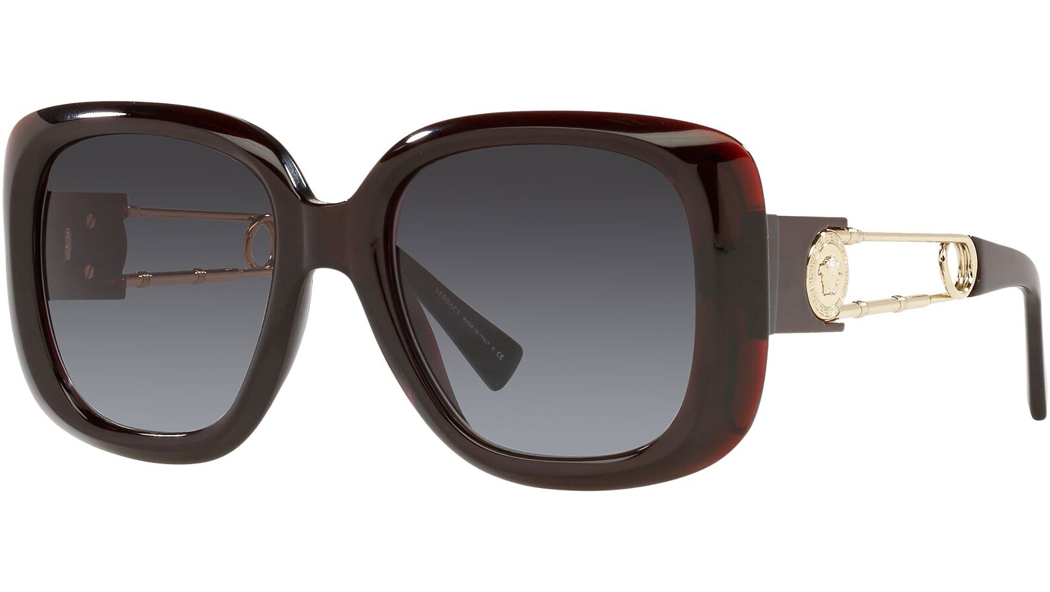 Versace sunglasses model VE4411 color code 388/8G transparent red with gradient gray lenses. Dedicated to those who want a contemporary, sexy, sophisticated style with a strong personality, Versace is one of the most iconic and famous high fashion and luxury houses in the world. The sunglasses collection combines technical innovation and the essential style of the brand, and is strongly characterized by the decorative elements that have always distinguished the Maison.
