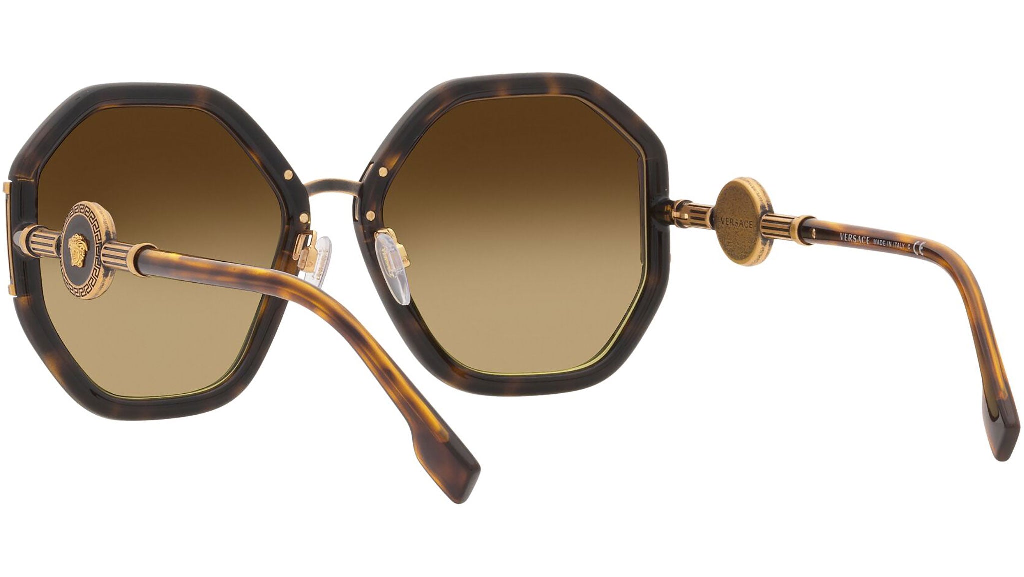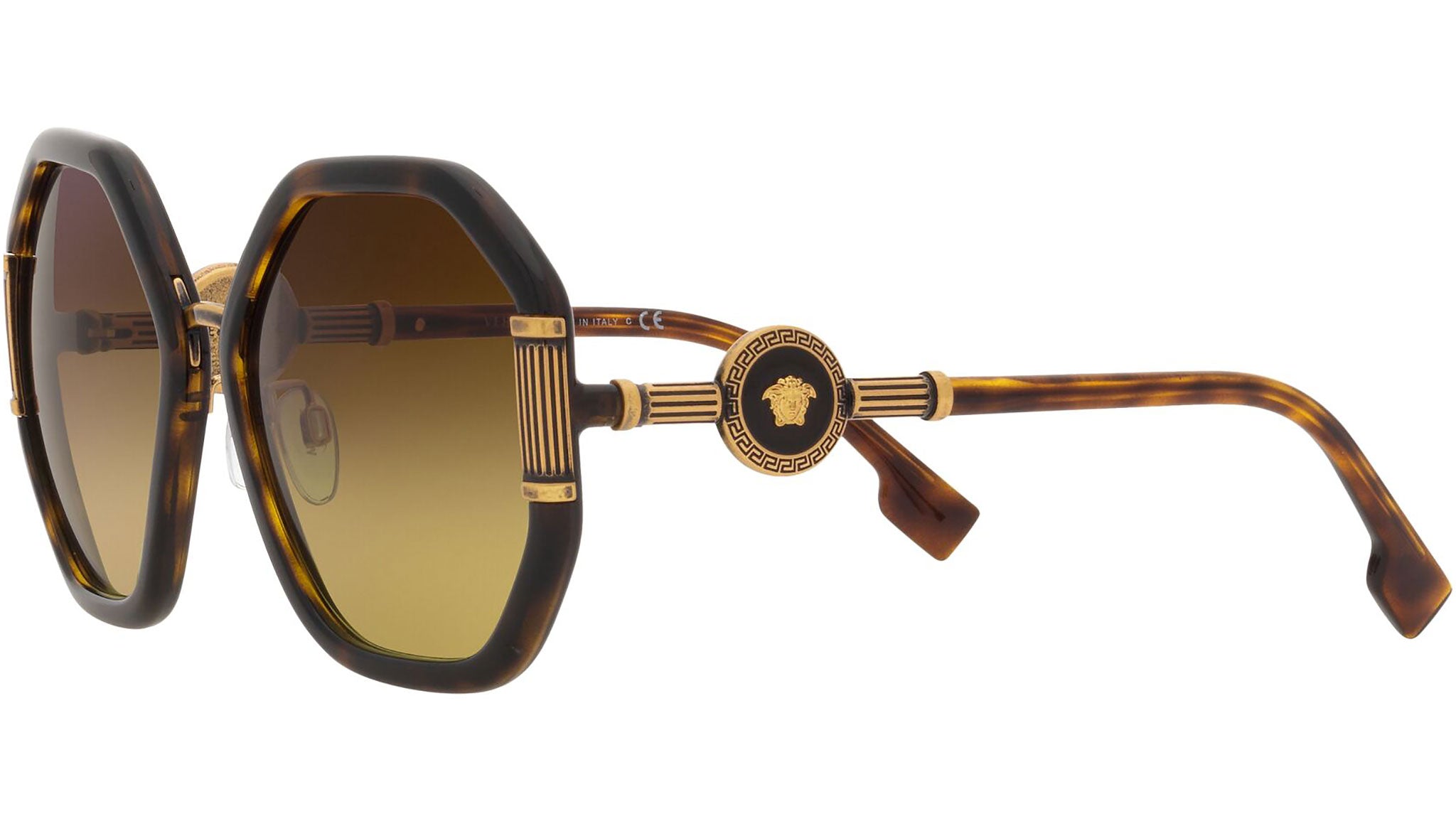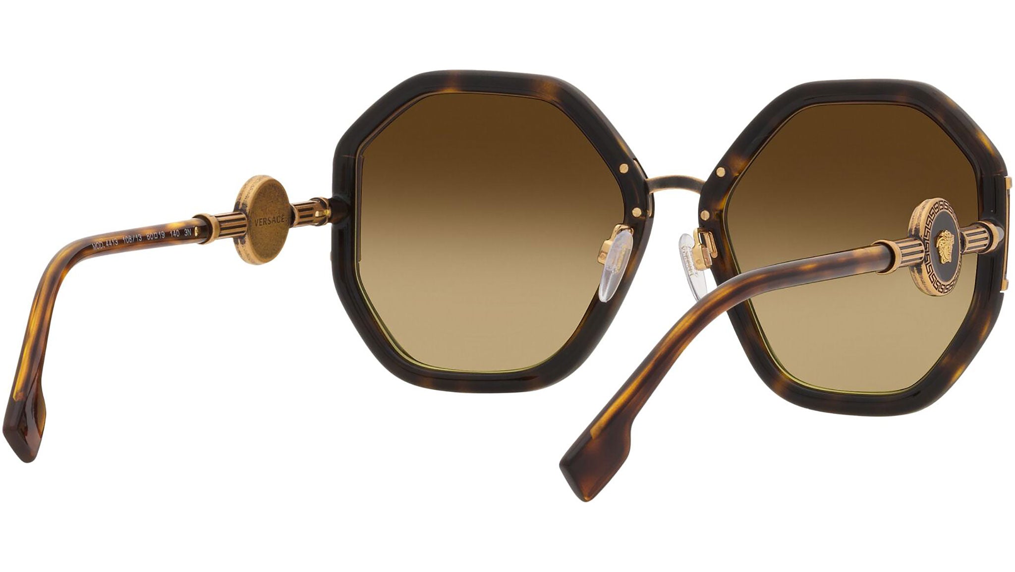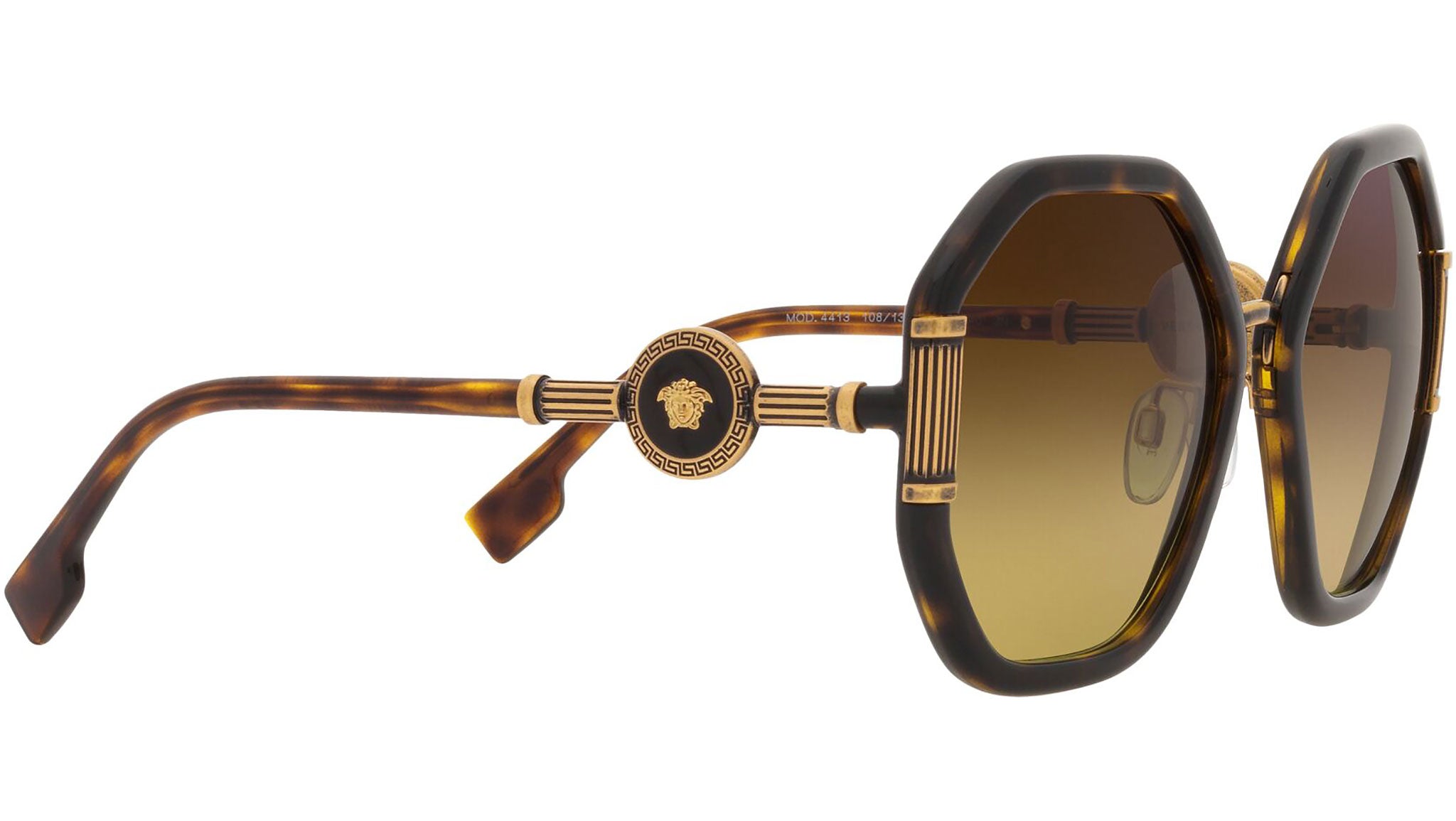 Versace sunglasses model VE4413 color code 108/13 havana with gradient brown lenses. Dedicated to those who want a contemporary, sexy, sophisticated style with a strong personality, Versace is one of the most iconic and famous high fashion and luxury houses in the world. The sunglasses collection combines technical innovation and the essential style of the brand, and is strongly characterized by the decorative elements that have always distinguished the Maison.