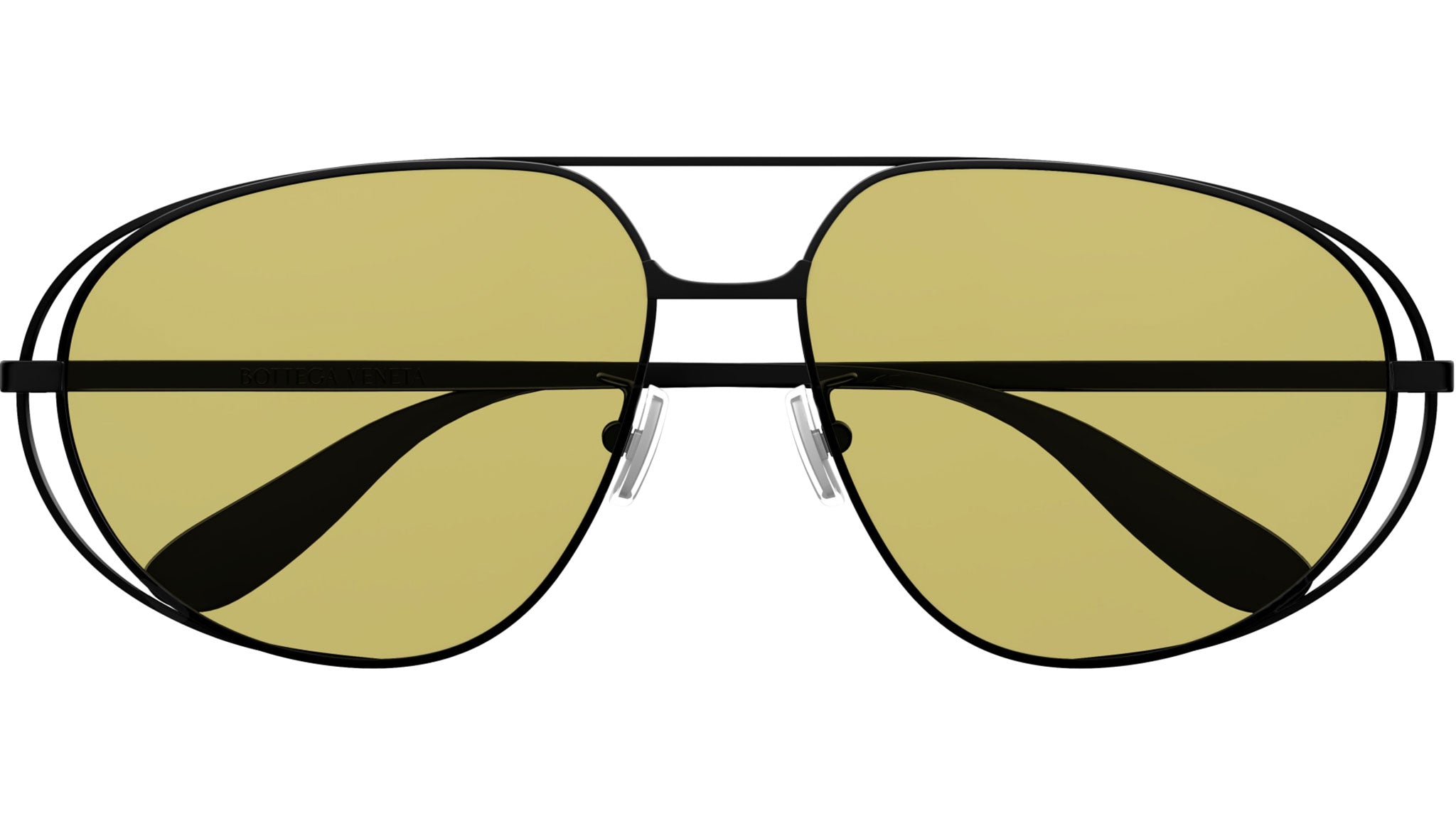 Occhiali da sole Bottega Veneta modello BV1344S in metallo forma aviatore codice colore 002 nero opaco con lenti color giallo senape tinta unita. Rivenditore autorizzato Bottega Veneta online. Gli occhiali vengono consegnati con custodia e accessori originali e sono coperti dalla garanzia ufficiale di 12 mesi del produttore.