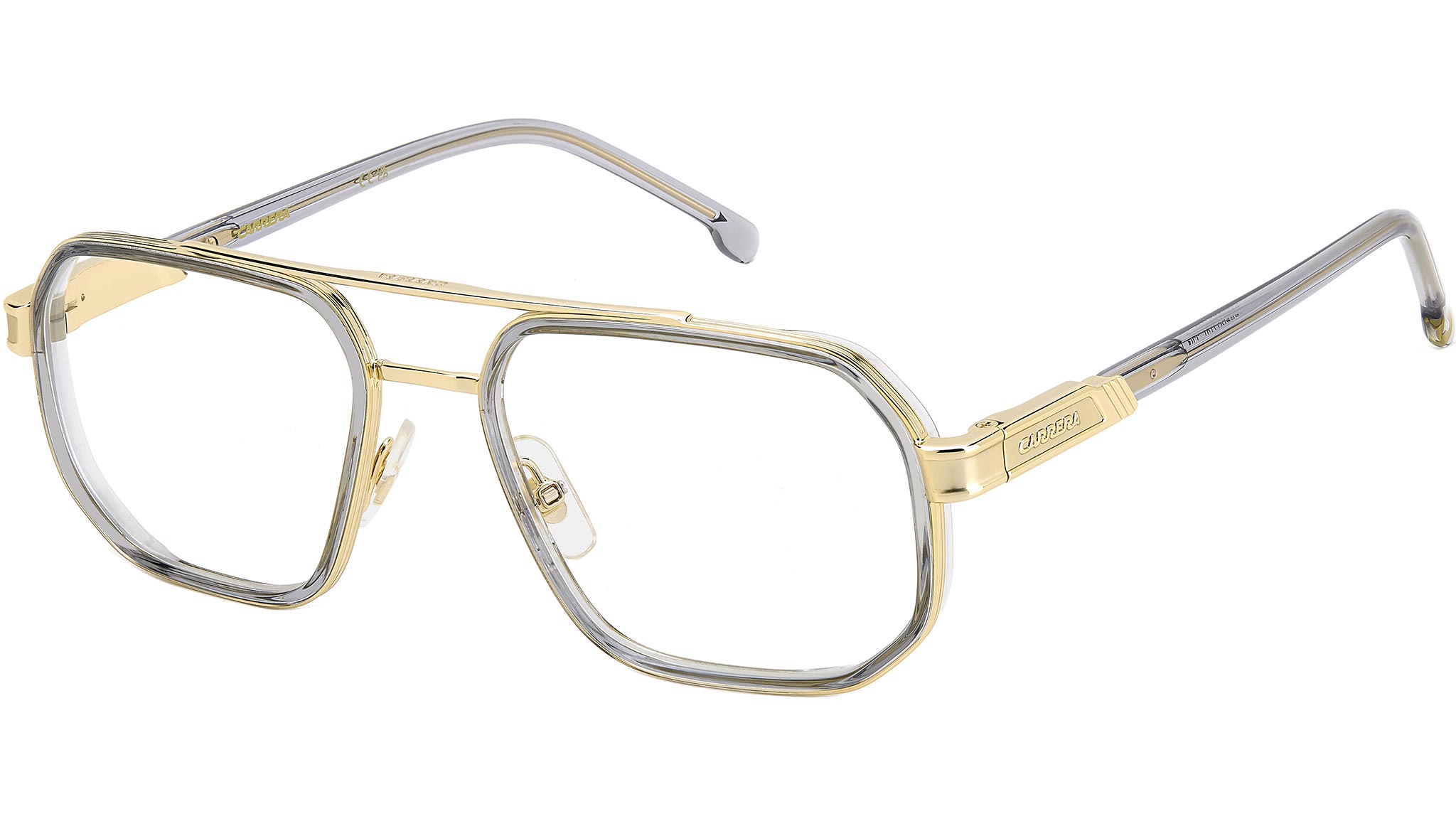 Occhiali da vista Carrera modello 1137 colore J5G gold. Occhiali da vista dalla montatura sapientemente costruita, pregna di elementi celebrativi Carrera. Si fanno notare grazie al frontale lavorato: struttura in metallo con rivestimento iniettato e doppio ponte tipico Carrera. Il logo esteso è inciso sul lato superiore del frontale e in rilievo sulle aste in metallo. Un modello da indossare con disinvoltura perché leggero sul volto e corredato da naselli regolabili, terminali lunghi in acetato, cerniere flessibili.