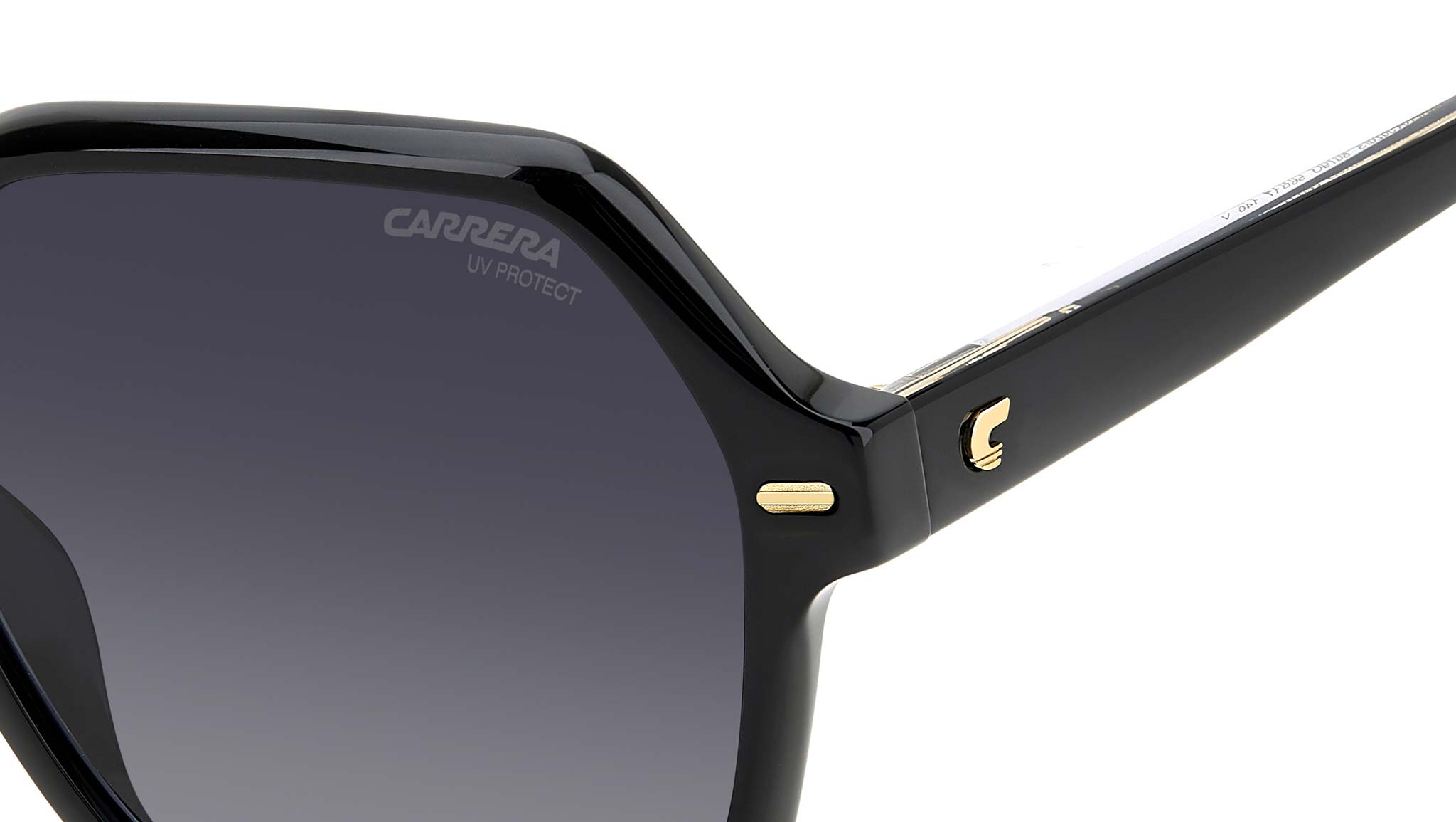 Occhiali da sole Carrera modello 3026/S colore 807 9O black. Carrera sceglie geometrie soft e ispirazioni retrò per questi occhiali da sole donna. Gli elementi tipici del brand diventano gioielli che impreziosiscono la montatura: i rivetti in metallo dorato sul frontale e la “C” in rilievo sulle aste. La struttura è in acetato, declinata in diverse opzioni colore che includono sfumature, trasparenze e havana colorata. Le lenti sono personalizzabili con la gradazione preferita, disponibili anche in versione specchiata.