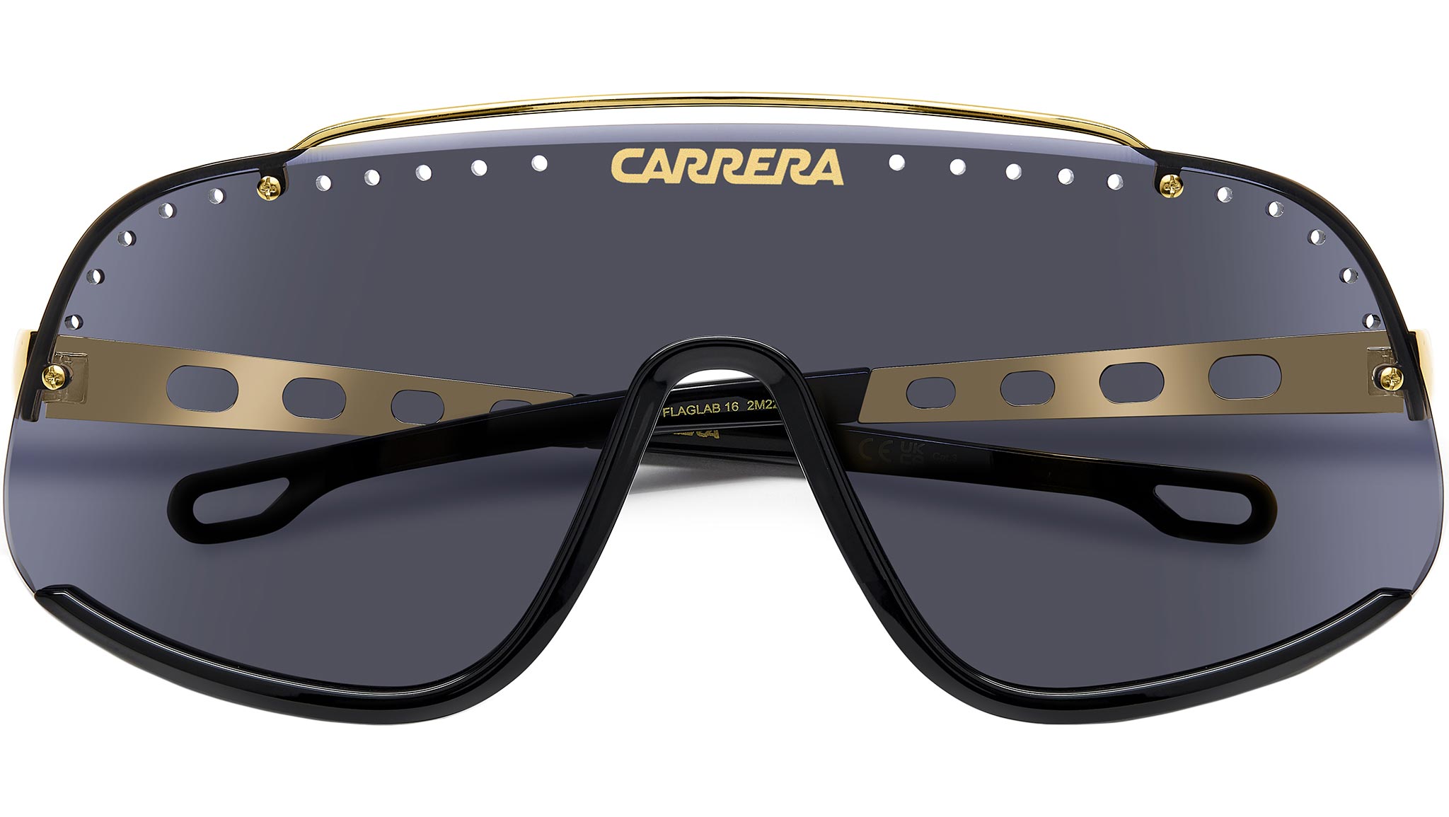Occhiali da sole Carrera modello Flaglab 16 colore 2M2 2K black gold. La racing attitude di Carrera si esprime in questi occhiali da sole unisex. Il frontale è una maschera sormontata da un sottile ponte in metallo, completata da viti e fori decorativi. Le aste in metallo sono forate: mimano il design del volante delle auto d’epoca che gareggiavano nella Carrera Panamericana. Disponibile con lenti specchiate, anche arancioni per un effetto vintage garantito. Un modello da collezione che arriva con pack dedicato.
