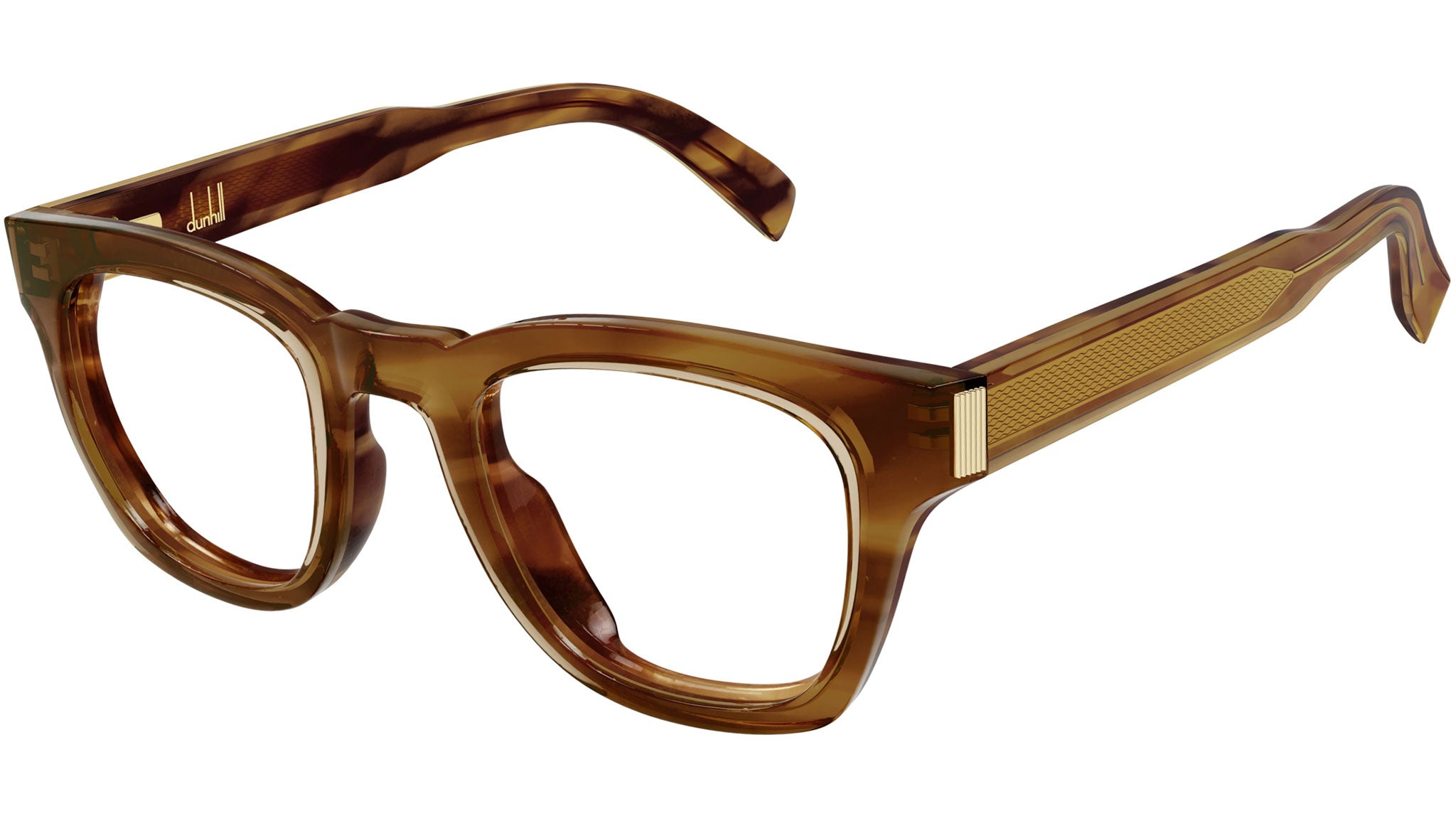 Occhiali da vista Dunhill modello DU0081O linea Eyewear forma rettangolare in acetato riciclato, codice colore 003 giallo trasparente / avana marrone flamed con aste color tartaruga e lenti demo.