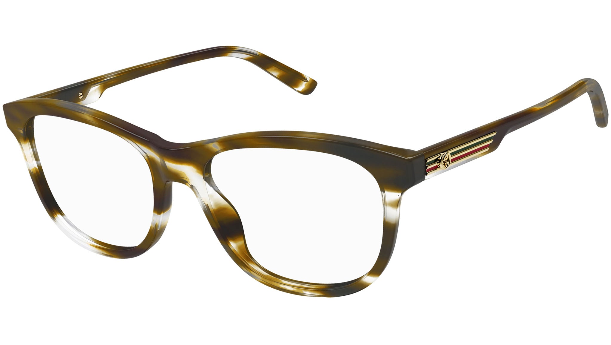Occhiali da vista linea Gucci Logo modello GG1292O variante colore 003 avana striato verde lucido con astine color tartaruga.