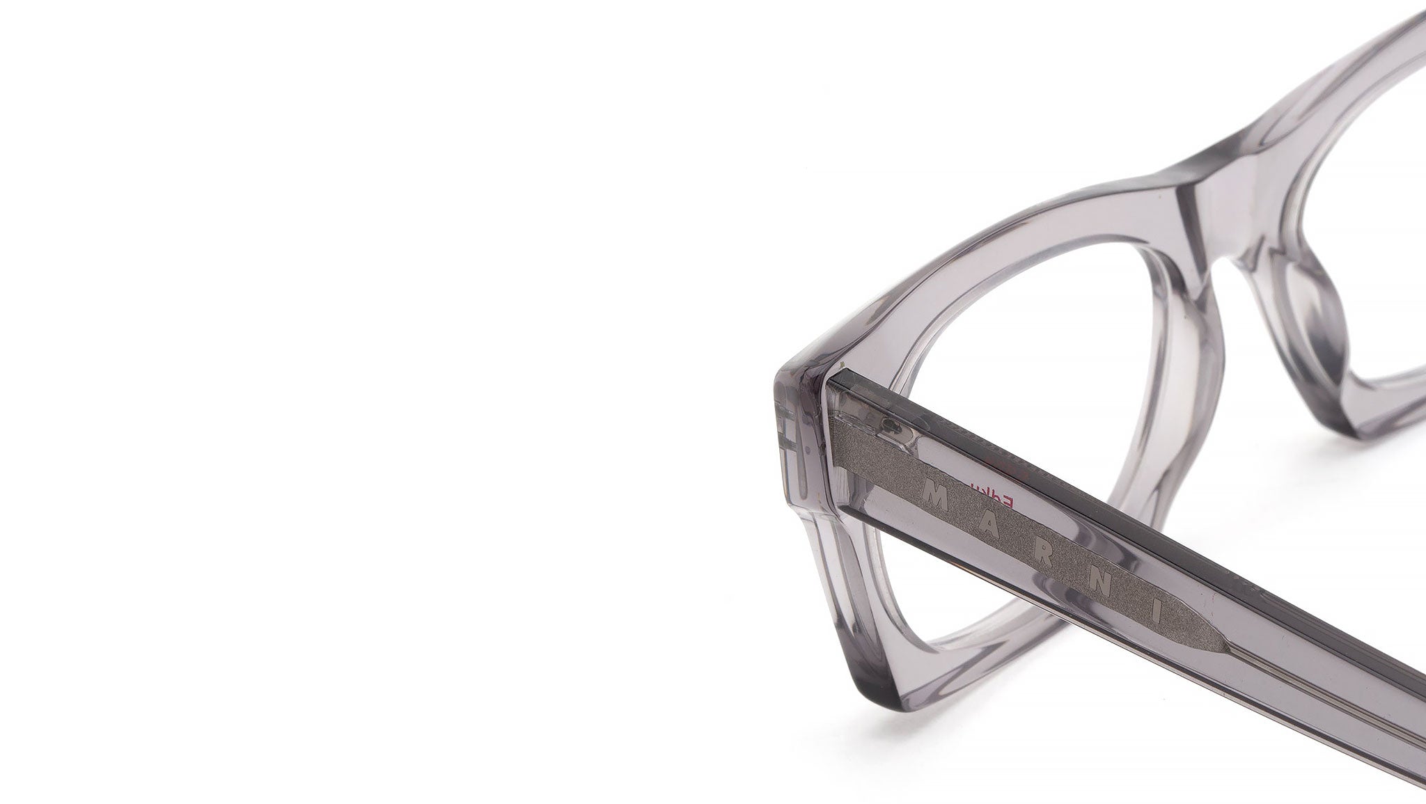 Designed exclusively for Marni, Edku is a sharp and angular silhouette characterised by carefully sculpted rims. The model features geometric temples and a squared lower line, with rounded lenses softening the austere appearance of the silhouette. For this optical edition of the shape, the rims have been carved to ensure lightness and wearability in everyday use. Metal rivets on the front and a visible metal core on the temples add a sophisticated touch to this light grey tinted frame. Sizes: R Lens Width: 54 mm. Frame Front: Frame Side: 145 mm. Product Code Size R: MEC