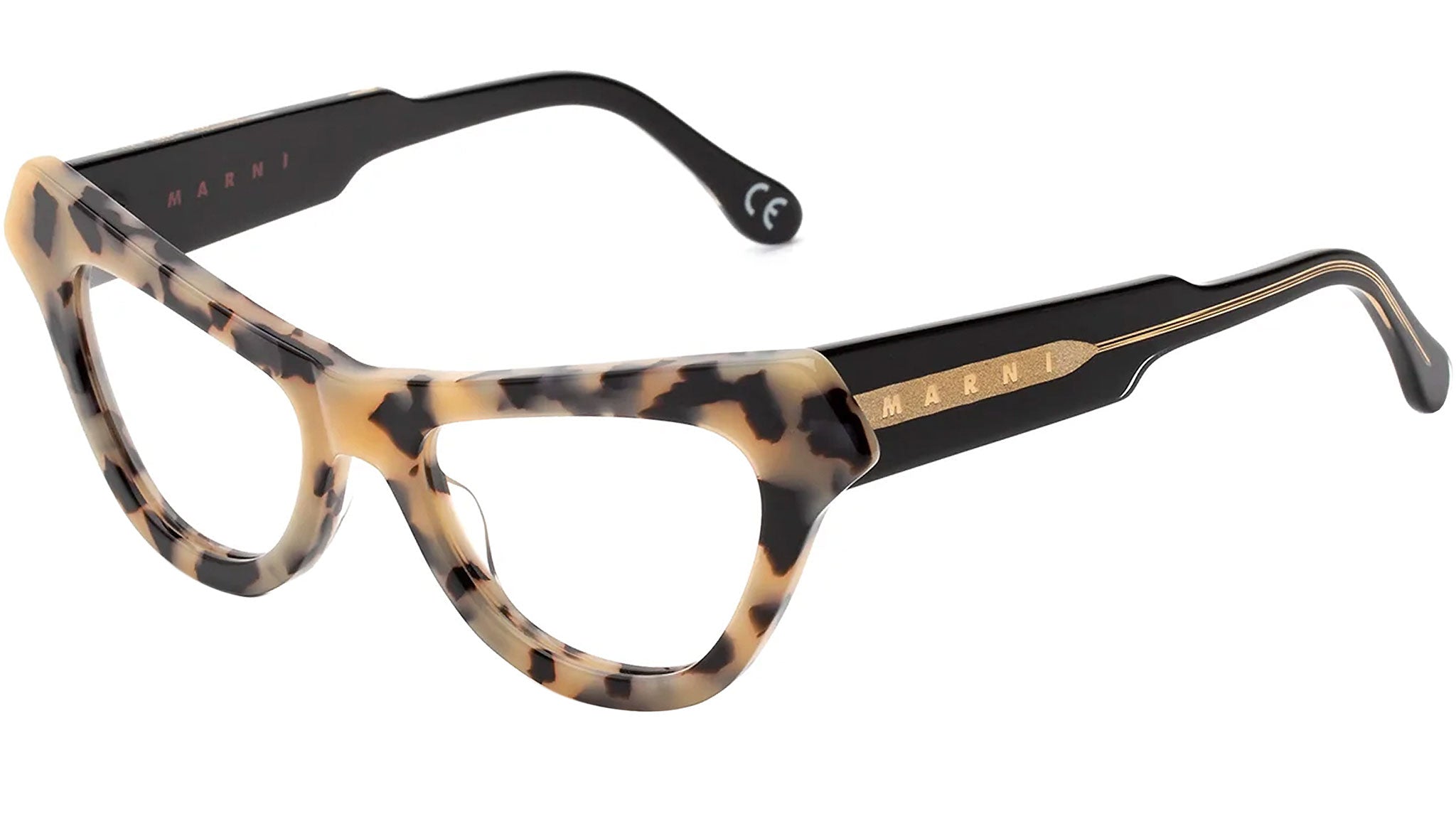 Designed exclusively for Marni, Jeju Island is a bold Optical frame characterized by a chunky acetate construction and sculpted rims. The model is a unique reinterpretation of cat-eye shapes, with triangular lenses and a pointed front. The unique v-shaped browline is matched by softly curved lenses. This version features a spotted Puma front and black temples.