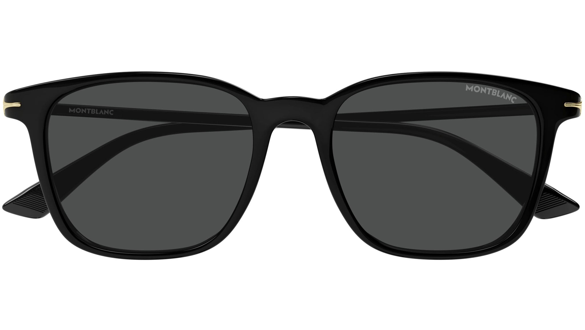 Occhiali da sole Montblanc modello MB0338S linea Nib forma rettangolare in acetato riciclato, codice colore 001 nero lucido tinta unita con aste color nero e lenti color grigio fumo tinta unita.