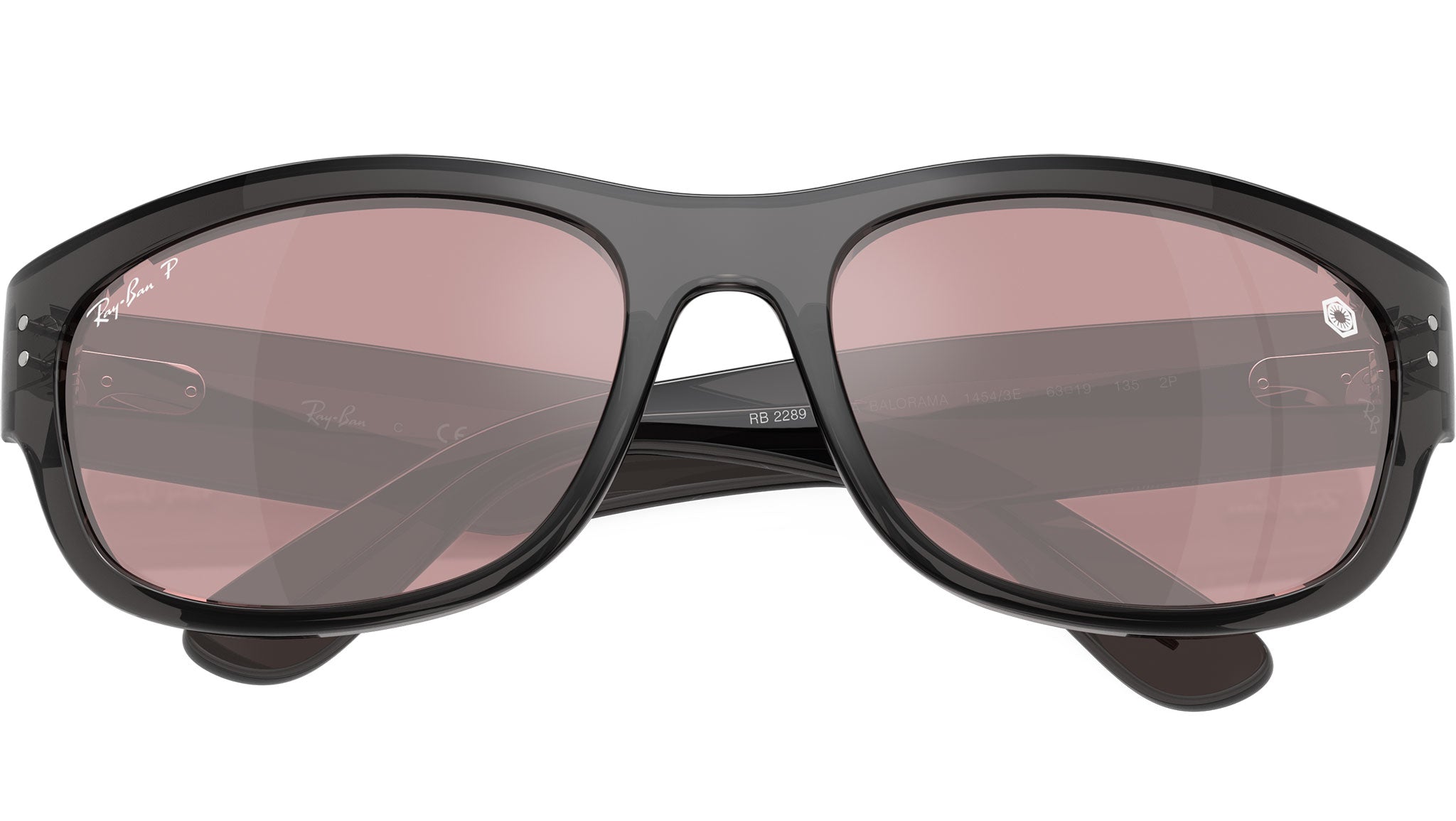 Occhiali da sole Ray-Ban Mega Balorama RB2289 14543E unisex con montatura d-frame in propionato nero trasparente e lenti in cristallo color rosa polar. Vestibilità a ponte alto. Linea: Evolution. Codice modello: 0RB2289. Codice colore: 14543E. Rivenditore autorizzato Ray-Ban online. Gli occhiali vengono consegnati con custodia e accessori originali e sono coperti dalla garanzia ufficiale di 12 mesi del produttore.