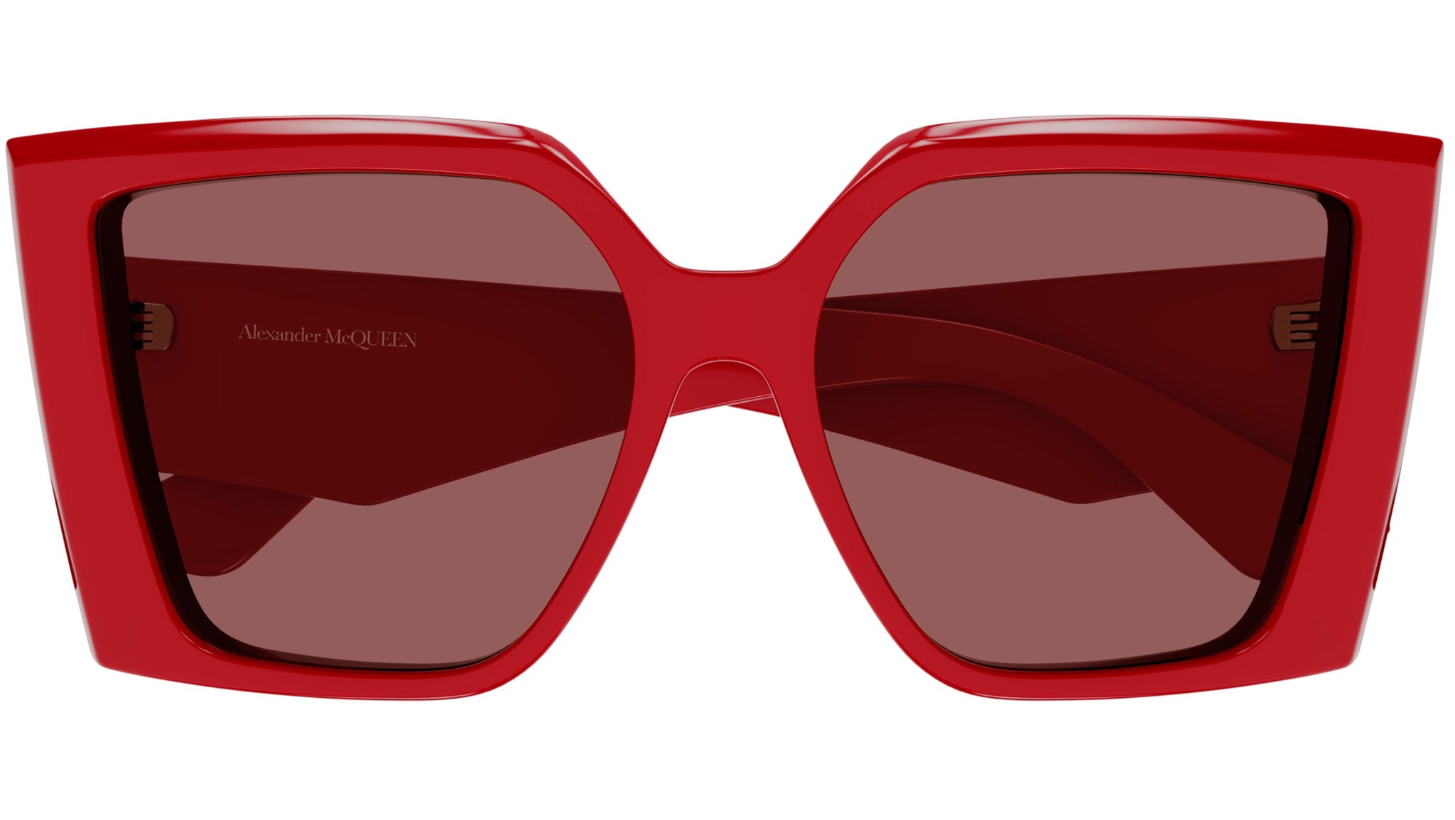 Occhiali da sole Alexander McQueen Casual Lines modello AM0467S in acetato riciclato rettangolare, codice colore 003 rosso tinta unita lucido con aste rosso e lenti color marrone caldo tinta unita. Rivenditore autorizzato Alexander McQueen online. Gli occhiali vengono consegnati con custodia e accessori originali e sono coperti dalla garanzia ufficiale di 12 mesi del produttore.