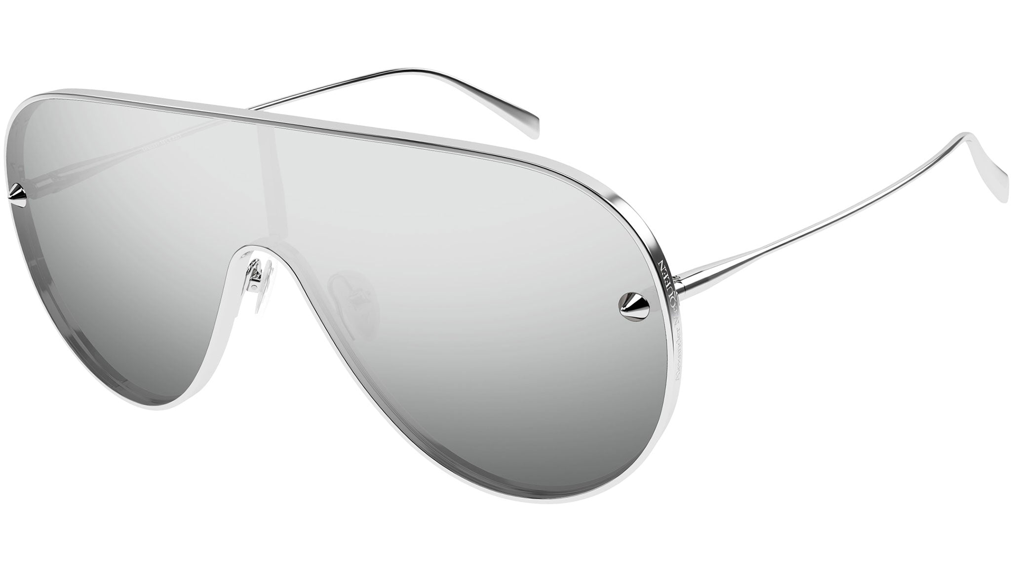 Occhiali da sole Alexander McQueen Icons modello AM0481S in metallo aviatore, codice colore 004 argento lucido con aste argento e lenti color grigio solido con mask argento a specchio. Rivenditore autorizzato Alexander McQueen online. Gli occhiali vengono consegnati con custodia e accessori originali e sono coperti dalla garanzia ufficiale di 12 mesi del produttore.
