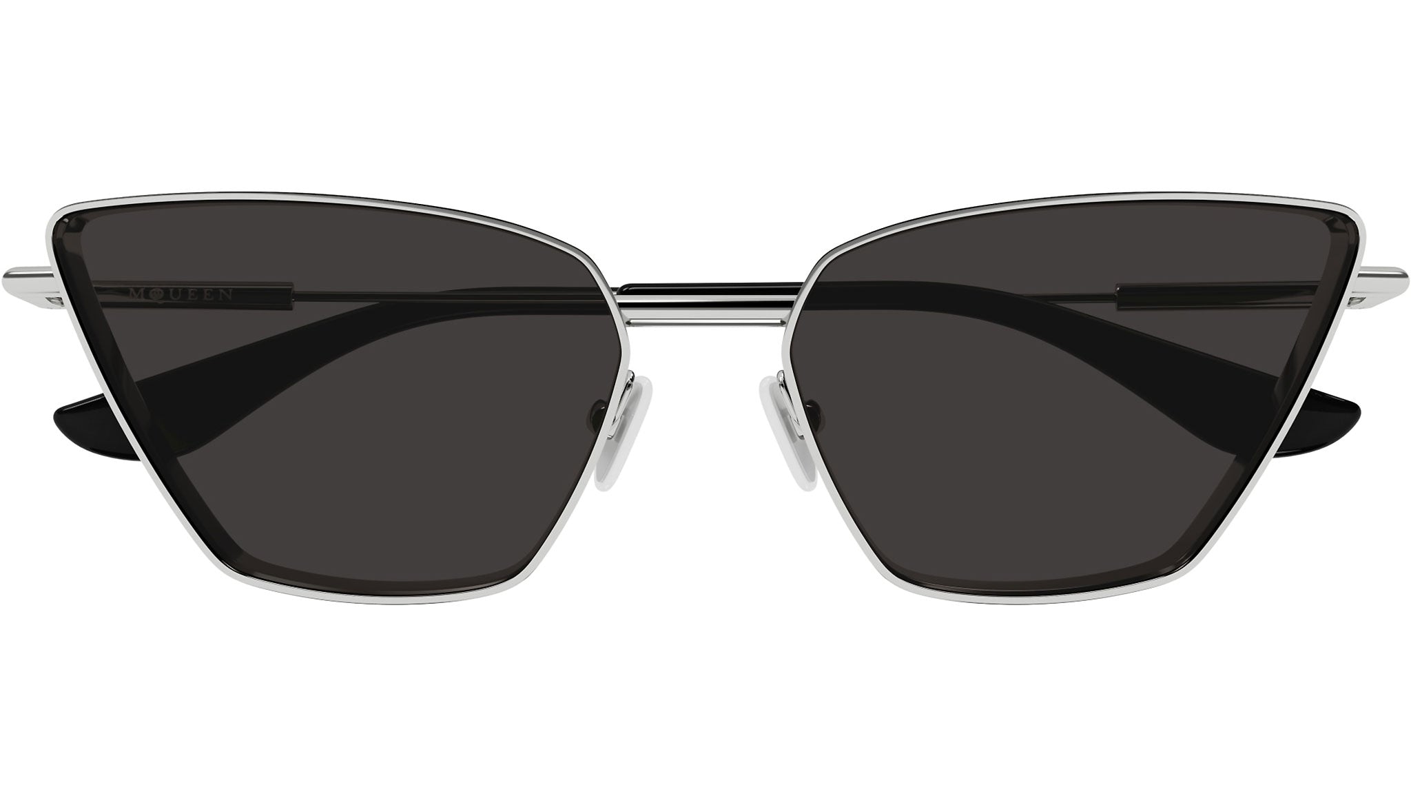 Occhiali da sole Alexander McQueen T-Bar modello AM0501S in metallo cat eye codice colore 001 argento lucido con aste argento e lenti color grigio tinta unita. Rivenditore autorizzato Alexander McQueen online. Gli occhiali vengono consegnati con custodia e accessori originali e sono coperti dalla garanzia ufficiale di 12 mesi del produttore.