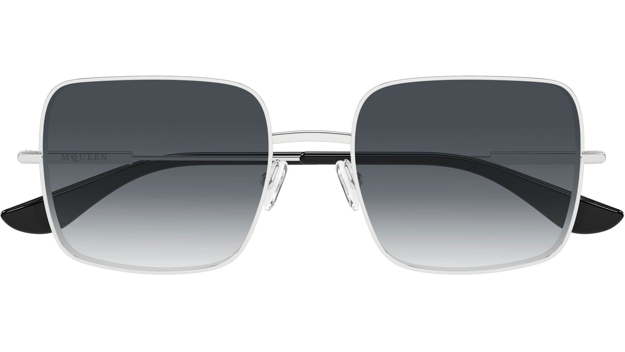 Occhiali da sole Alexander McQueen AM0564S 001 donna con montatura rettangolare in metallo argento lucido e lenti grigio fumo sfumato. Linea: T-Bar. Codice modello: AM0564S. Codice colore: 001. Made in Italy. Rivenditore autorizzato Alexander McQueen online. Gli occhiali vengono consegnati con custodia e accessori originali e sono coperti dalla garanzia ufficiale di 12 mesi del produttore.
