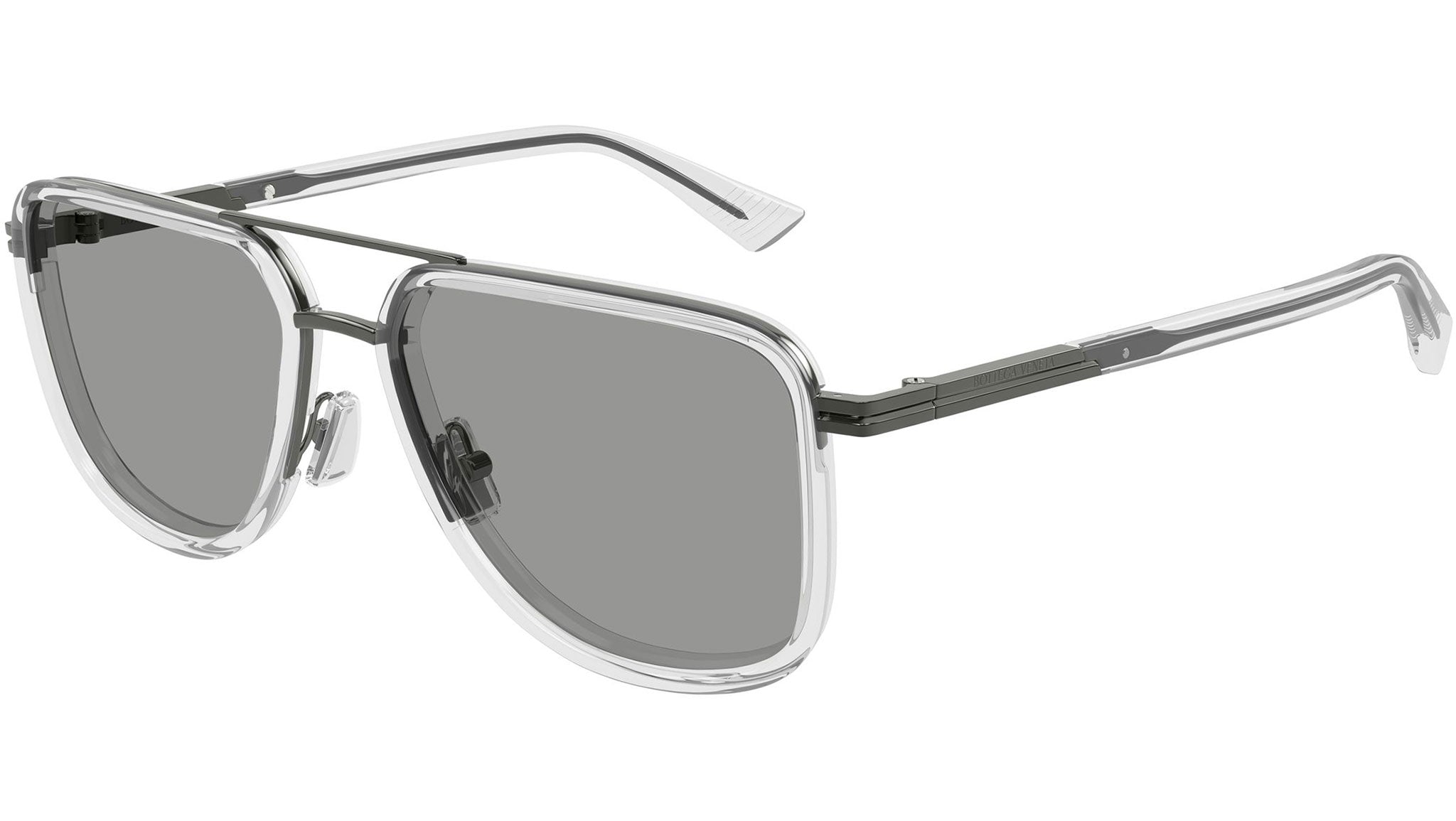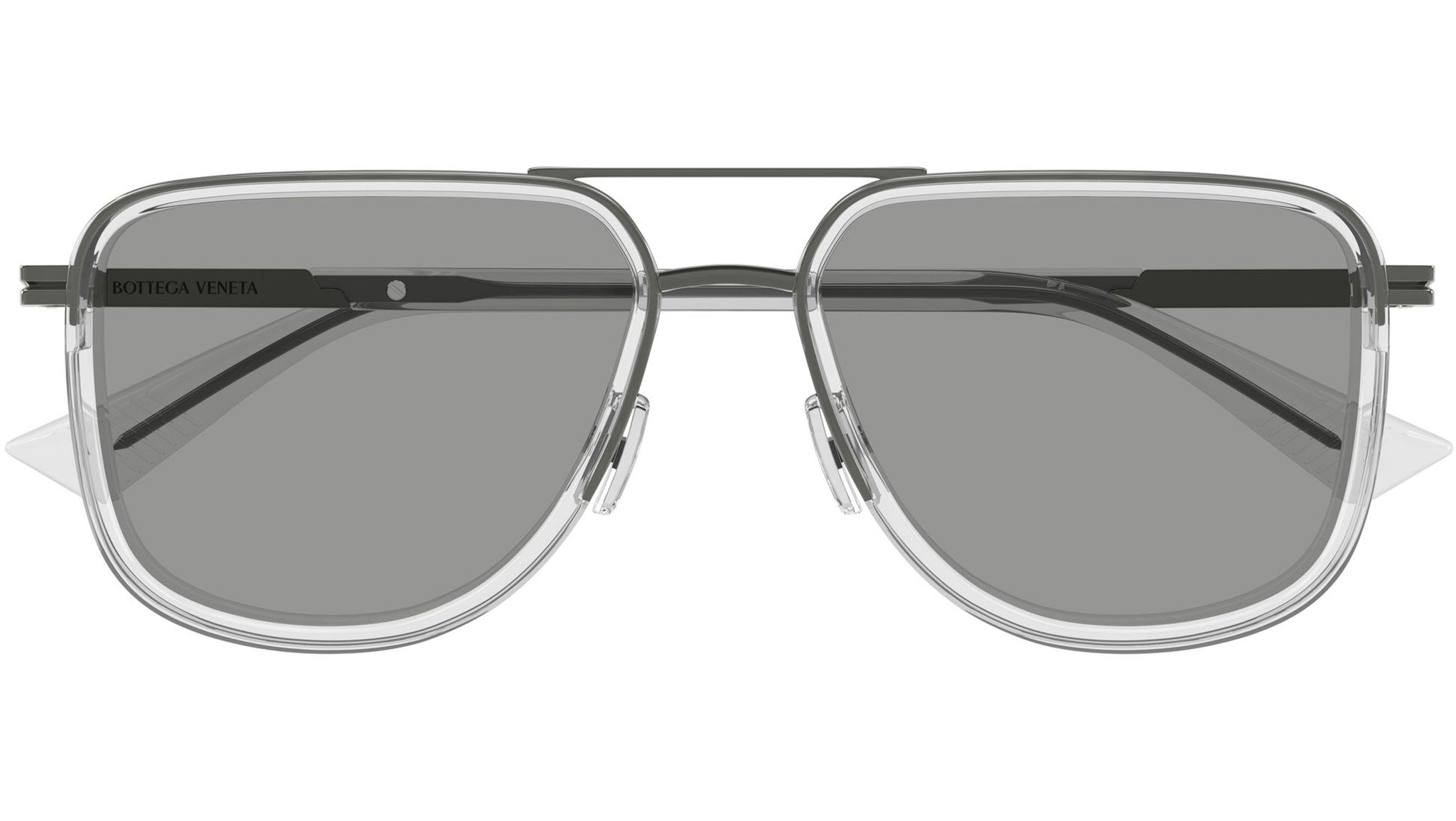 Occhiali da sole Bottega Veneta BV1463S 004 uomo con montatura aviatore in metallo cristallo trasparente lucido con cerchi in rutenio scuro lucidi e lenti grigio chiaro tinta unita. Linea: Ribbon. Codice modello: BV1463S. Codice colore: 004. Made in Italy. Rivenditore autorizzato Bottega Veneta online. Gli occhiali vengono consegnati con custodia e accessori originali e sono coperti dalla garanzia ufficiale di 12 mesi del produttore.