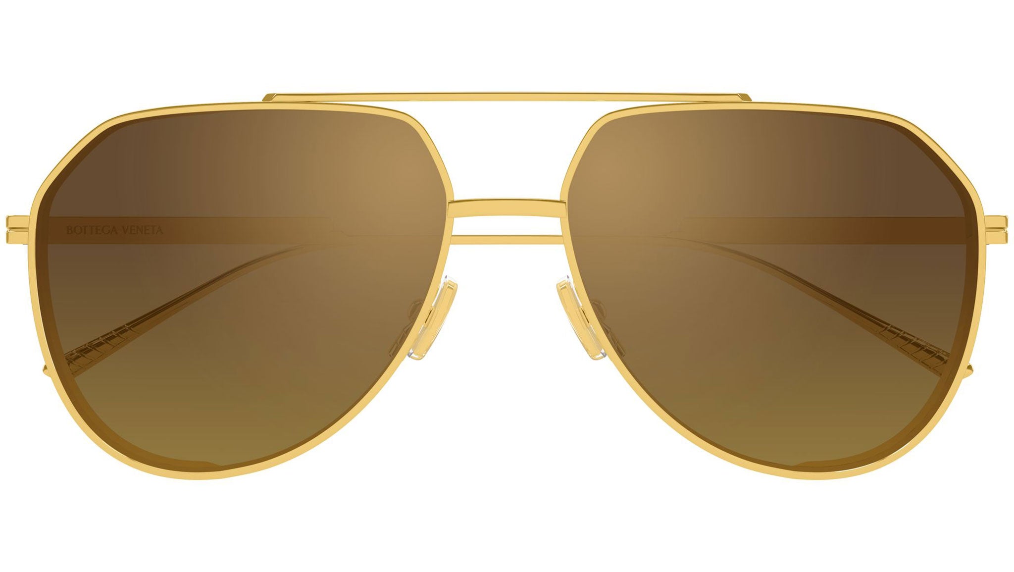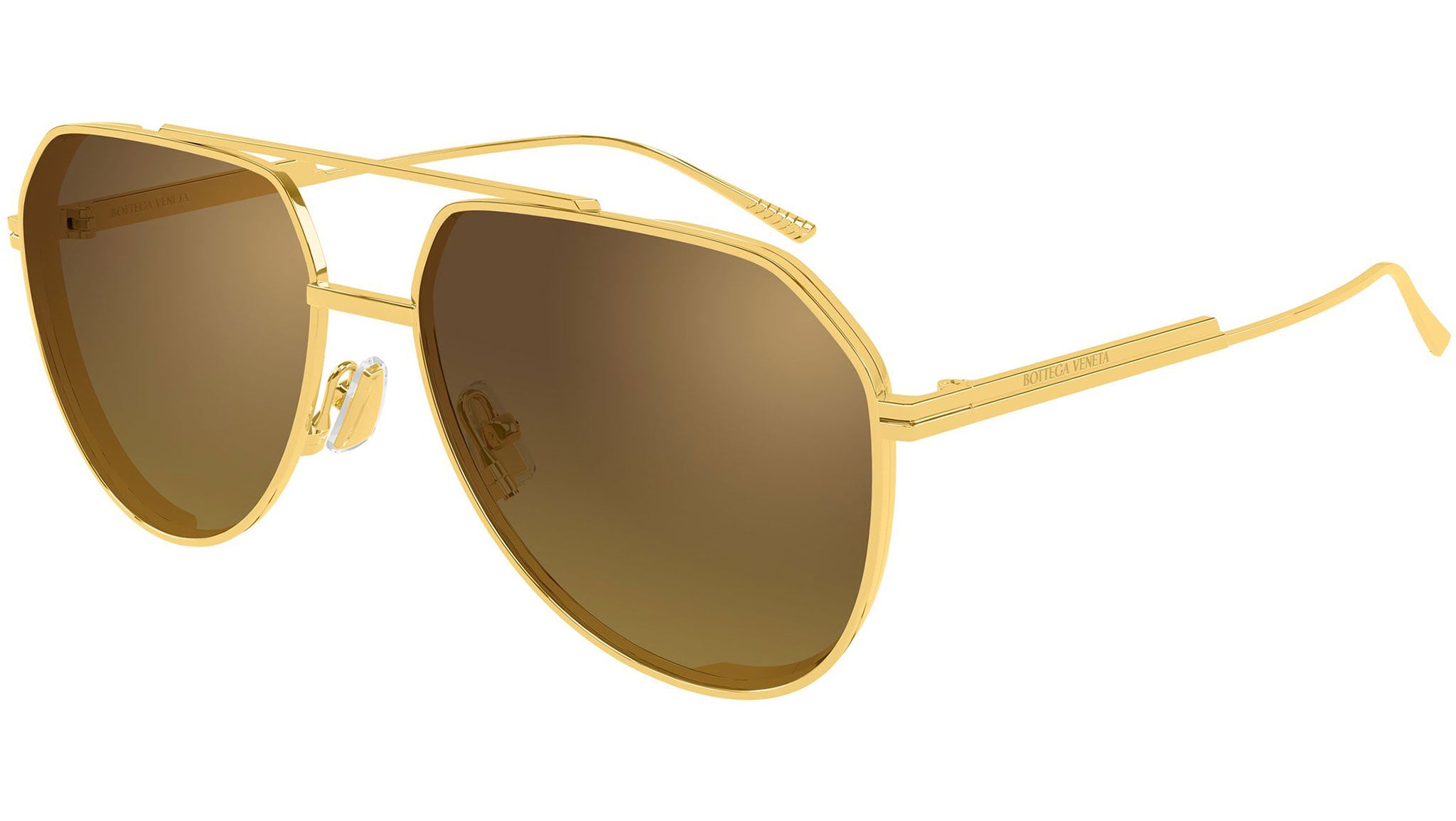 Occhiali da sole Bottega Veneta BV1465S 004 unisex con montatura aviatore in metallo oro lucido e lenti marrone doppio sfumato a giallo + flash elettrico sul retro. Linea: Ribbon. Codice modello: BV1465S. Codice colore: 004. Made in Italy. Rivenditore autorizzato Bottega Veneta online. Gli occhiali vengono consegnati con custodia e accessori originali e sono coperti dalla garanzia ufficiale di 12 mesi del produttore.