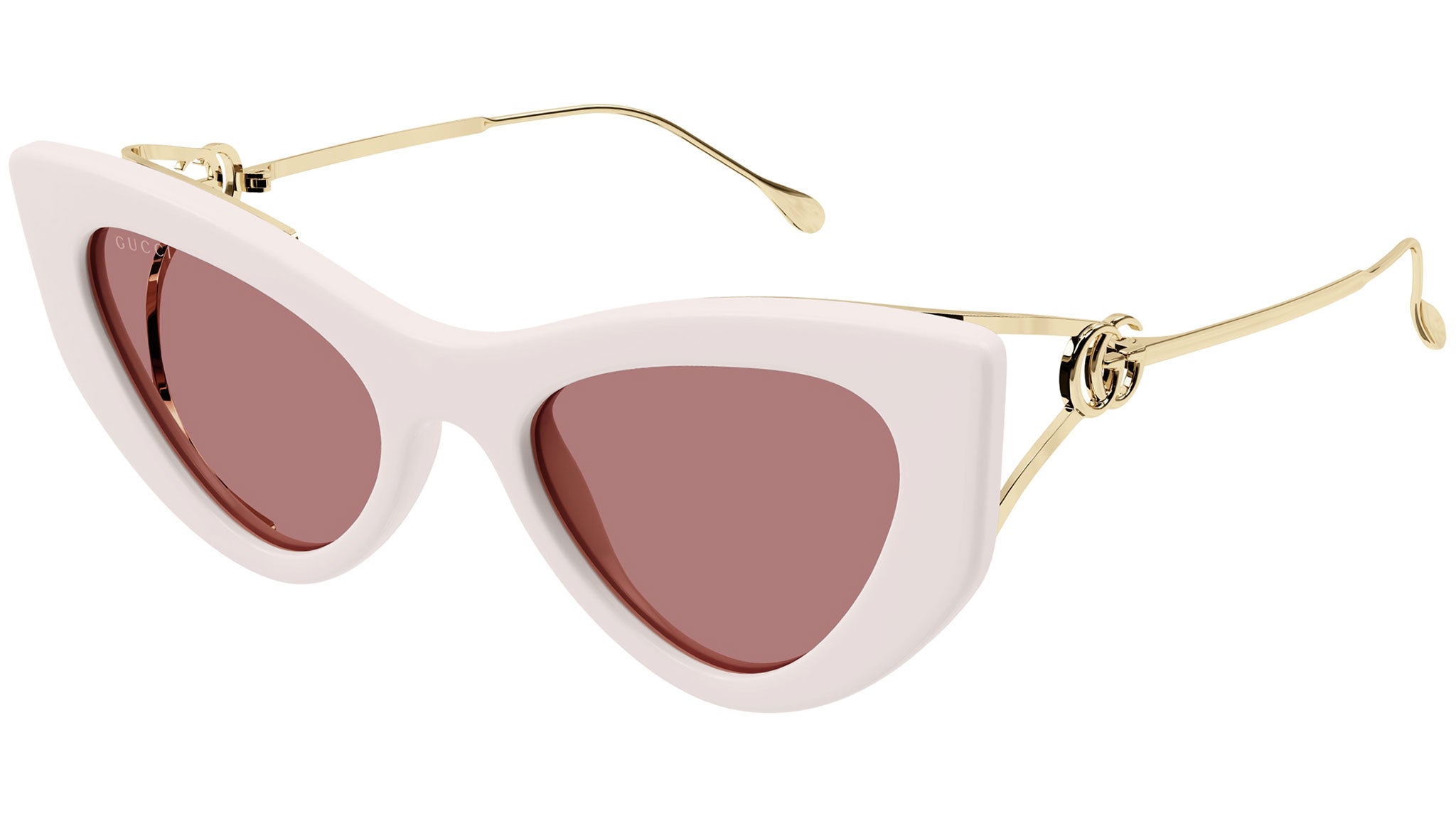 Occhiali da sole Gucci linea Fork modello GG1565S cat eye in iniettato codice colore 003 avorio lucido con aste oro e lenti color rosso tinta unita.