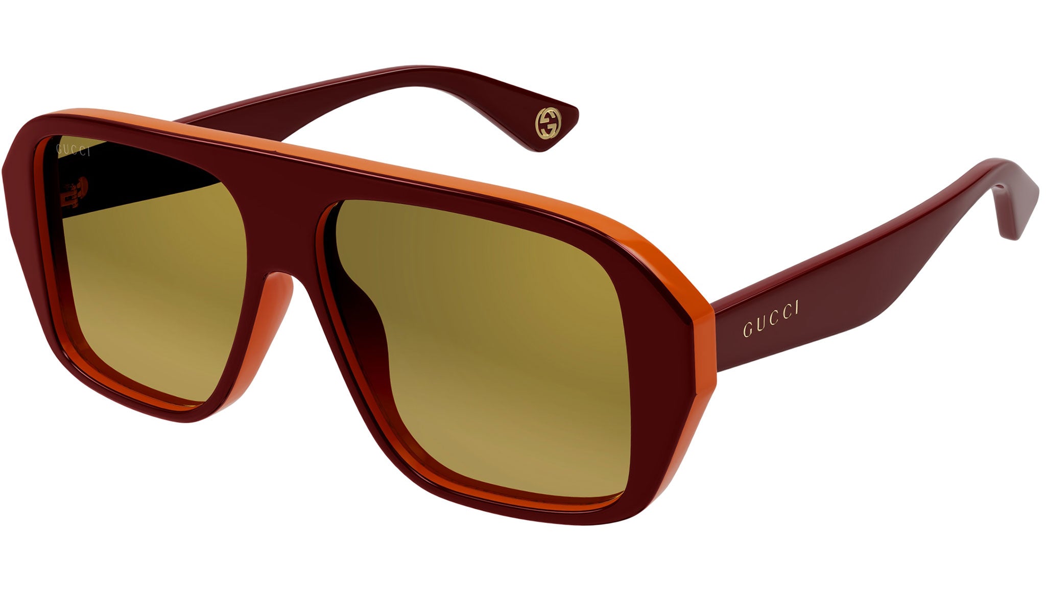 Occhiali da sole Gucci linea Lettering modello GG1615S aviatore in acetato riciclato codice colore 003 bilayer solido rosso / arancione con aste rosso e lenti color ocra solido + oro sfumato a specchio.