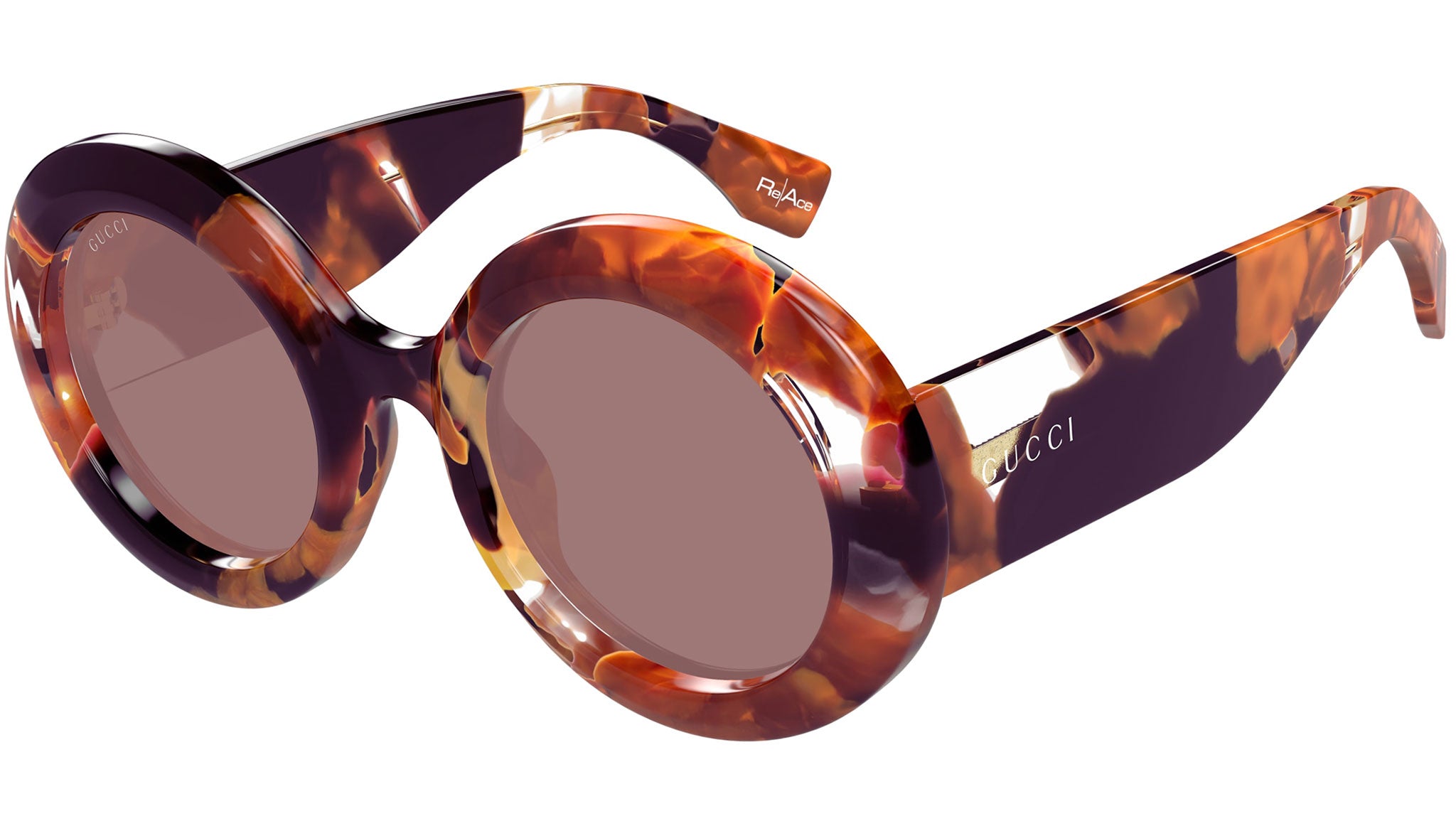 Occhiali da sole Gucci modello GG1748S linea Lettering in acetato riciclato forma pantos codice colore 002 arancio perlato lucido e marrone avana con aste arancione e lenti lilla tinta unita. Rivenditore autorizzato Gucci online. Gli occhiali vengono consegnati con custodia e accessori originali e sono coperti dalla garanzia ufficiale di 12 mesi del produttore.