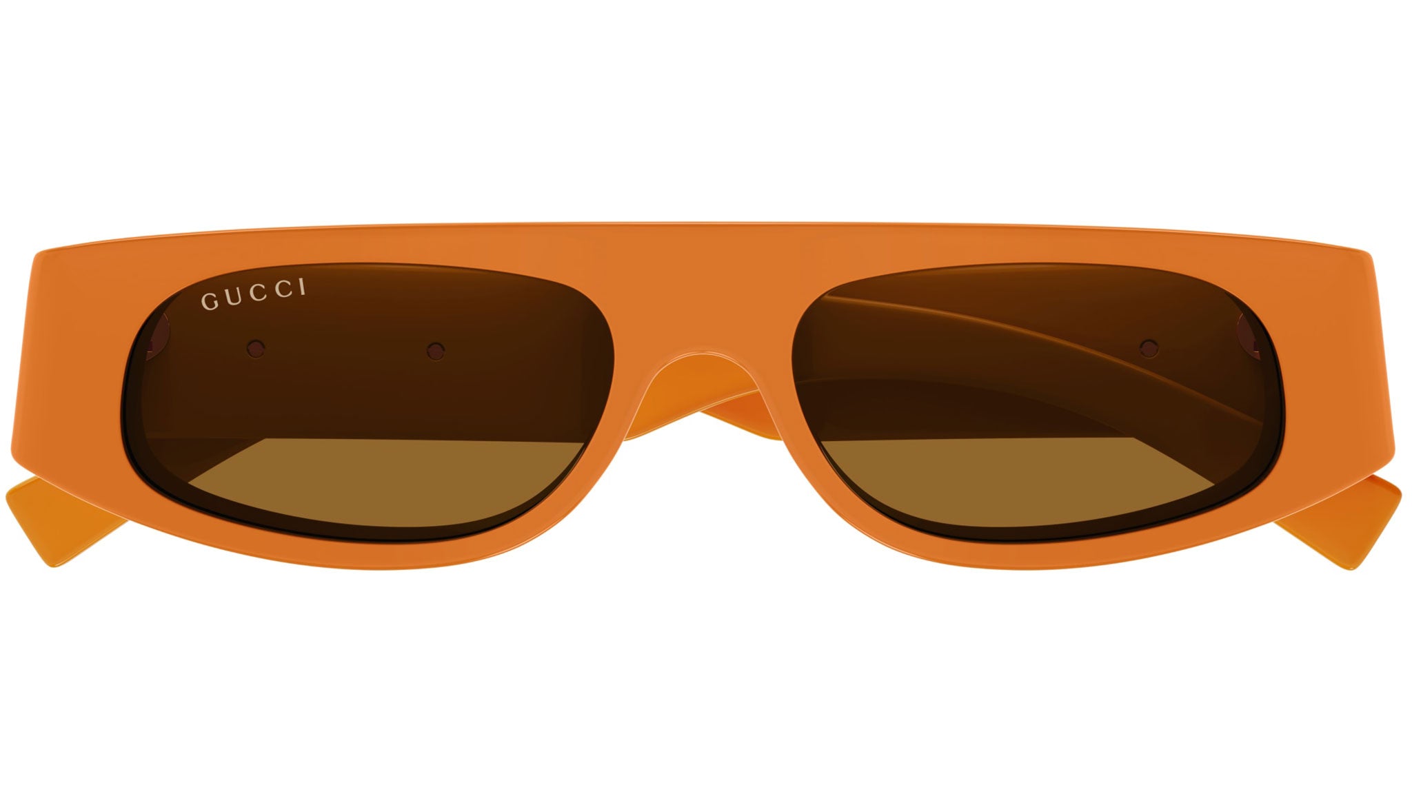 Occhiali da sole Gucci linea modello GG1771S geometrici in acetato riciclato codice colore 007 arancione solido lucido con aste arancione e lenti color marrone ruggine solido.