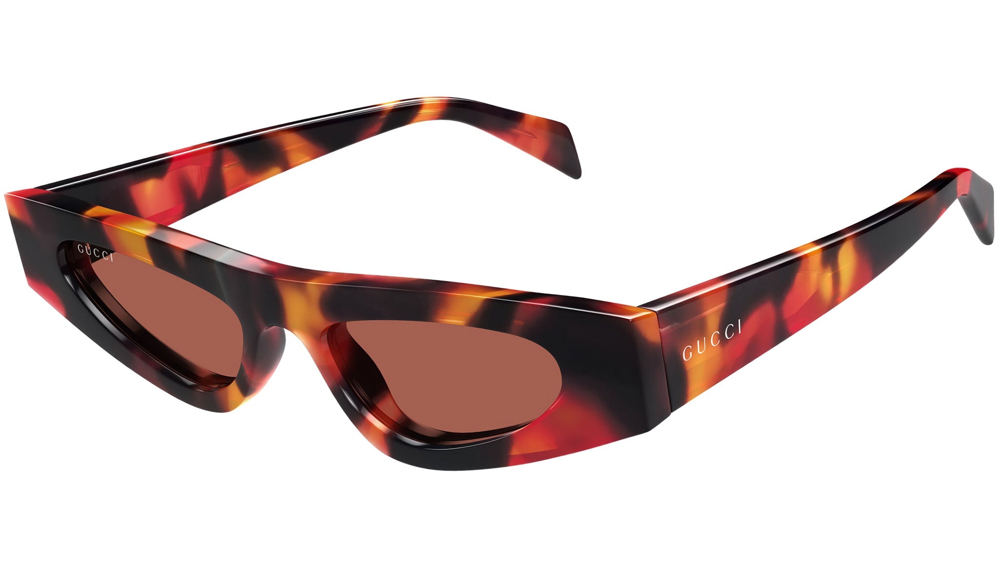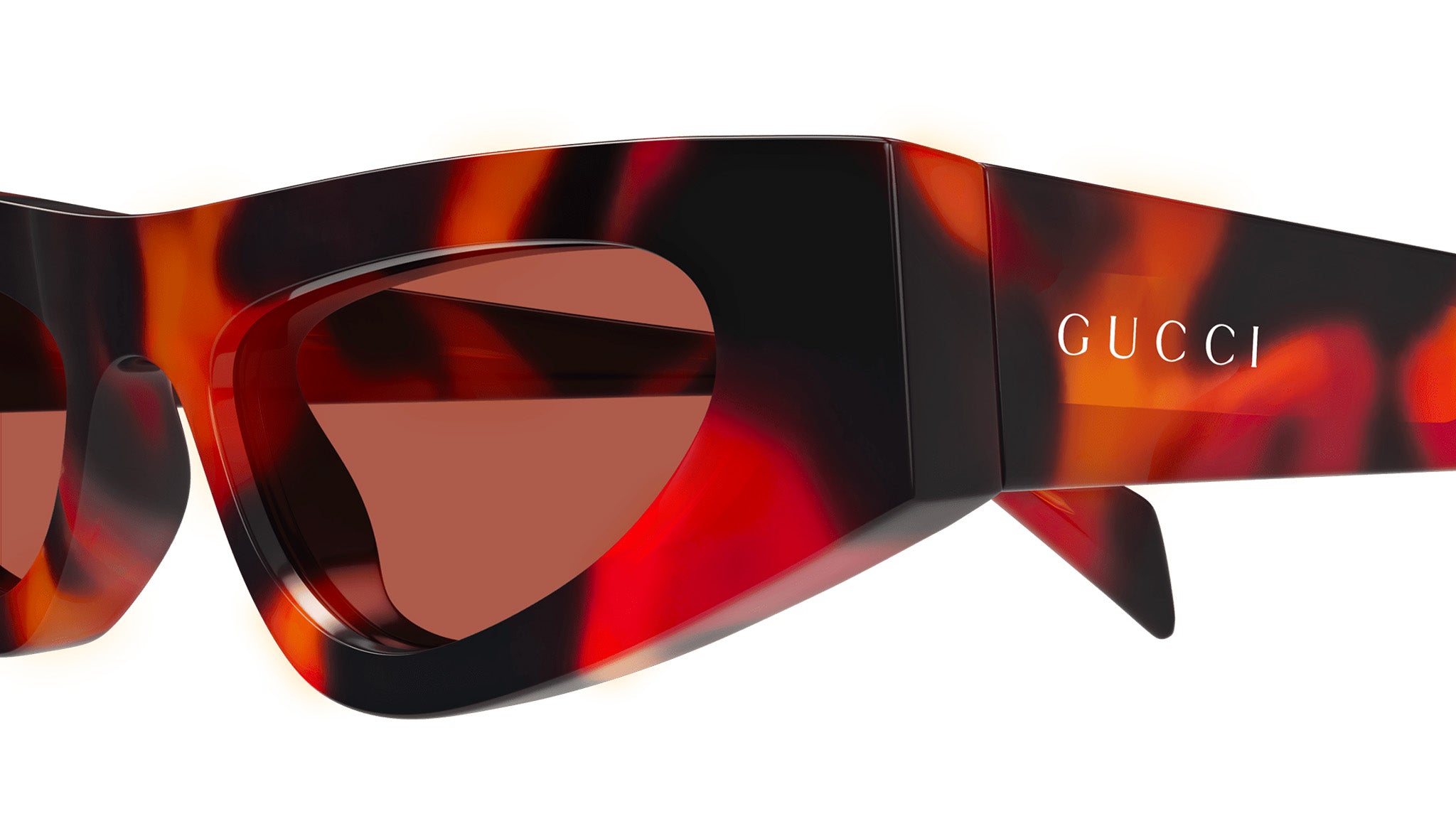 Occhiali da sole Gucci modello GG1779S linea Fashion in acetato riciclato forma a gatto codice colore 005 avana rossastro lucido con aste tartaruga e lenti marrone caldo tinta unita. Rivenditore autorizzato Gucci online. Gli occhiali vengono consegnati con custodia e accessori originali e sono coperti dalla garanzia ufficiale di 12 mesi del produttore.