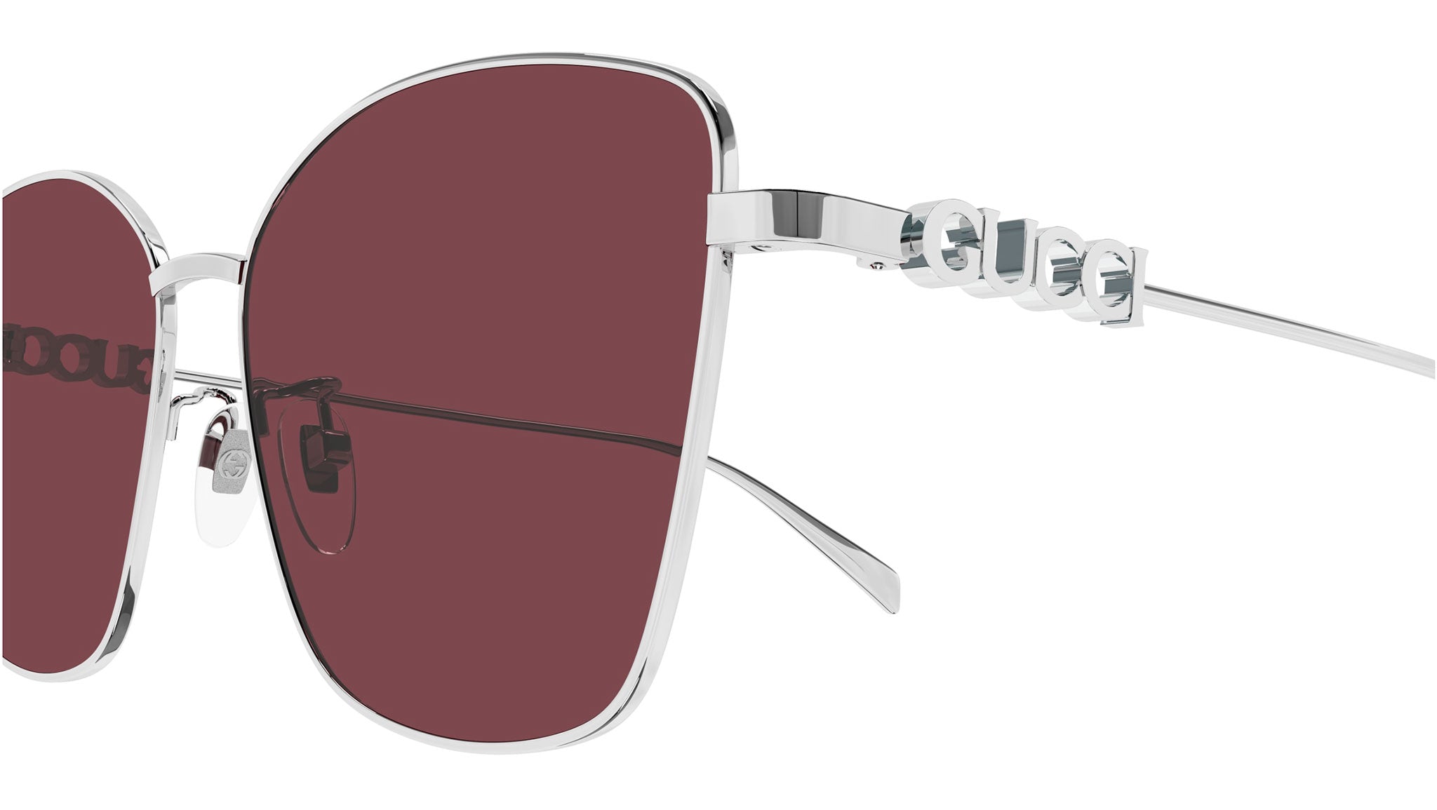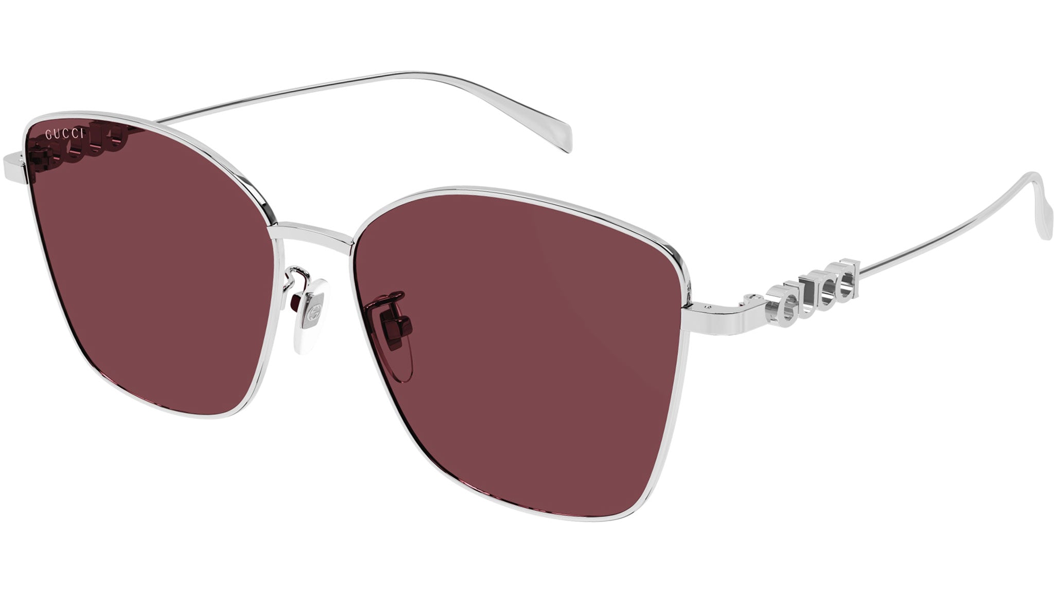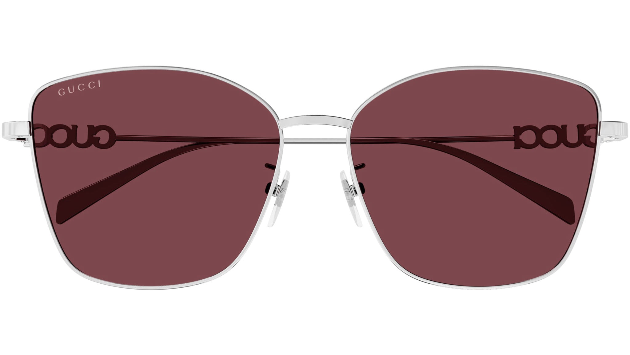 Occhiali da sole Gucci GG1805SA 004 donna con montatura butterfly in metallo argento e lenti borgogna tinta unita. Linea: Lettering. Codice modello: GG1805SA. Codice colore: 004. Made in Japan. Rivenditore autorizzato Gucci online. Gli occhiali vengono consegnati con custodia e accessori originali e sono coperti dalla garanzia ufficiale di 12 mesi del produttore.