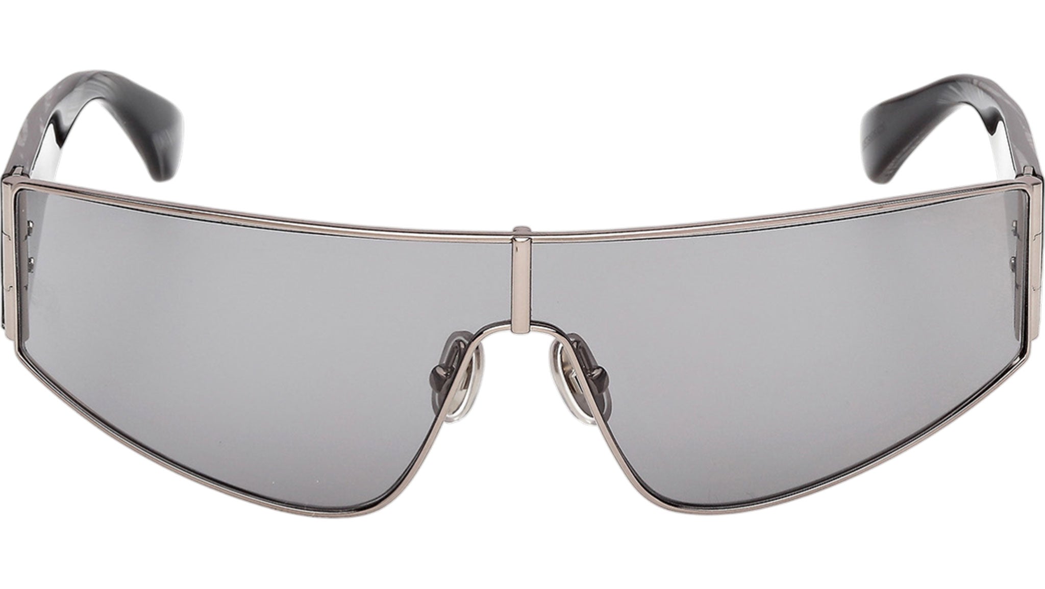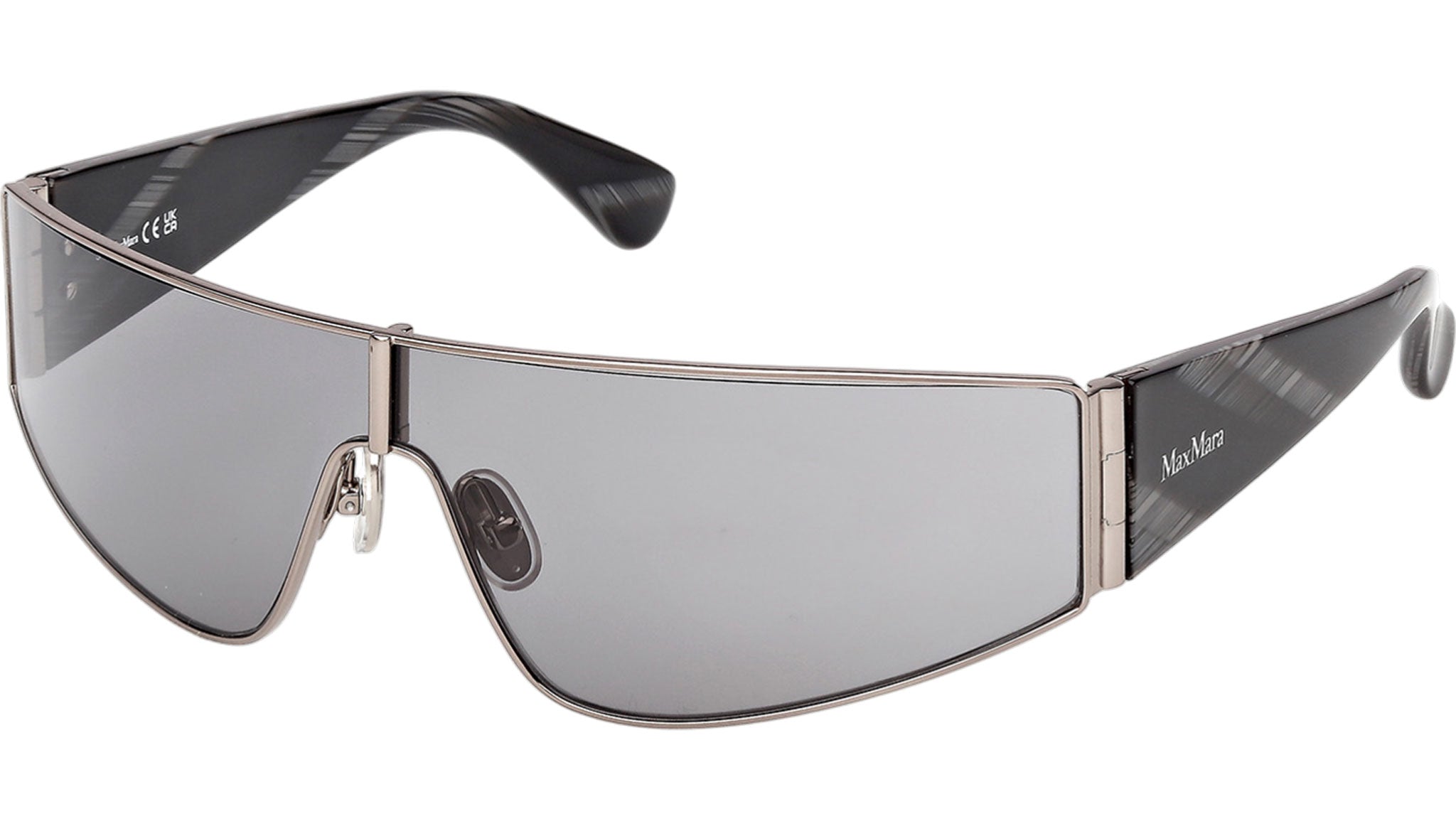 Occhiali da sole Max Mara donna modello Space MM0164 con montatura mascherina full-rim in metallo rutenio chiaro lucido e lenti color grigio fumo. Made in Italy. Codice Brand: MM 0164. Codice colore: 14A. Rivenditore autorizzato Max Mara online. Gli occhiali vengono consegnati con custodia e accessori originali e sono coperti da garanzia standard di 12 mesi del produttore.