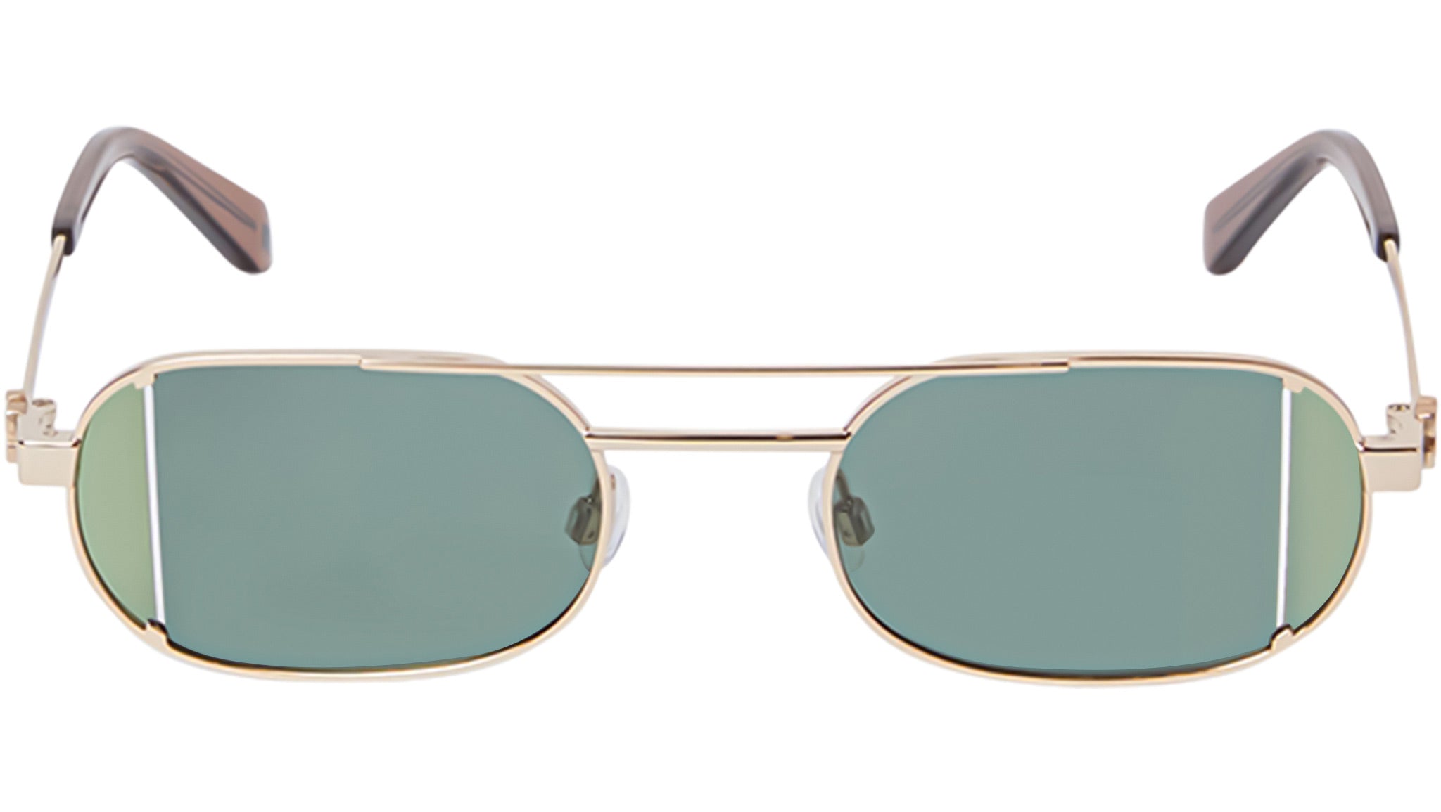 Il modello Lynn di Off-White reinterpreta in chiave moderna lo stile pilot classico, fondendo ispirazioni rétro con un’eleganza contemporanea. La silhouette sottile e allungata è arricchita da un doppio ponte in metallo e da naselli in silicone, che garantiscono una vestibilità comoda e adattabile. Ispirandosi a uno degli stili iconici del brand, il design introduce un elemento futuristico con due tagli inaspettati sulle lenti, che esaltano l’eleganza strutturata della montatura. Proposto in tre raffinate varianti cromatiche—una versione total black e due modelli con lenti bicolore nei toni del verde o del marrone—ogni combinazione è abbinata a una base oro, esprimendo un’estetica audace ma senza tempo.