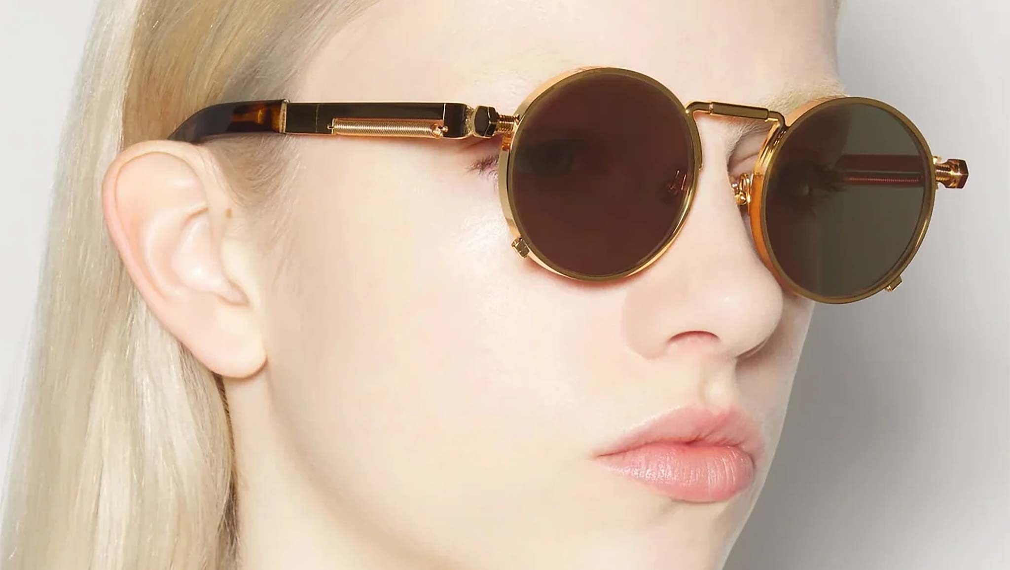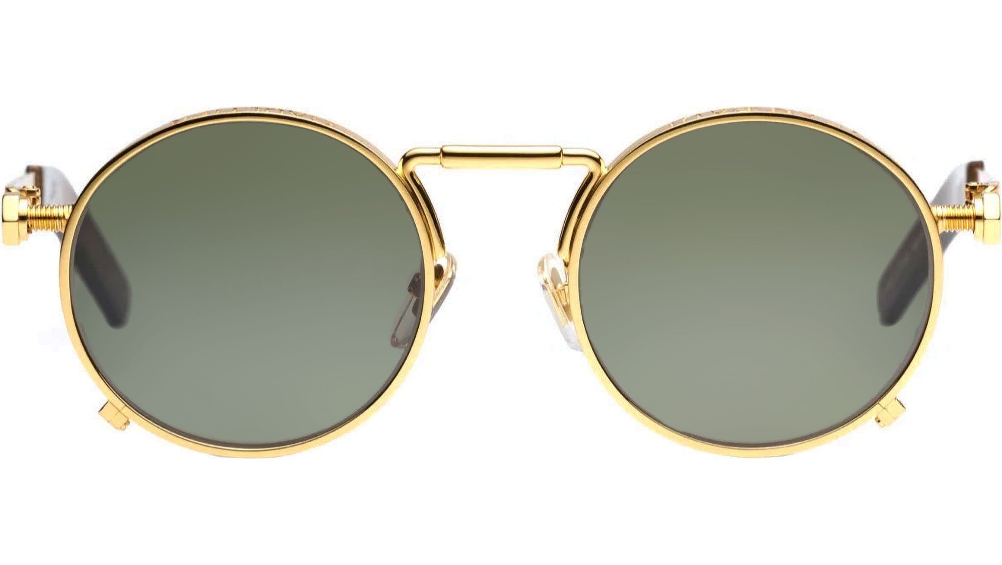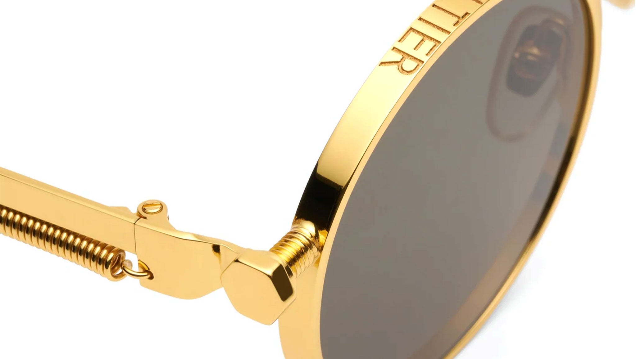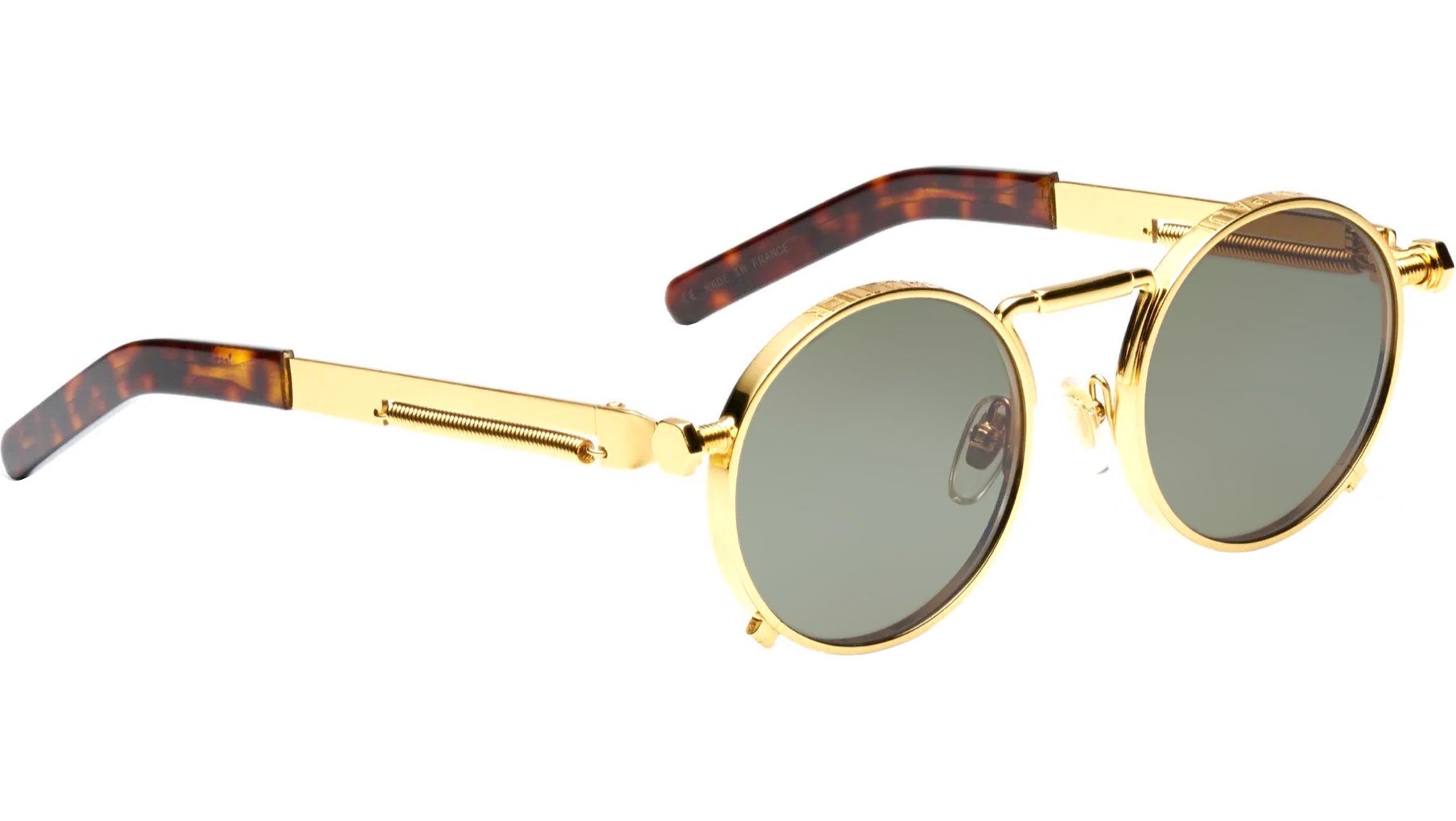 The Jean Paul Gaultier Ressort metal sunglasses showcase a refined round silhouette with gold-toned frames, distinguished by a unique spring detail along the temples that adds a touch of mechanical sophistication. Made in France, this model features high-performance lenses with Category 3 UV filters, offering reliable sun protection along with anti-glare and anti-scratch treatments for enhanced visual comfort and durability. Crafted from a combination of stainless steel, nickel silver, and acetate, the construction is elevated by premium Mazzucchelli acetate temple tips, ensuring both luxury and comfort. The discreet Jean Paul Gaultier logo completes the design with a signature of exclusivity.