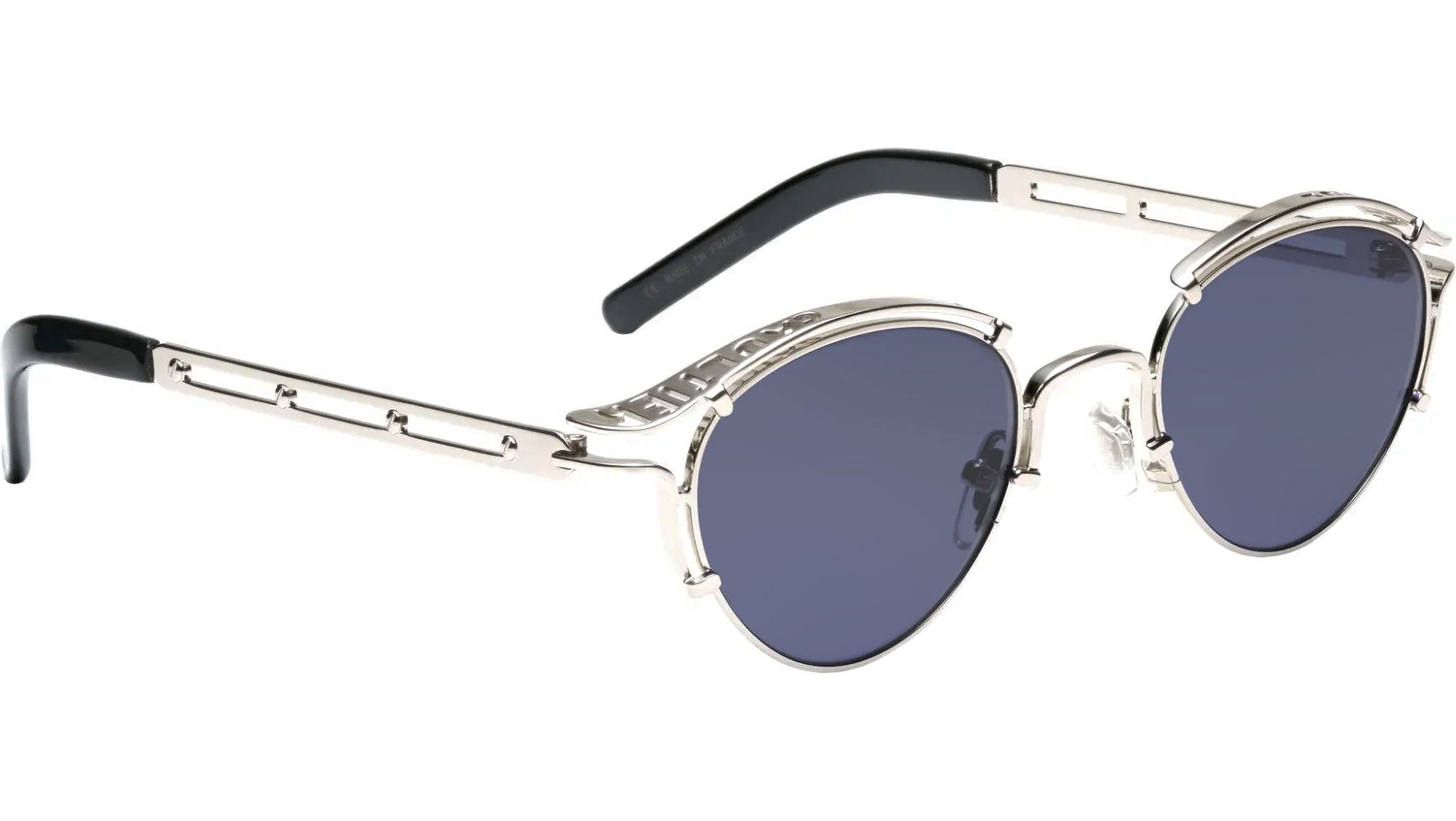 Crafted in France, the Jean Paul Gaultier Sourcil Silver sunglasses feature an elegant oval silhouette with a striking silver metal frame and a distinctive metallic brow detail that pays homage to the brand’s avant-garde heritage. The design is enhanced by blue lenses equipped with Category 3 UV filters, providing high sun protection alongside anti-glare and scratch-resistant coatings for lasting clarity. The frame is composed of stainless steel and nickel silver, complemented by premium Mazzucchelli acetate temple tips for added comfort. The Jean Paul Gaultier logo is subtly integrated into the design, underscoring its exclusivity. With a lens width of 49mm and a bridge width of 23mm, this one-size model offers a universally flattering fit.